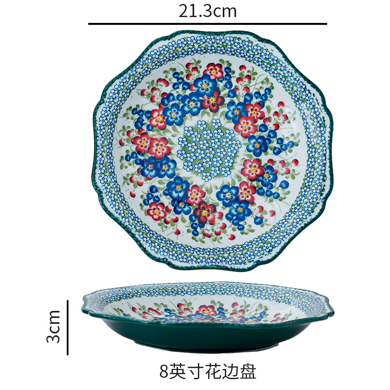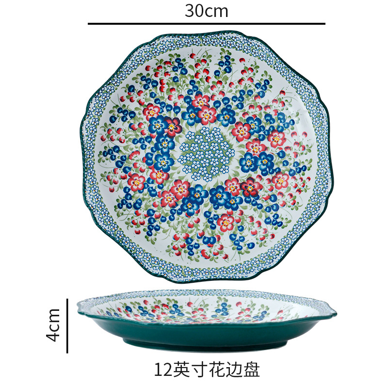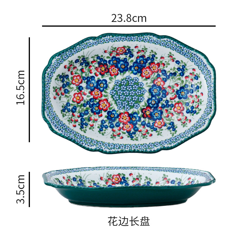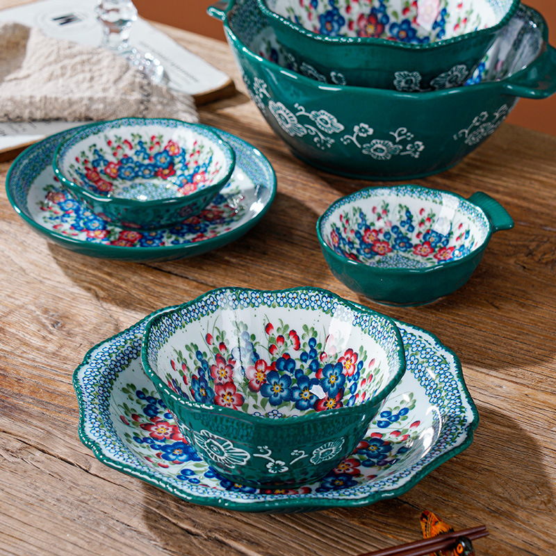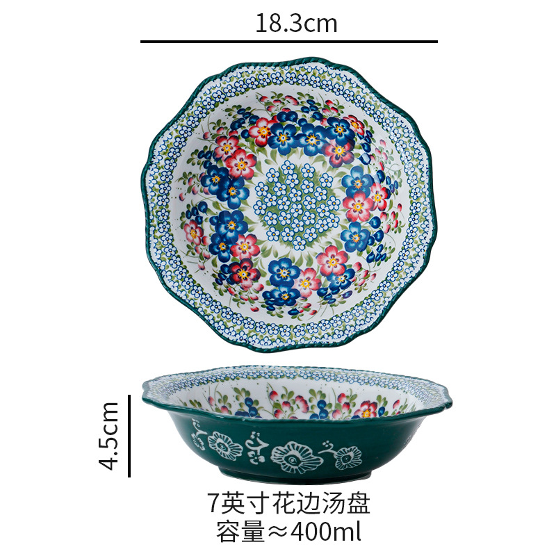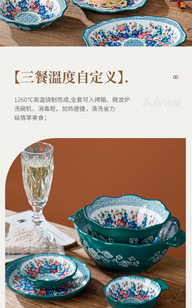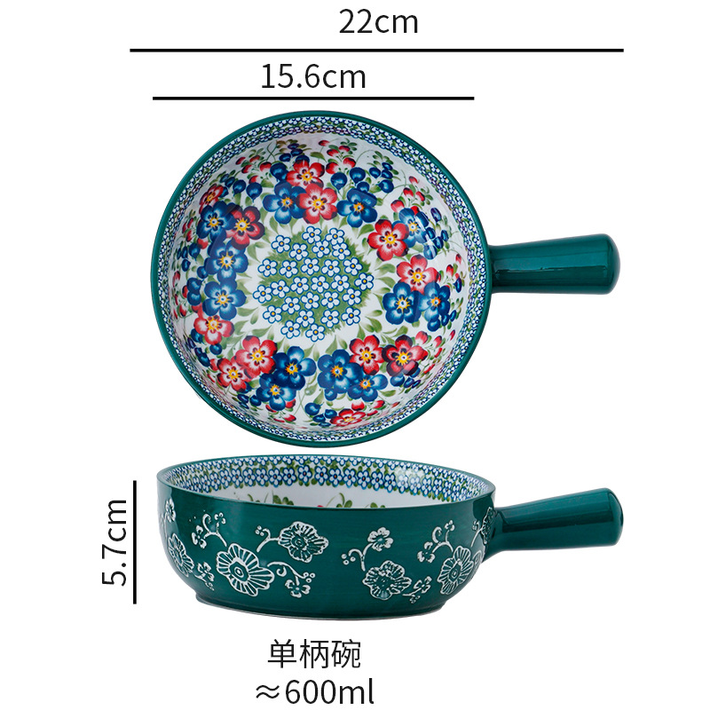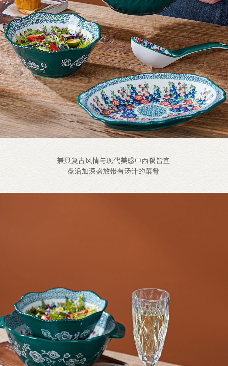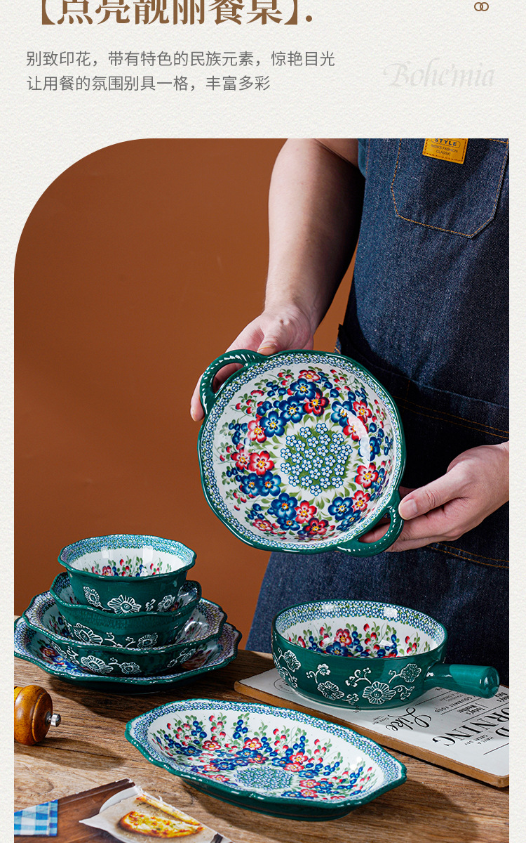 波兰彩陶瓷餐具手绘釉下彩家用菜盘双耳汤碗手柄碗双耳鱼盘饭碗汤