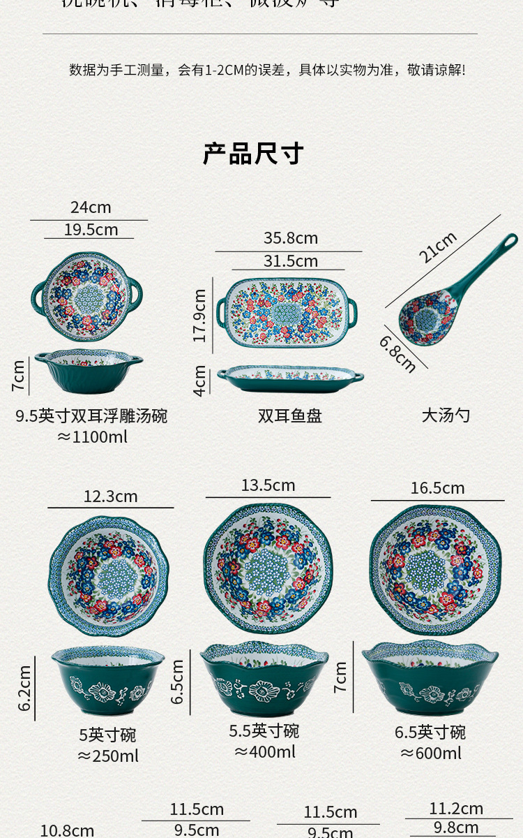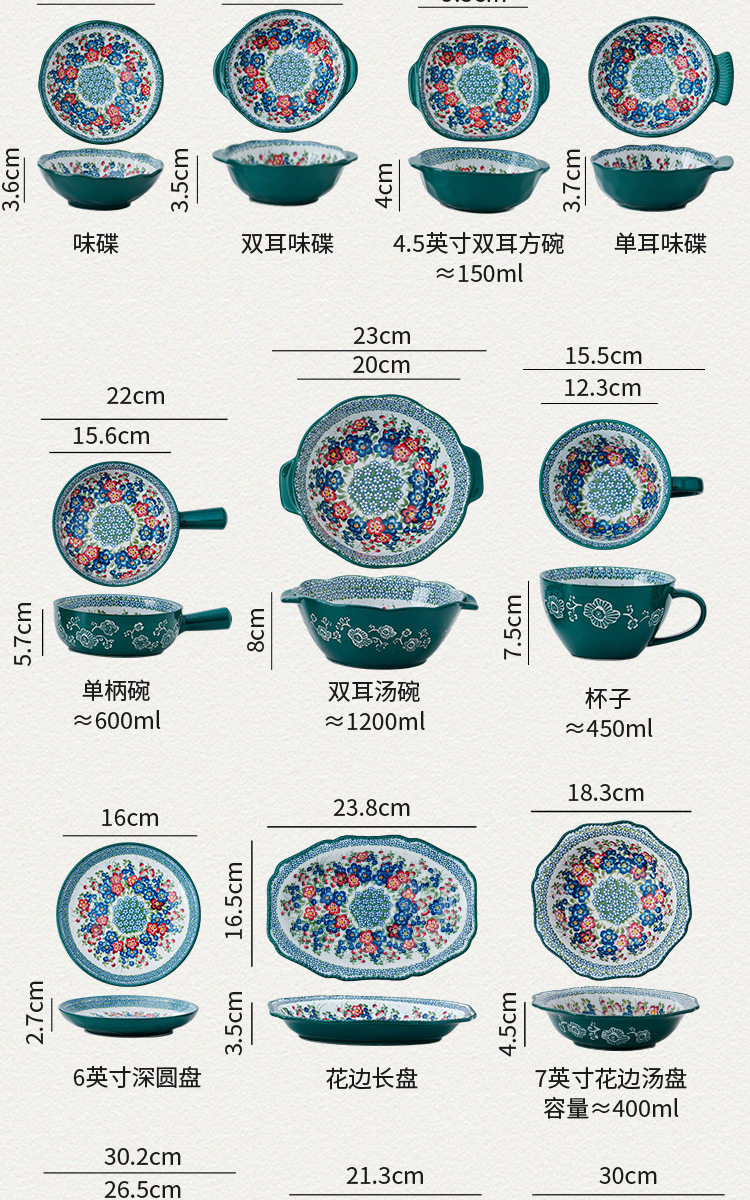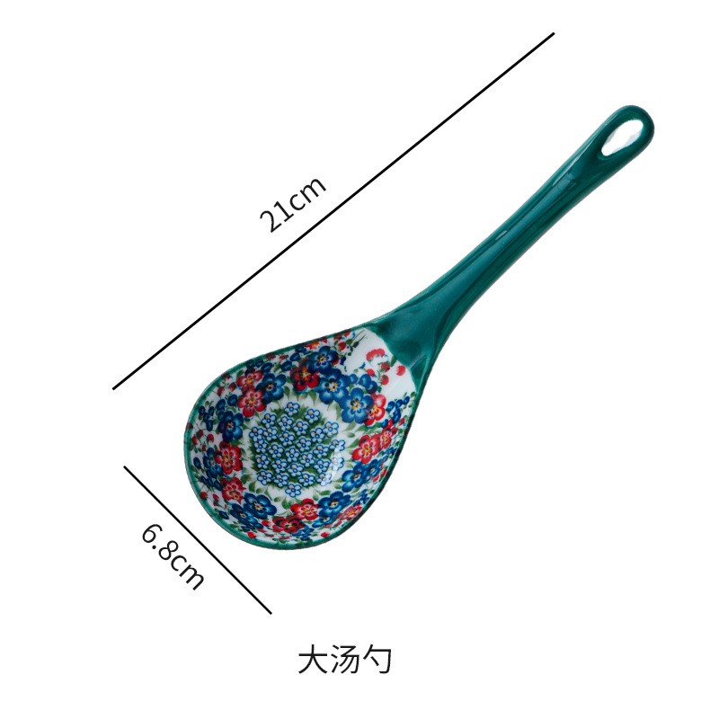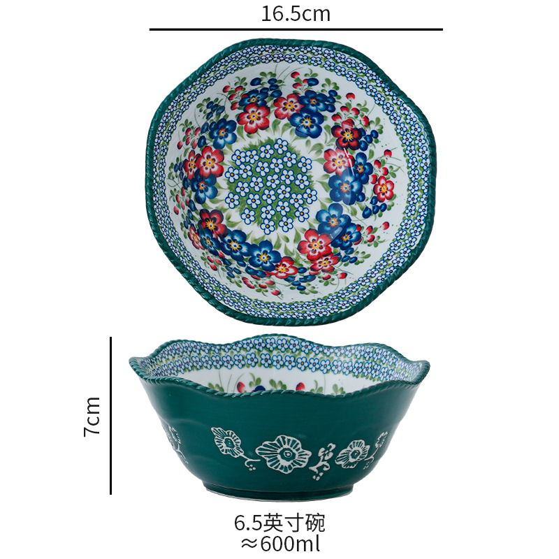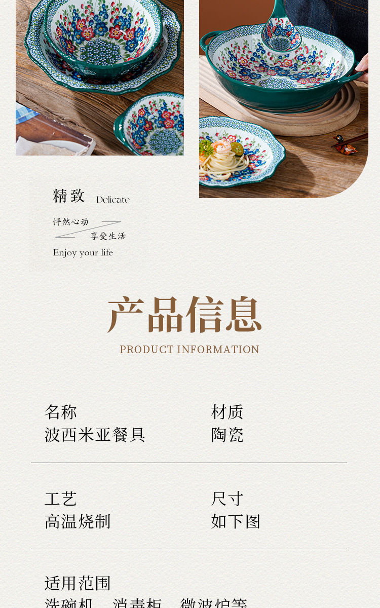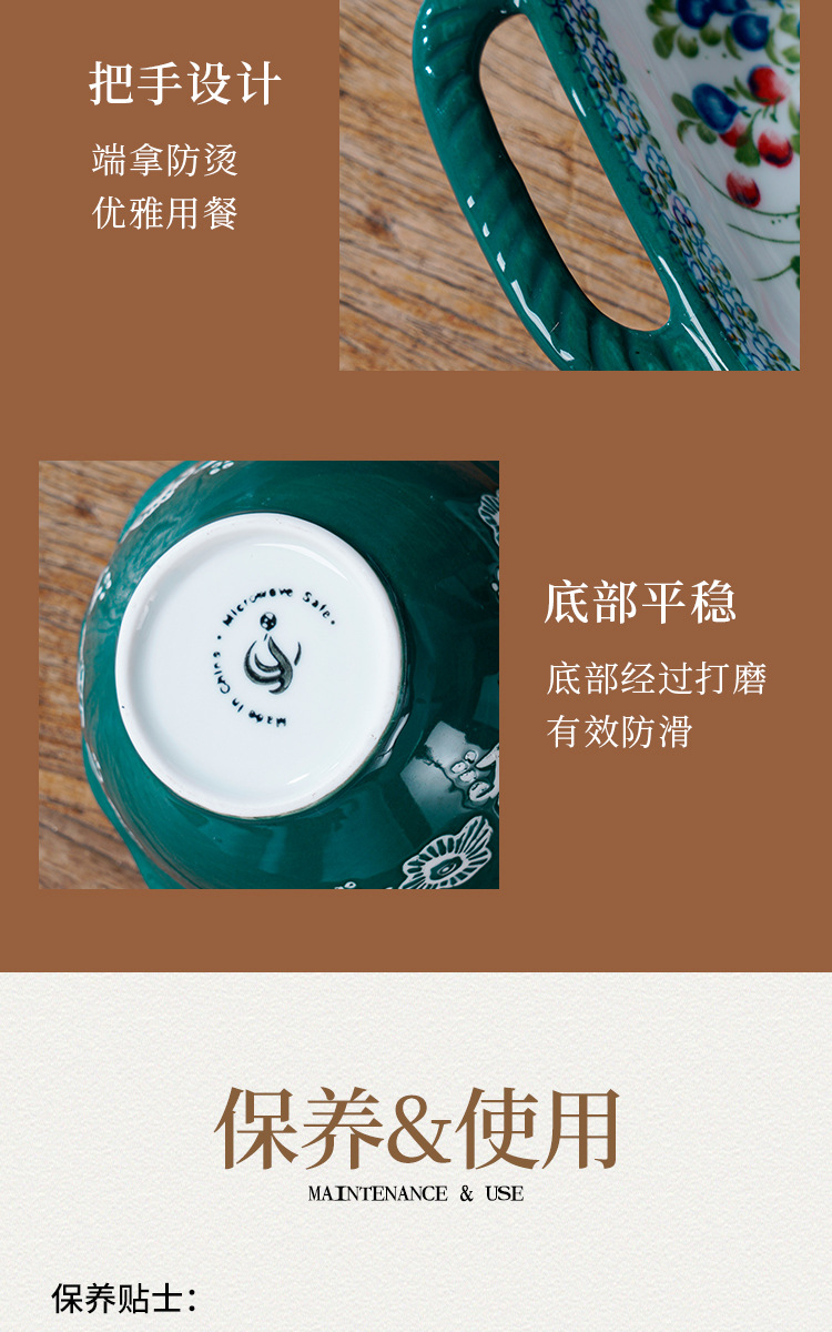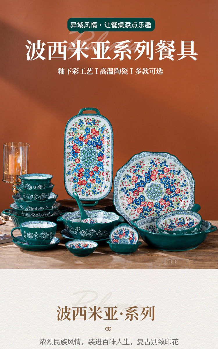 波兰彩陶瓷餐具手绘釉下彩家用菜盘双耳汤碗手柄碗双耳鱼盘饭碗汤