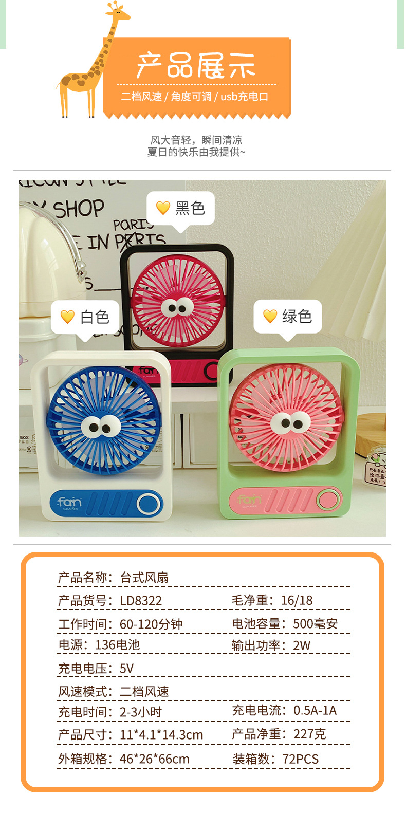 卡通USB迷你风扇 床头桌面户外小型充电小风扇可调角度台式电风扇