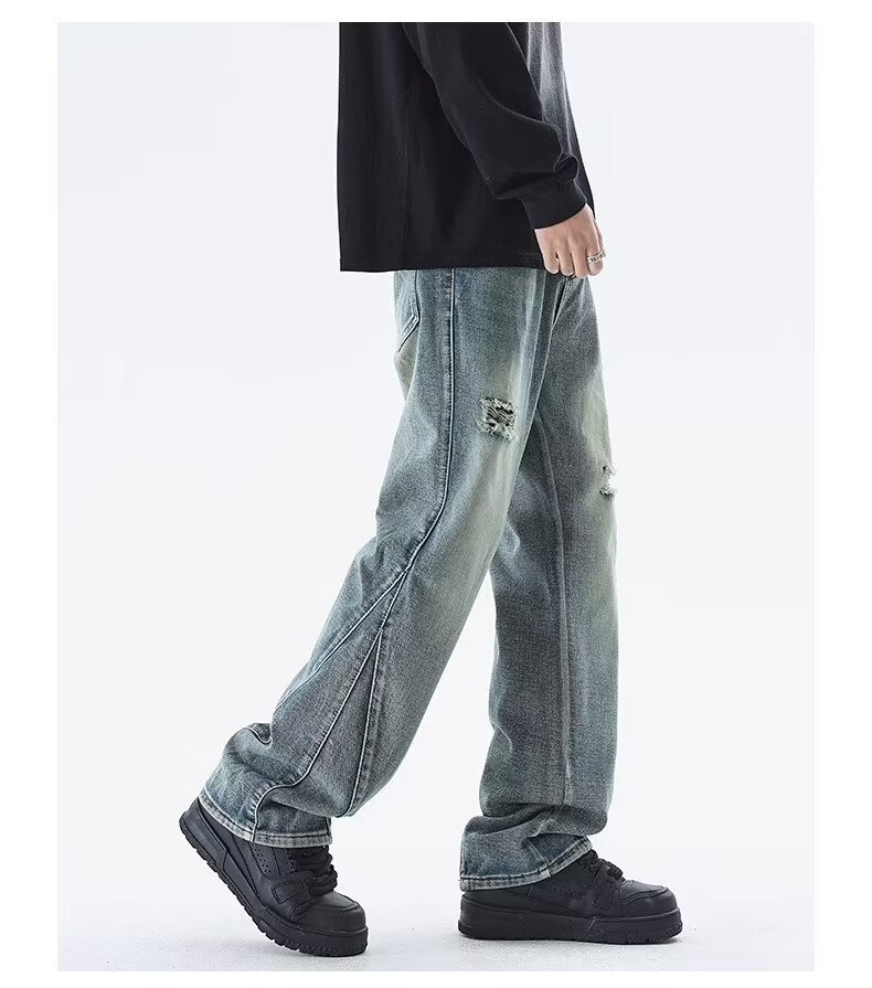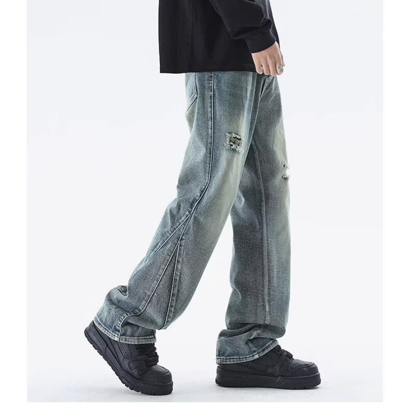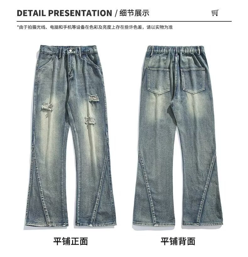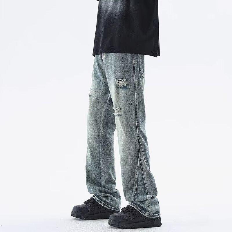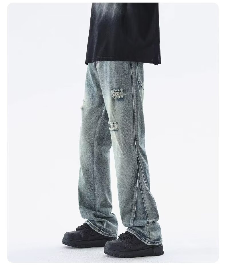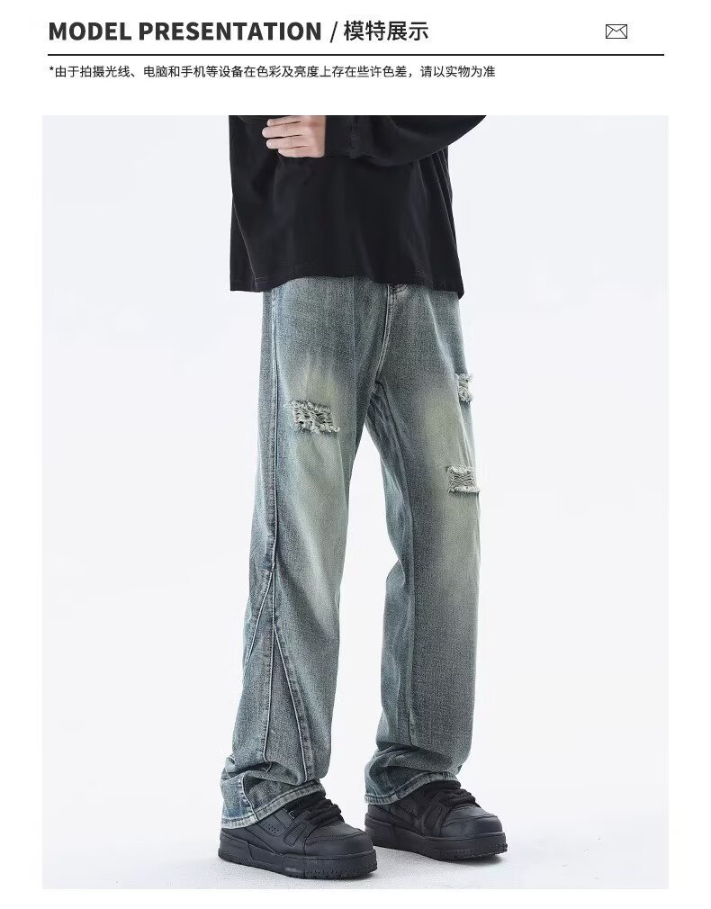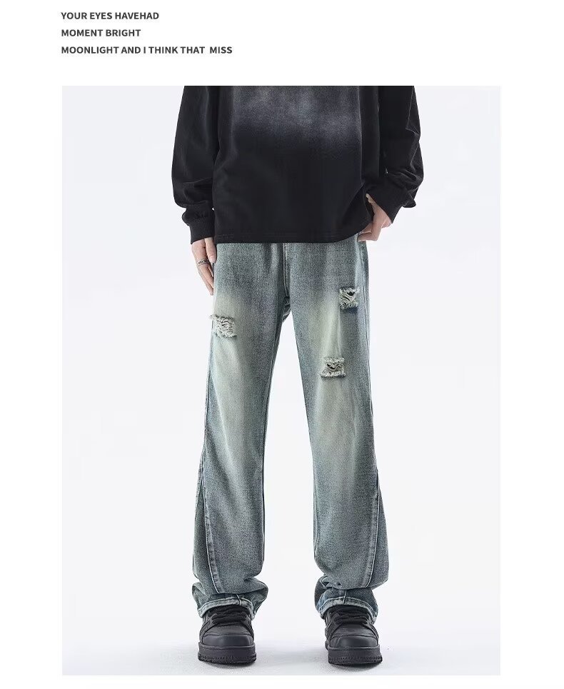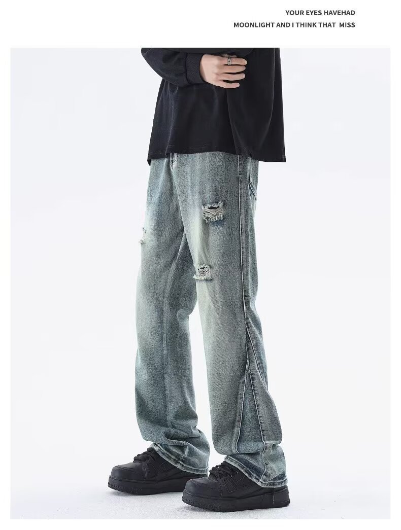美式破洞牛仔裤男春季水洗做旧微喇阔腿裤春秋款宽松直筒高街长裤