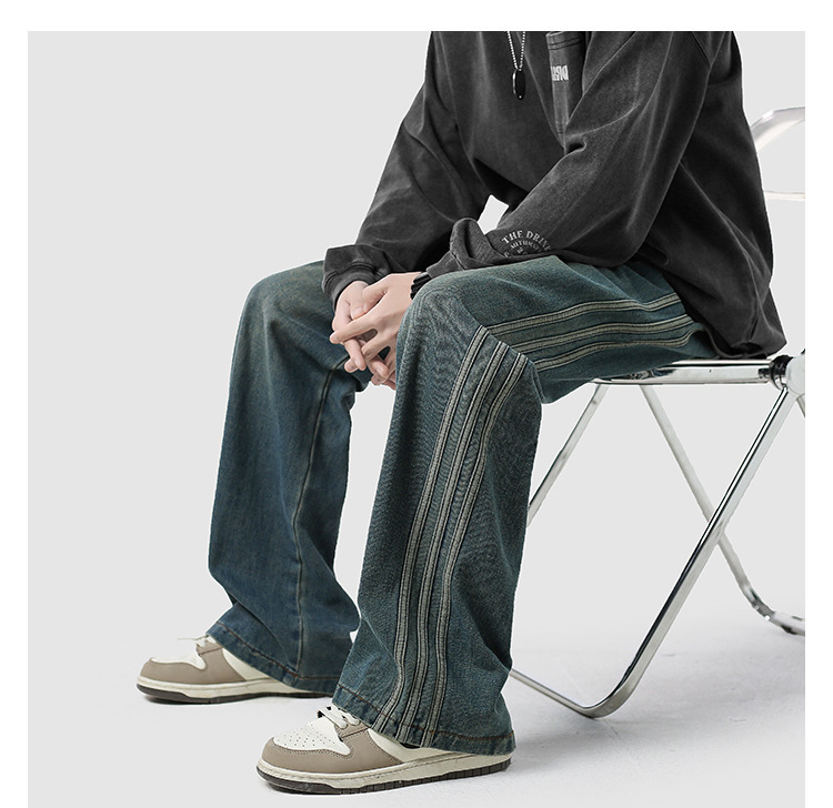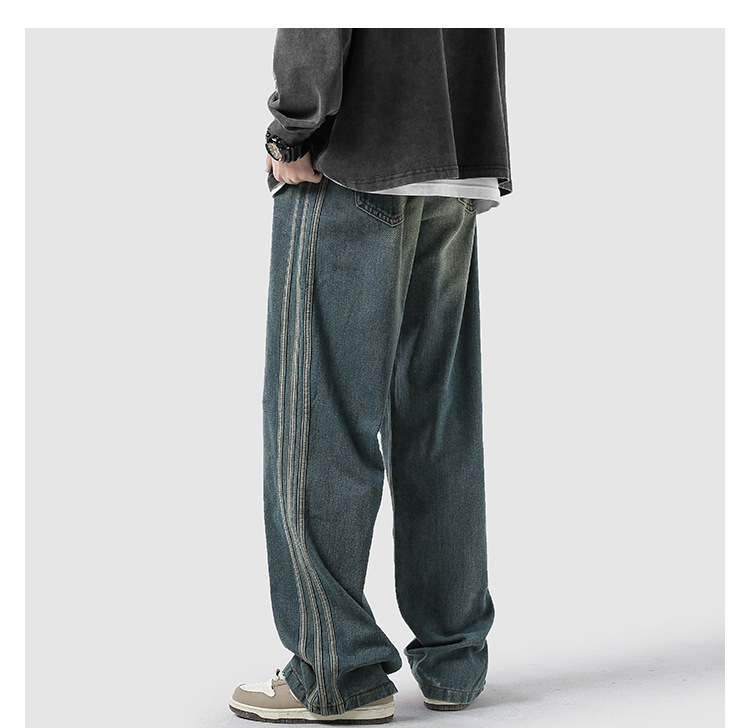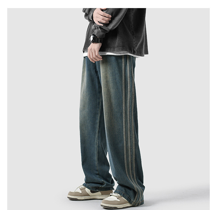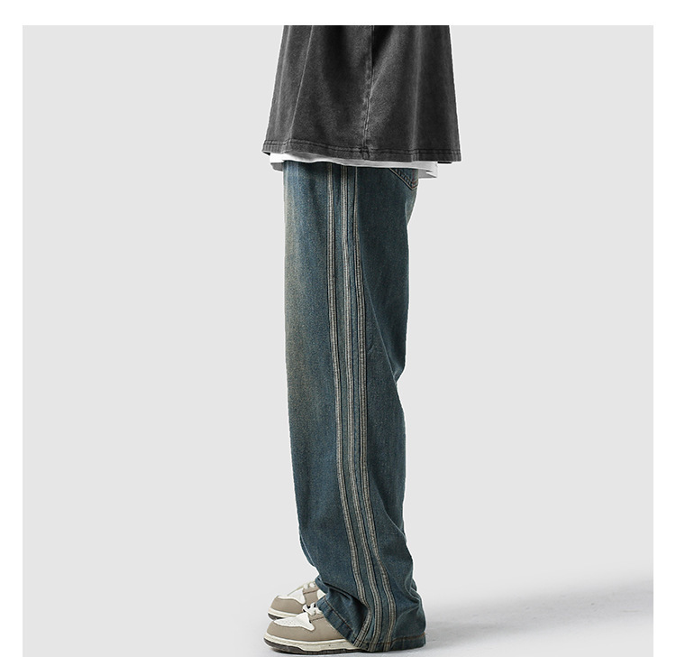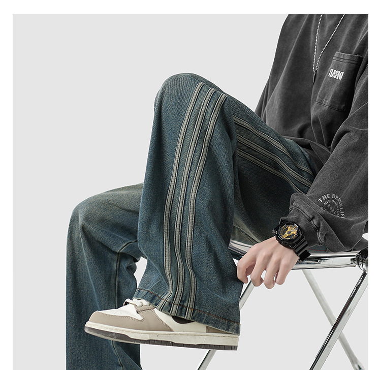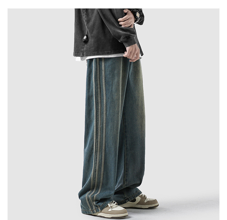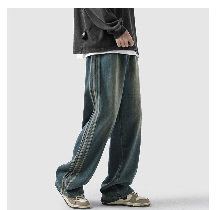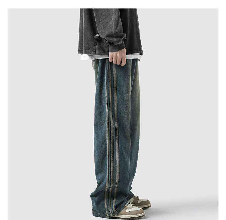 春秋美式高街拖地裤复古直筒牛仔裤男潮牌侧边条纹休闲裤宽松阔腿