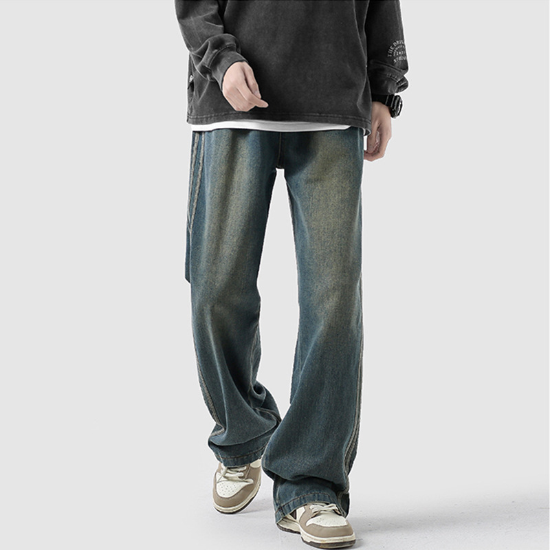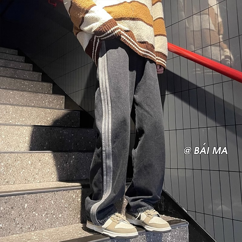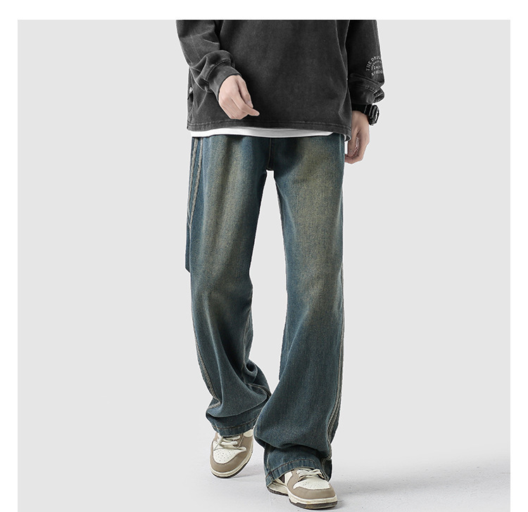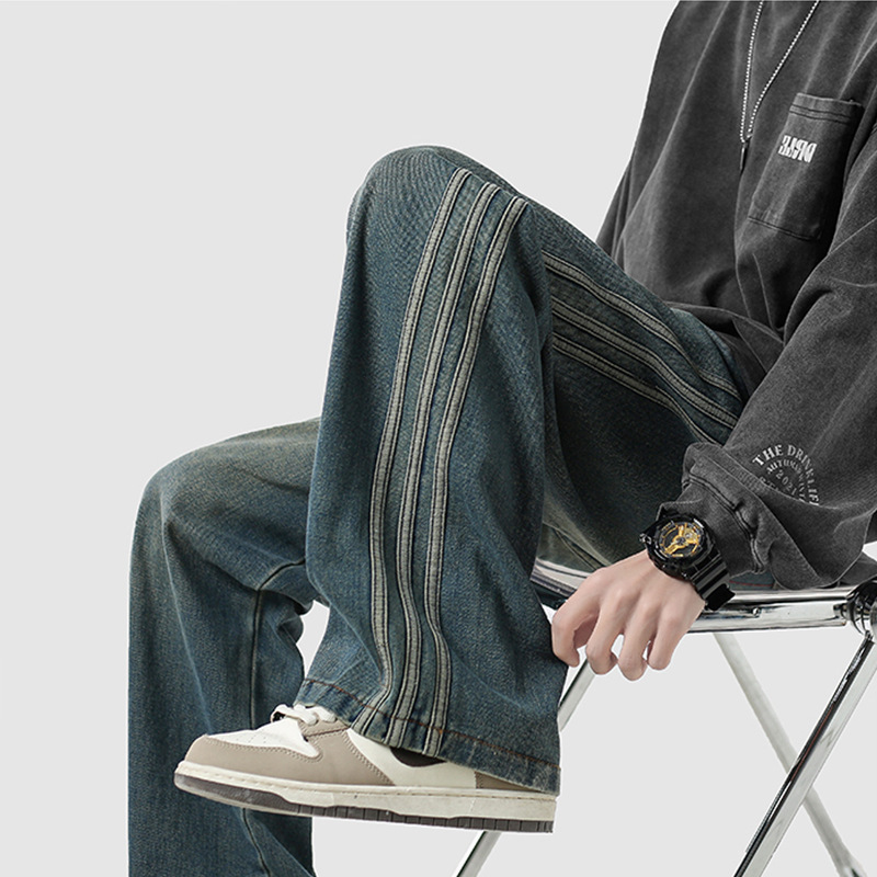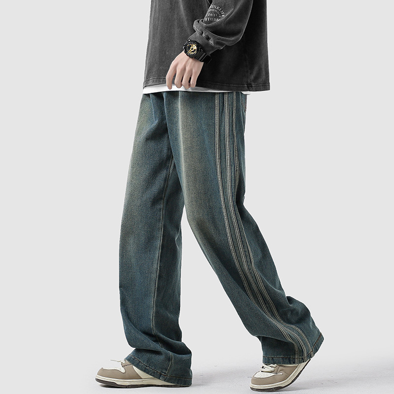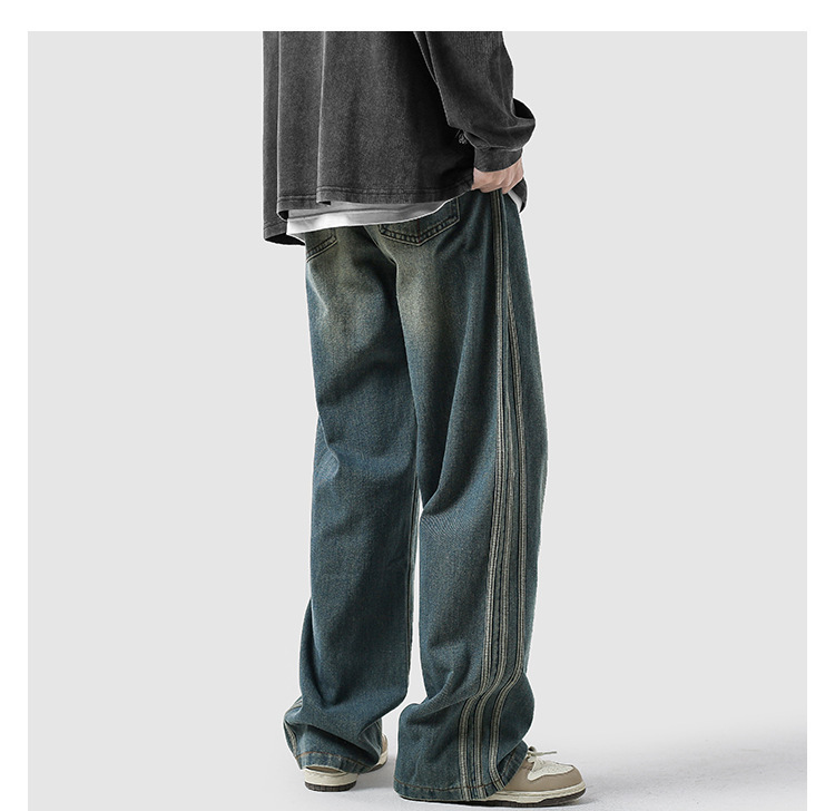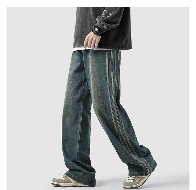 春秋美式高街拖地裤复古直筒牛仔裤男潮牌侧边条纹休闲裤宽松阔腿