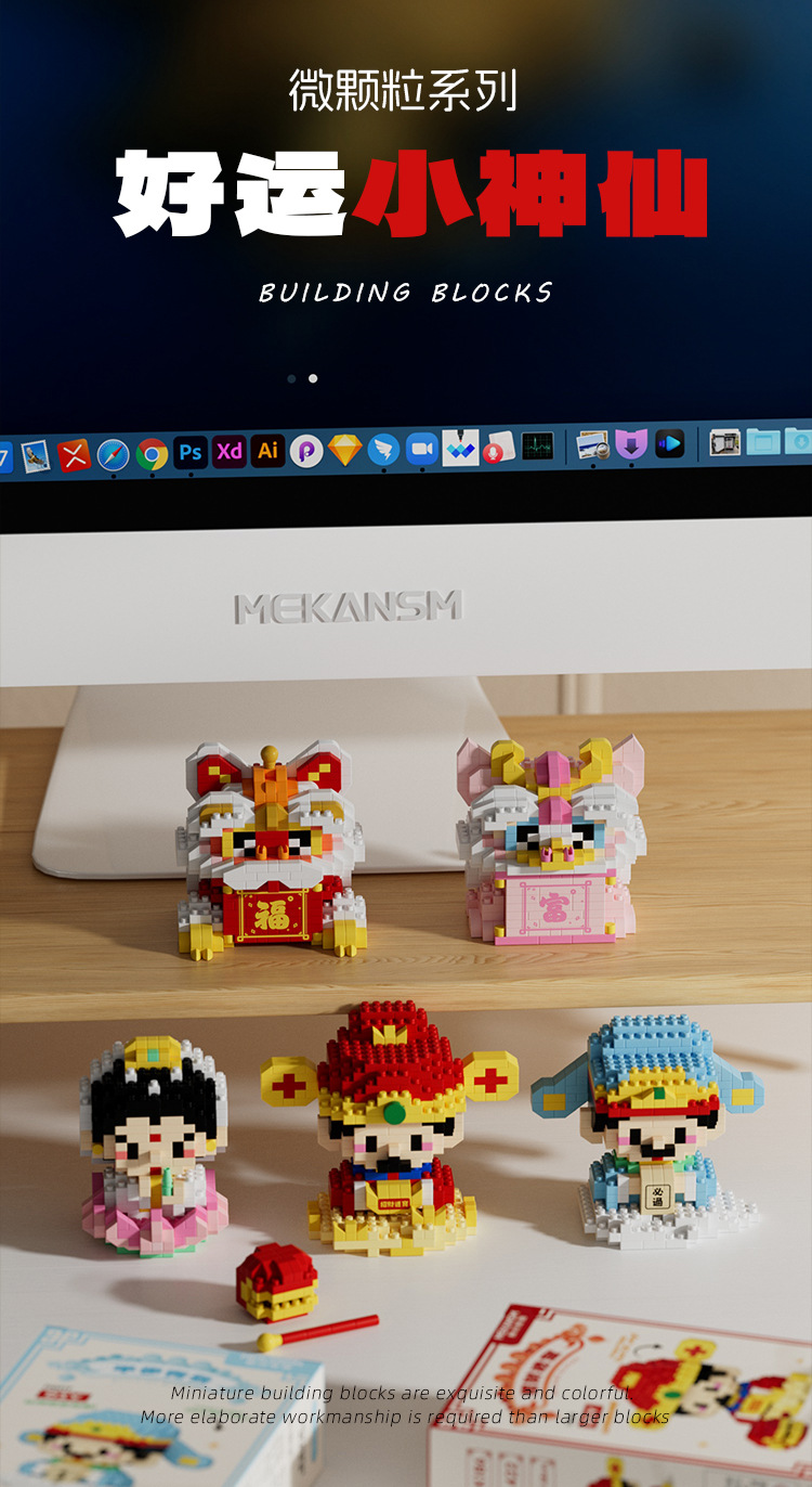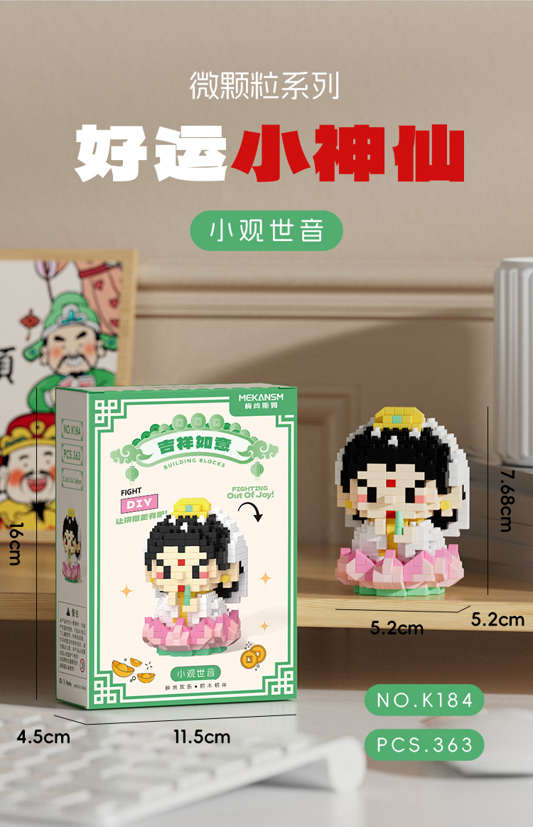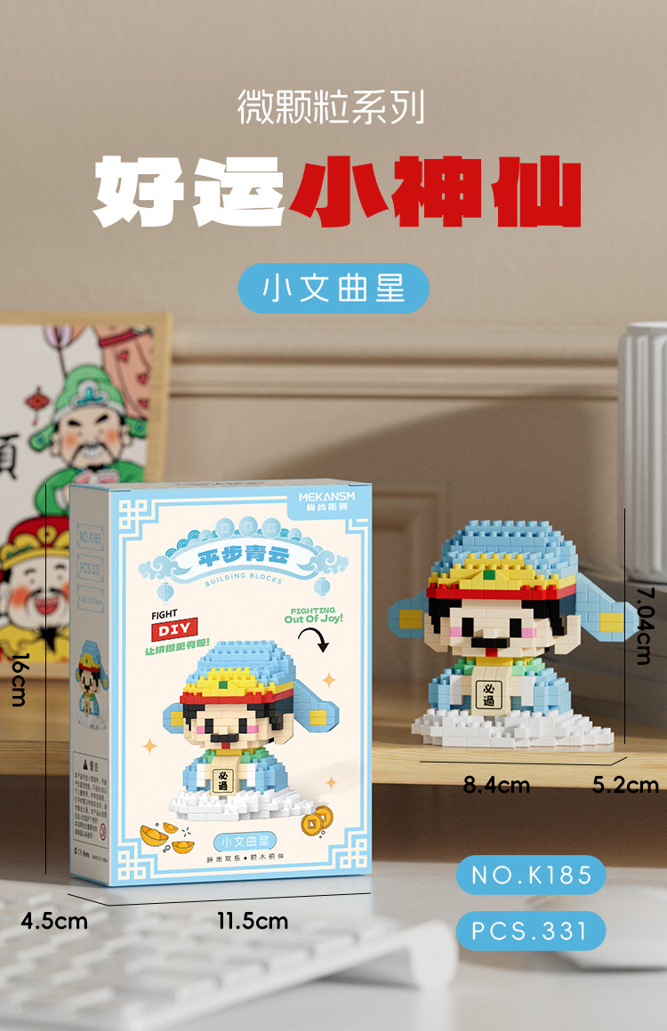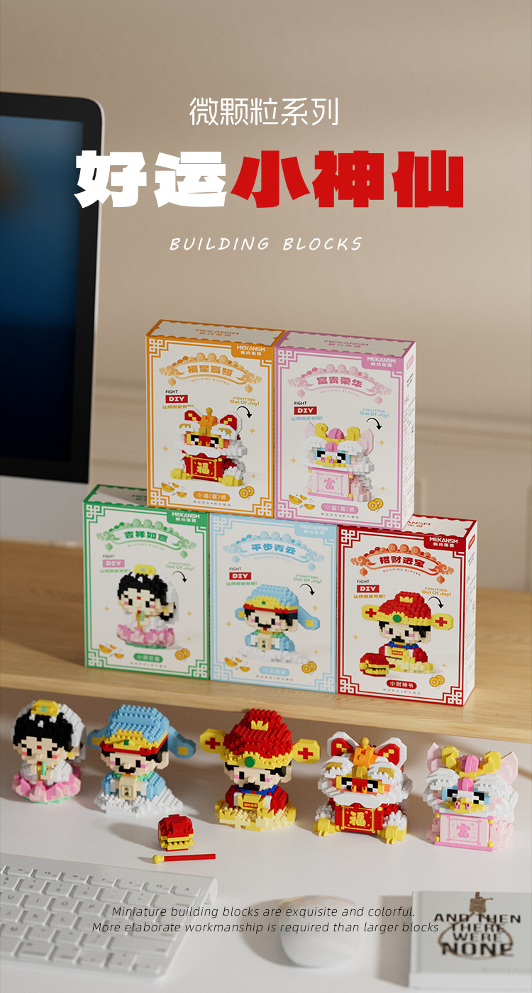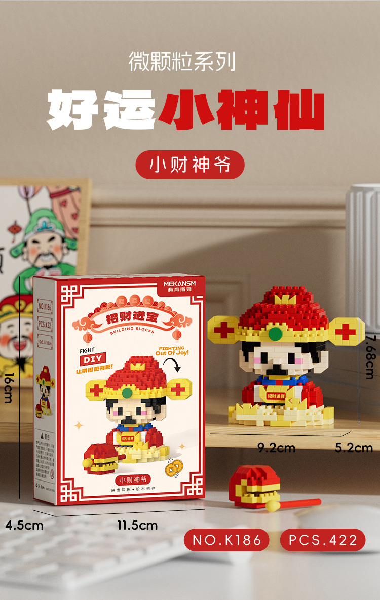 兼容国潮积木微颗粒财神爷月老小神仙系列小食记益智拼装玩具