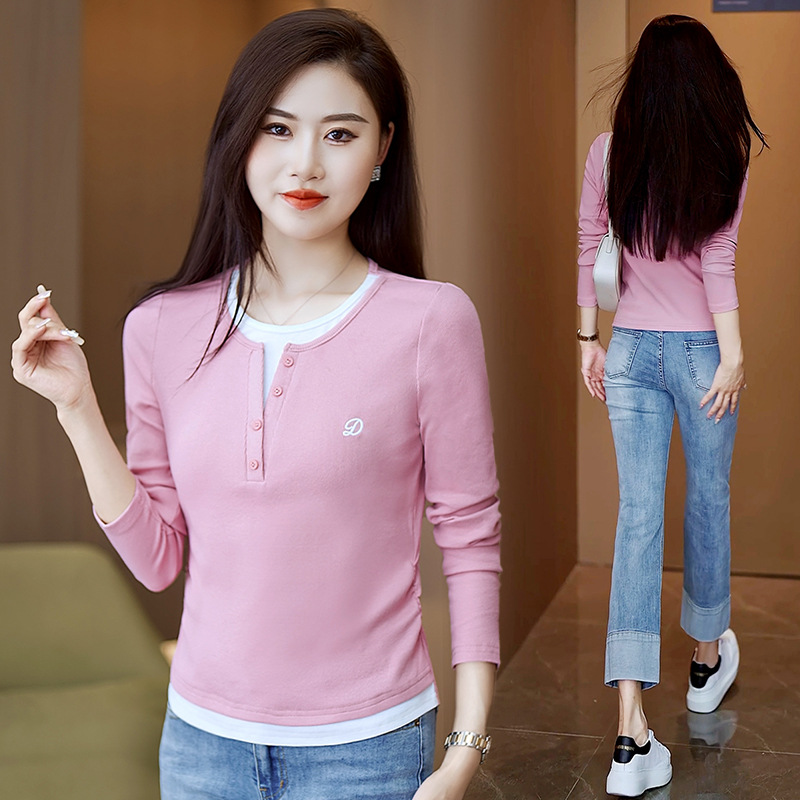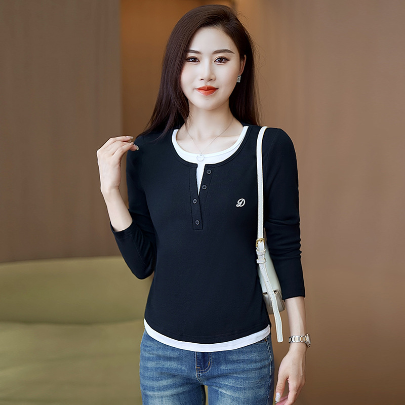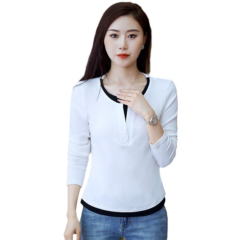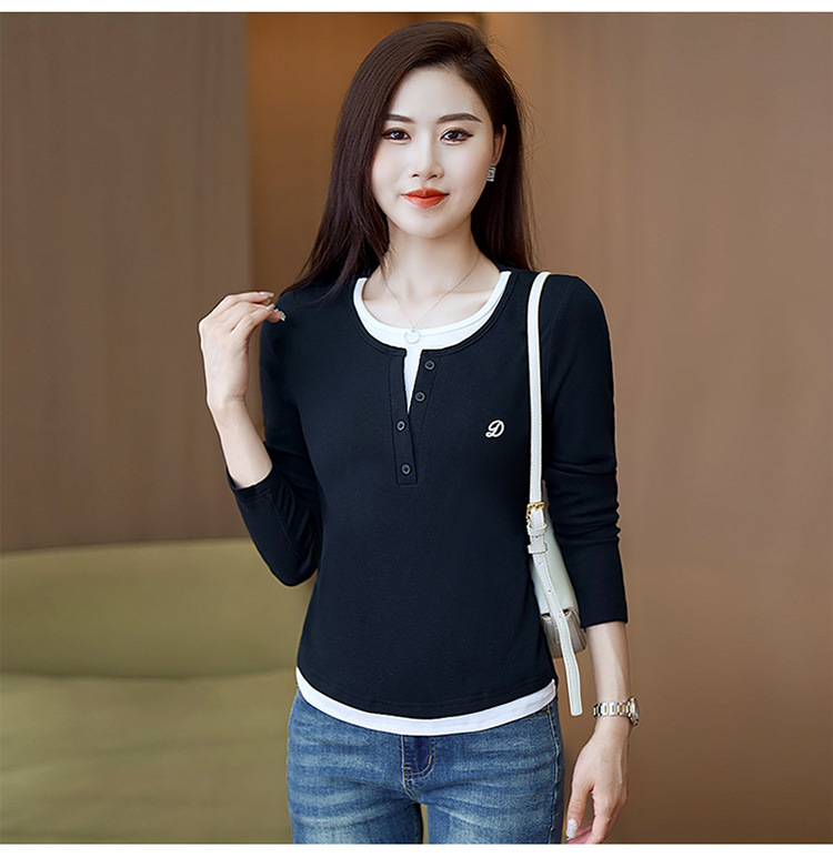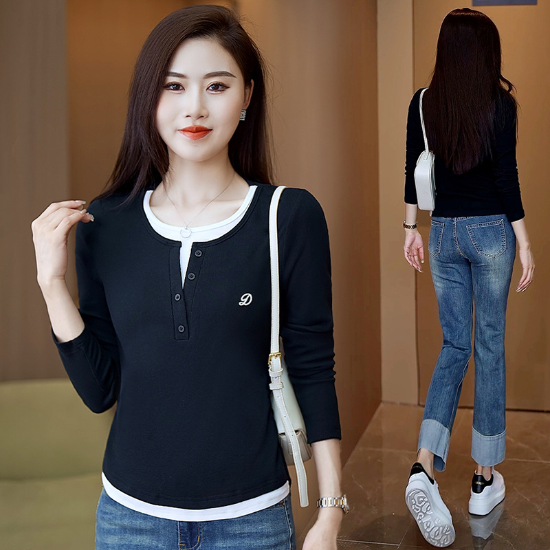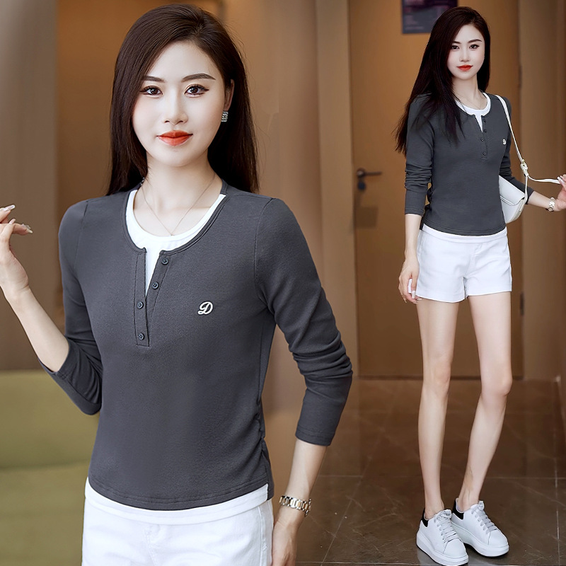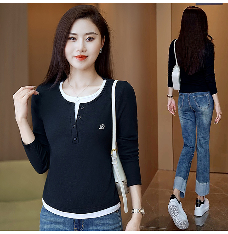 撞色假两件长袖T恤女2024新款春秋季时尚正肩内搭打底衫修身上衣