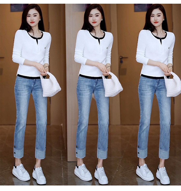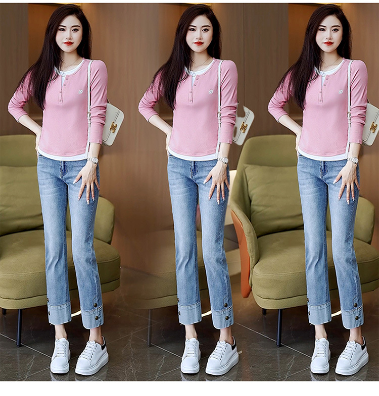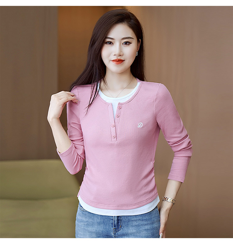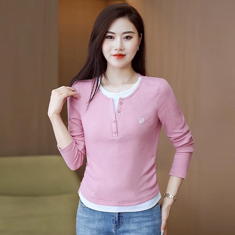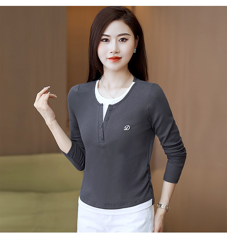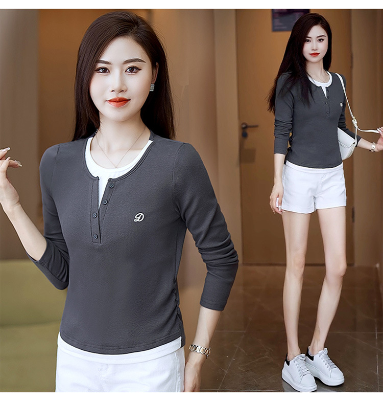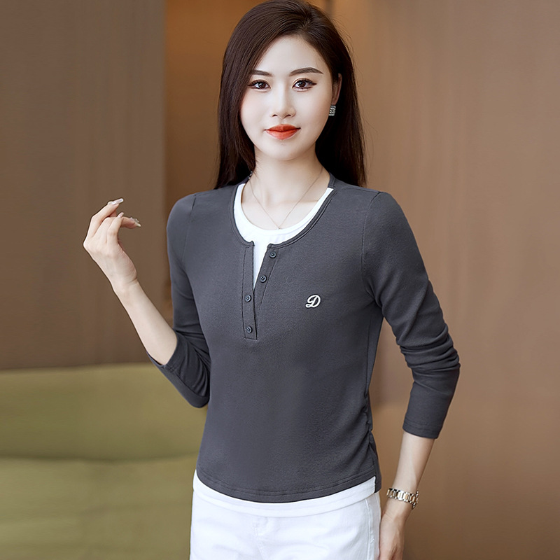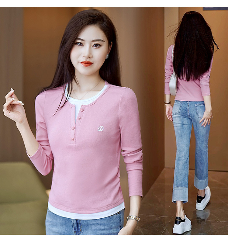撞色假两件长袖T恤女2024新款春秋季时尚正肩内搭打底衫修身上衣