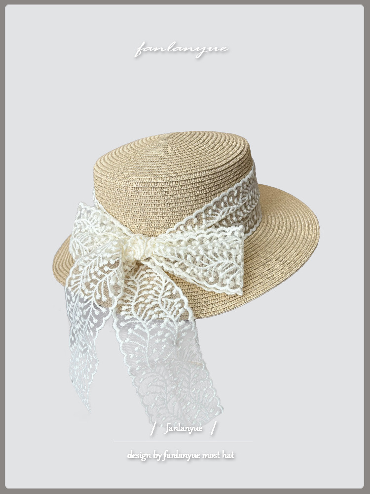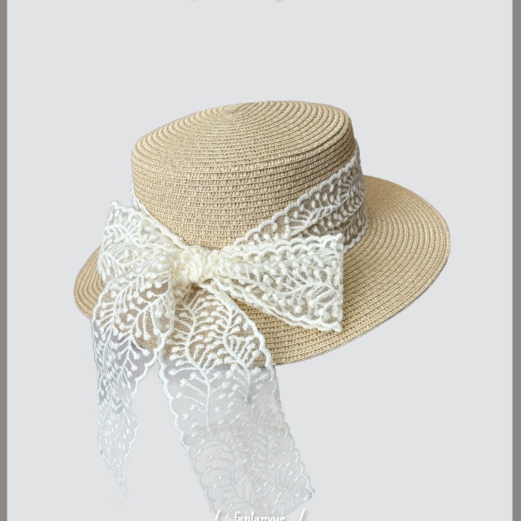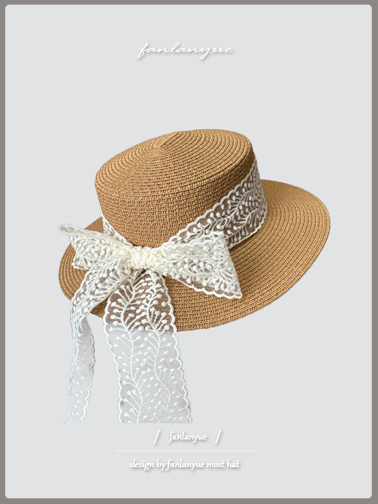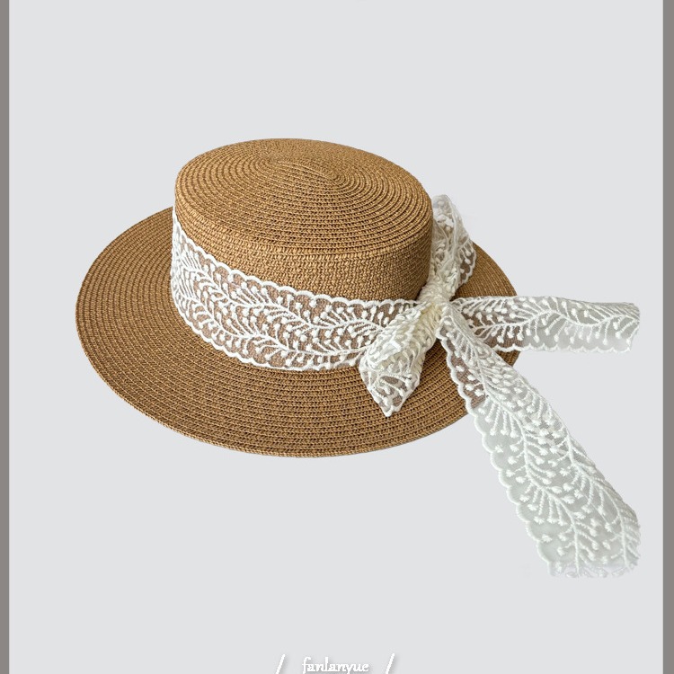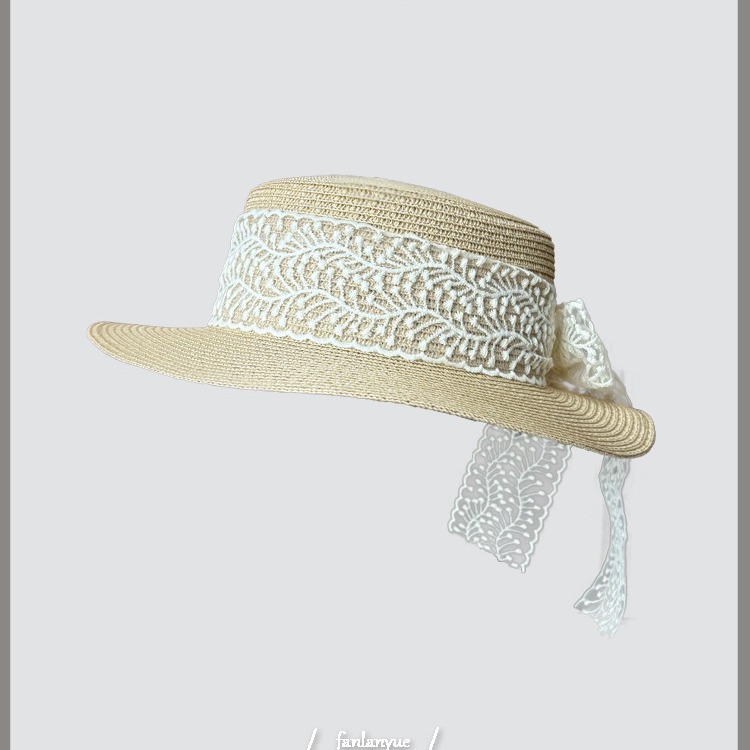 草帽女生夏季蕾丝甜美可爱平顶帽海边沙滩旅游度假遮阳防晒太阳帽