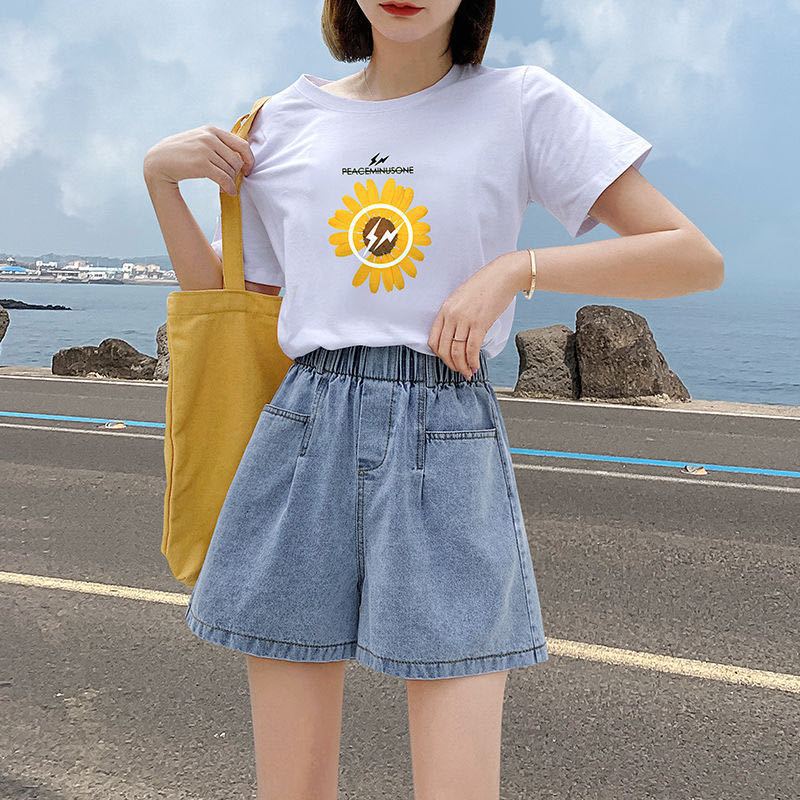 2024夏季高腰复古文艺水洗短裤宽松口袋新款牛仔短裤女阔脚撞色
