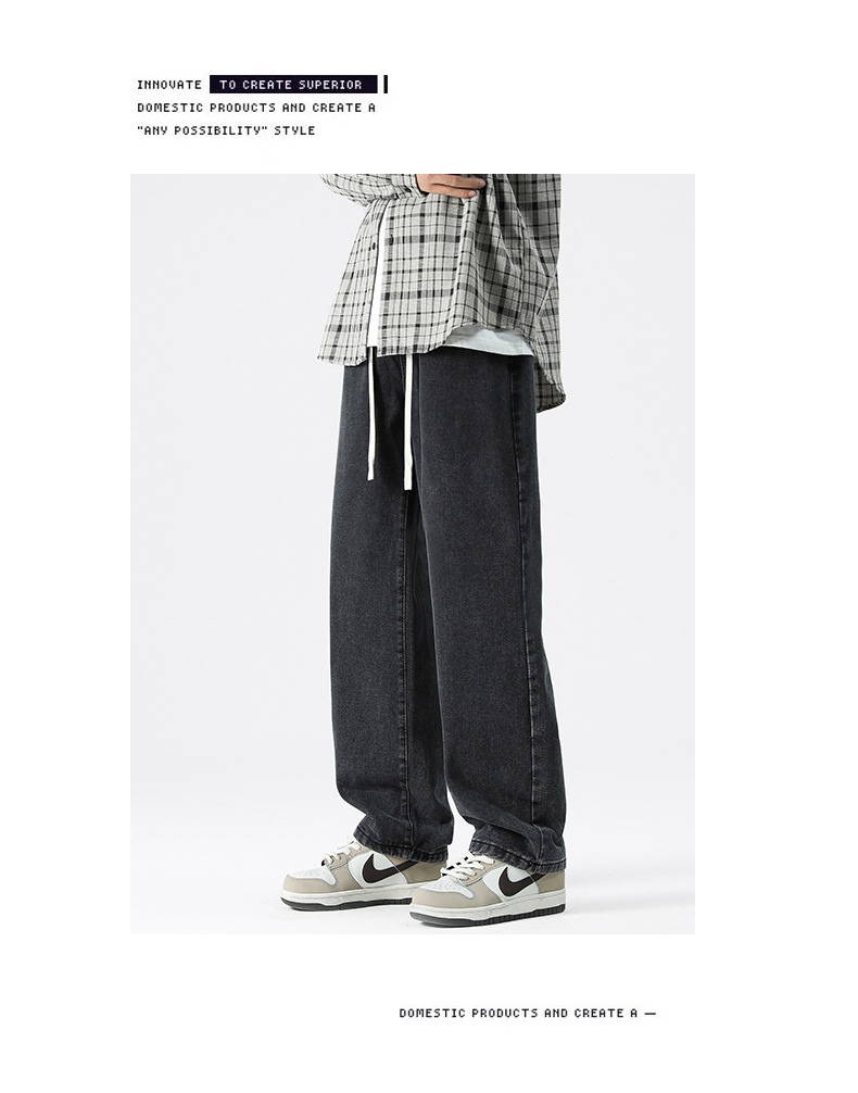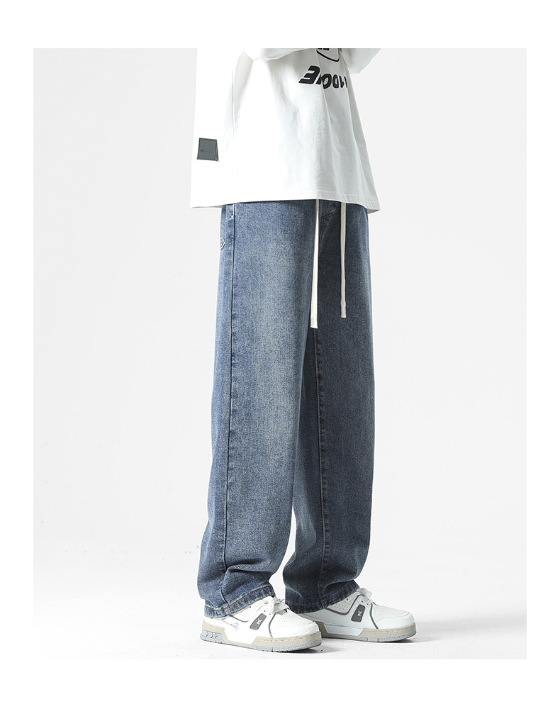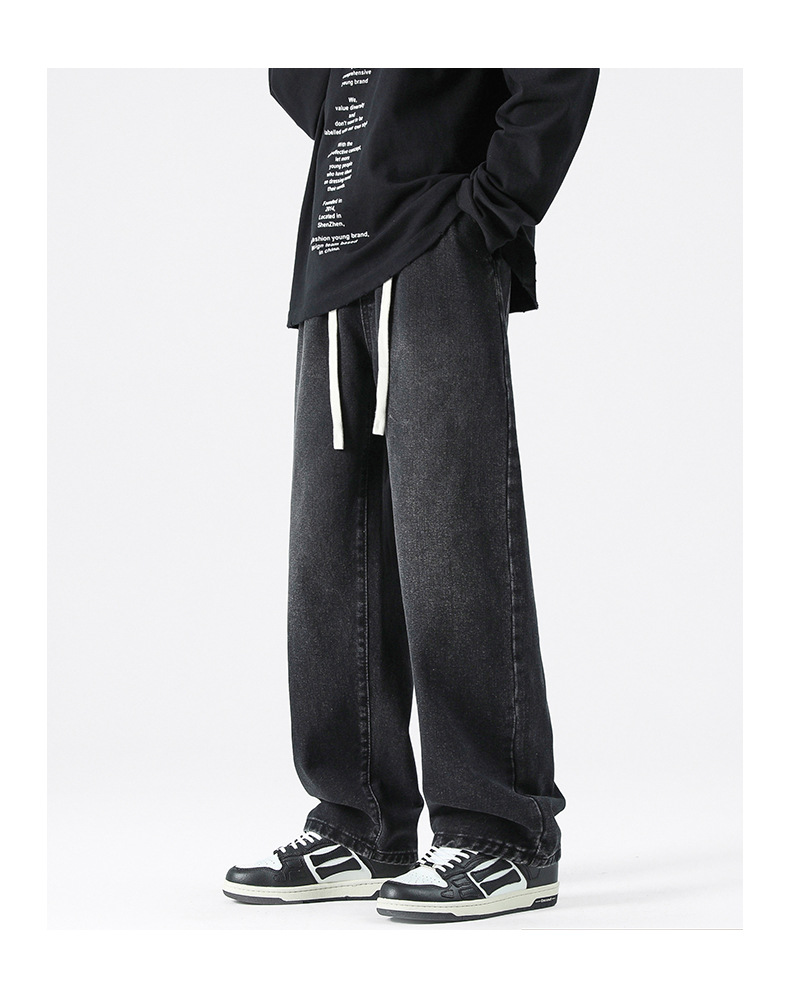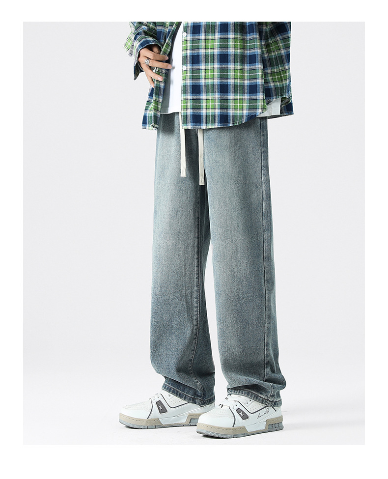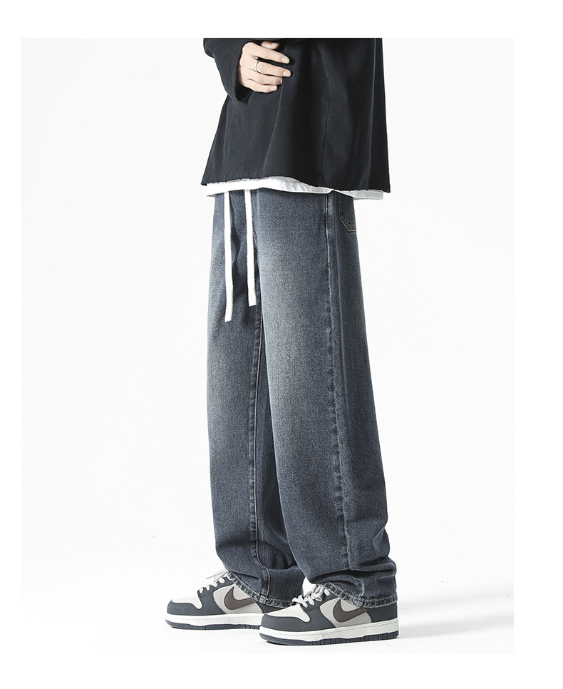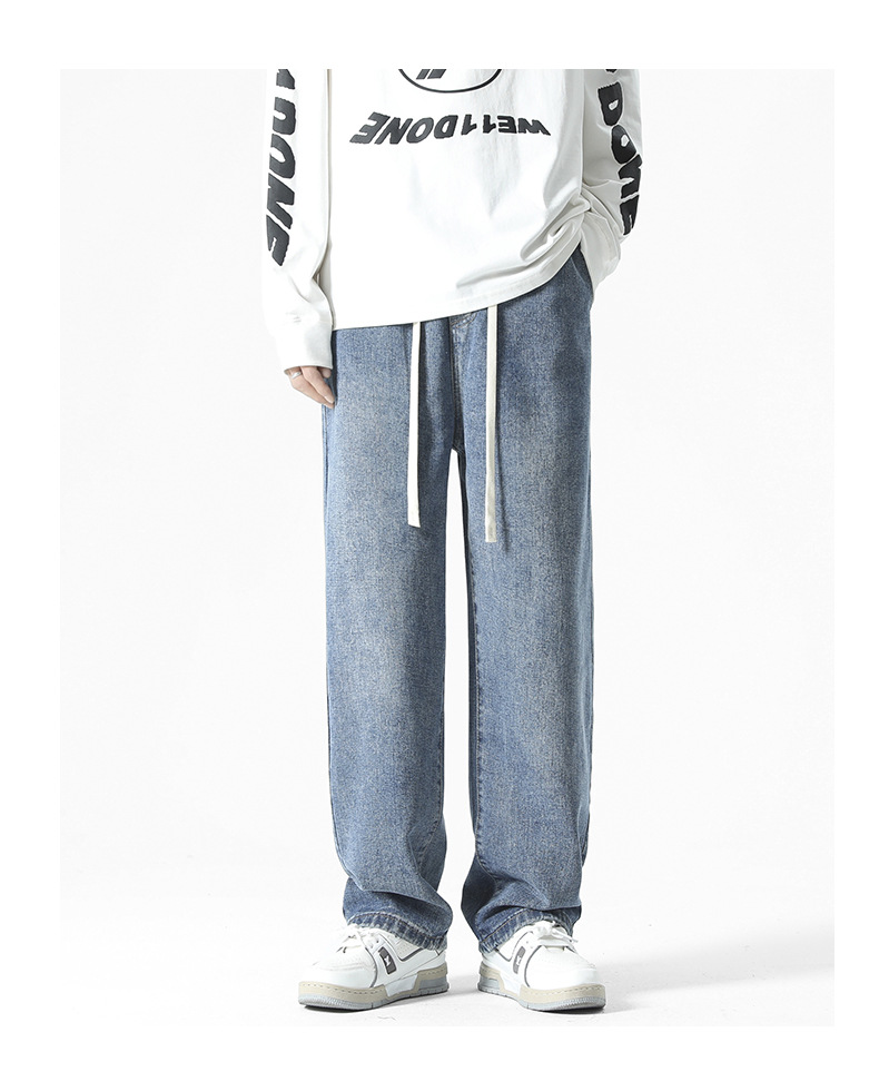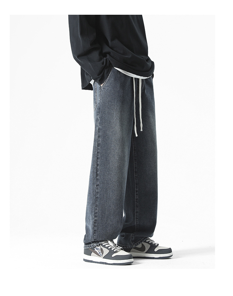 复古牛仔裤宽松直筒男士阔腿裤休闲美式长裤百搭春秋季抽绳男裤子