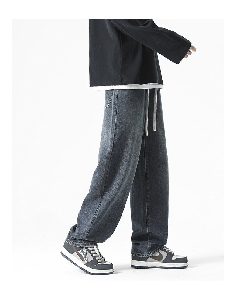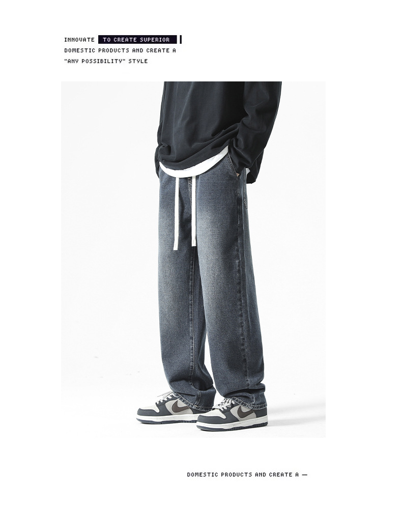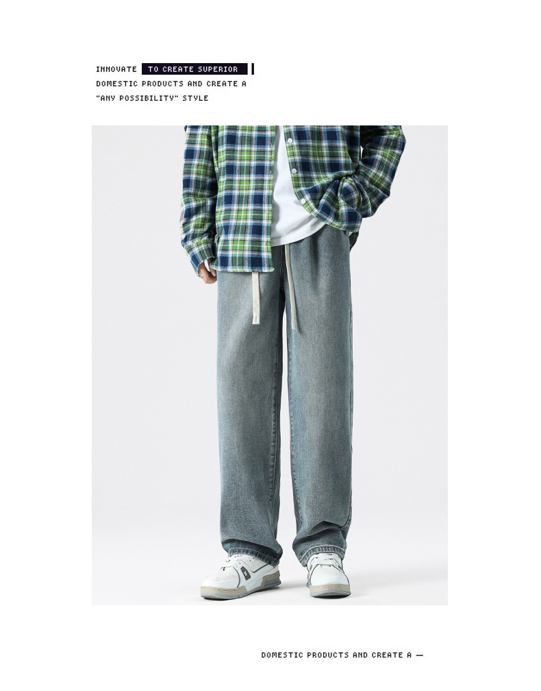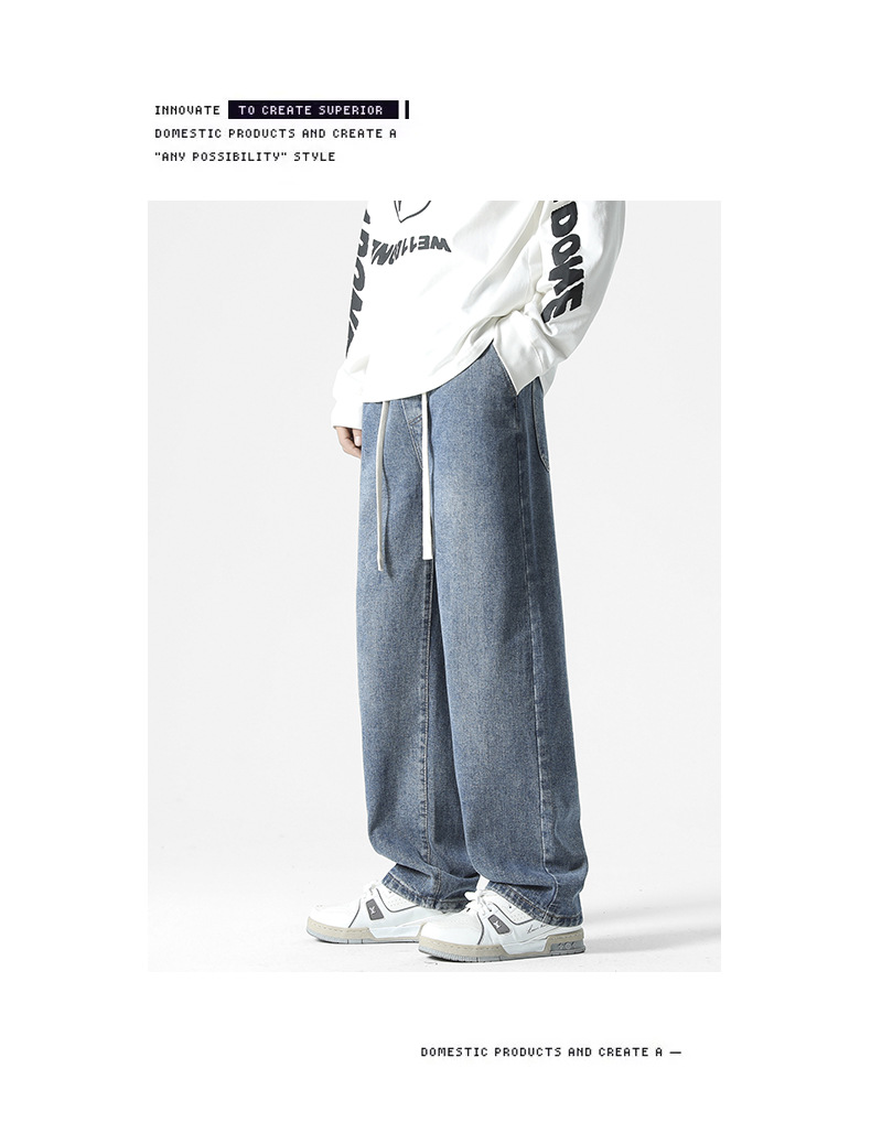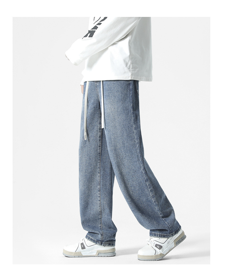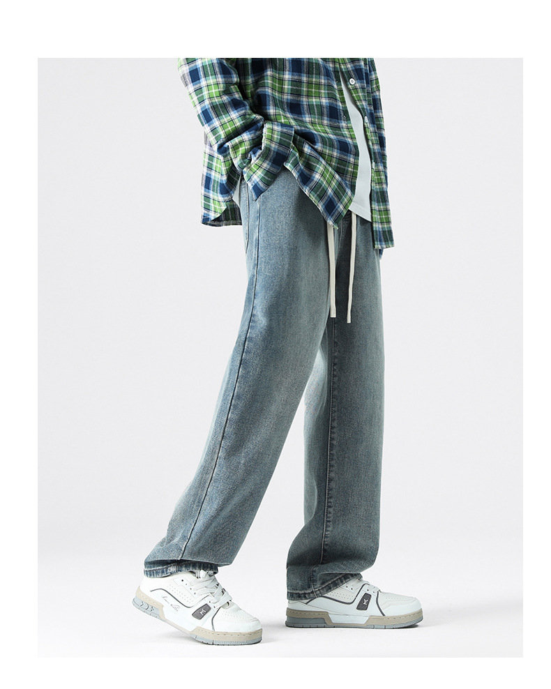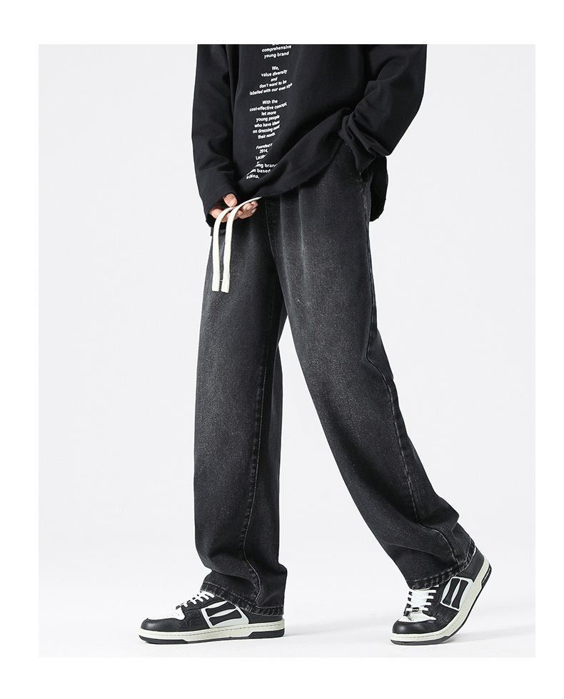 复古牛仔裤宽松直筒男士阔腿裤休闲美式长裤百搭春秋季抽绳男裤子