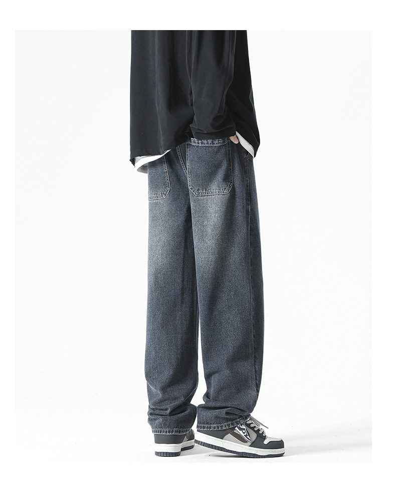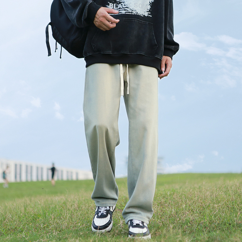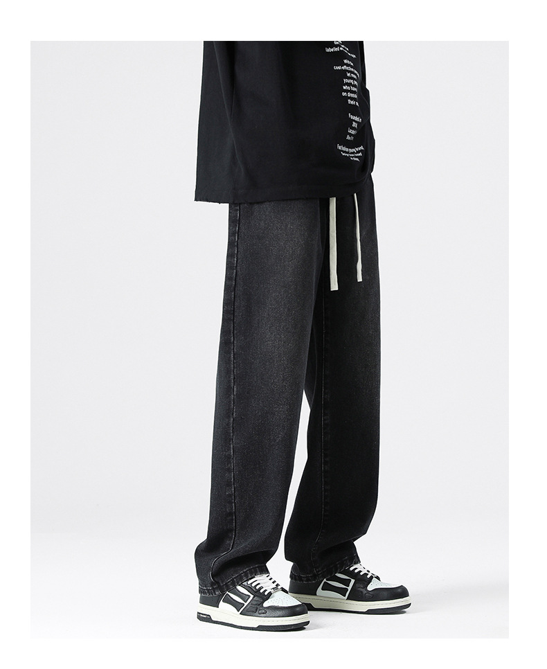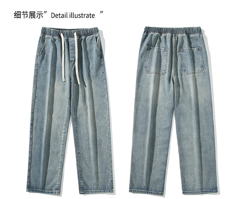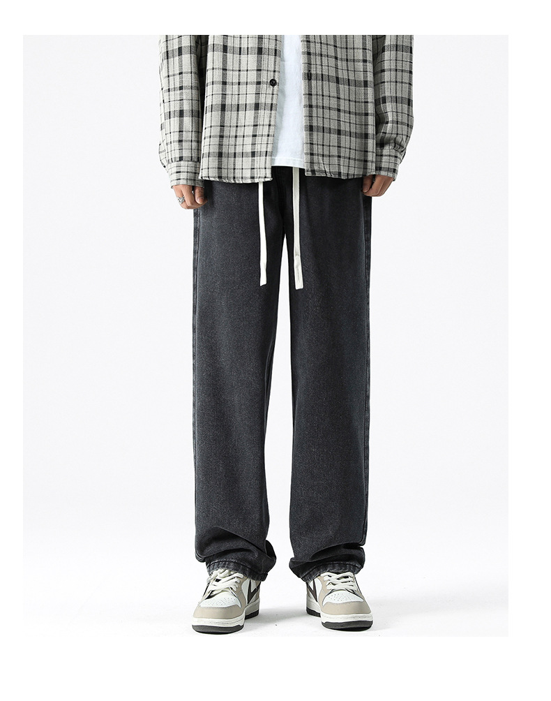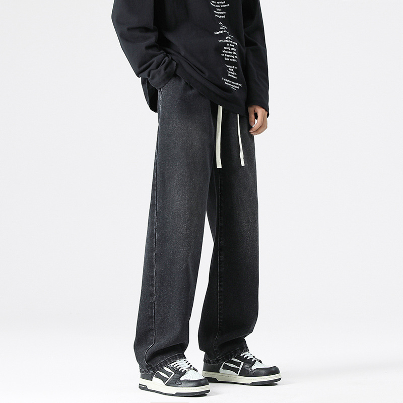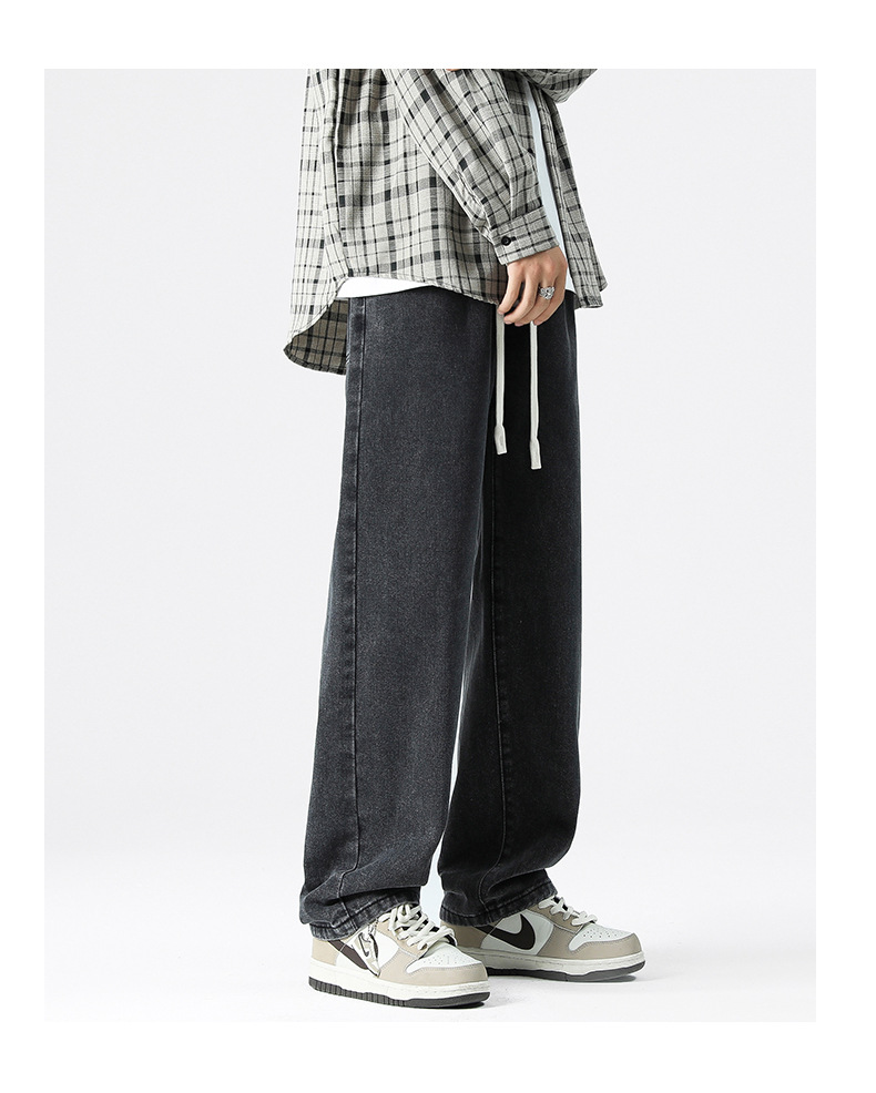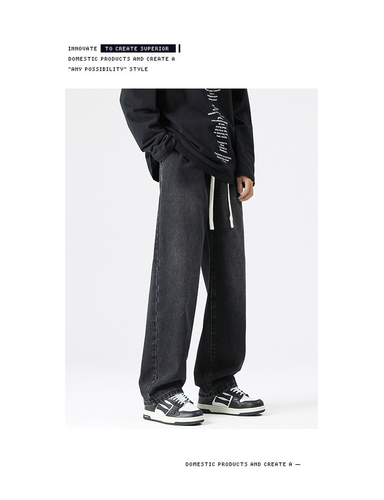 复古牛仔裤宽松直筒男士阔腿裤休闲美式长裤百搭春秋季抽绳男裤子