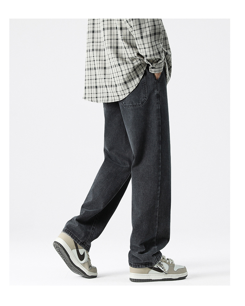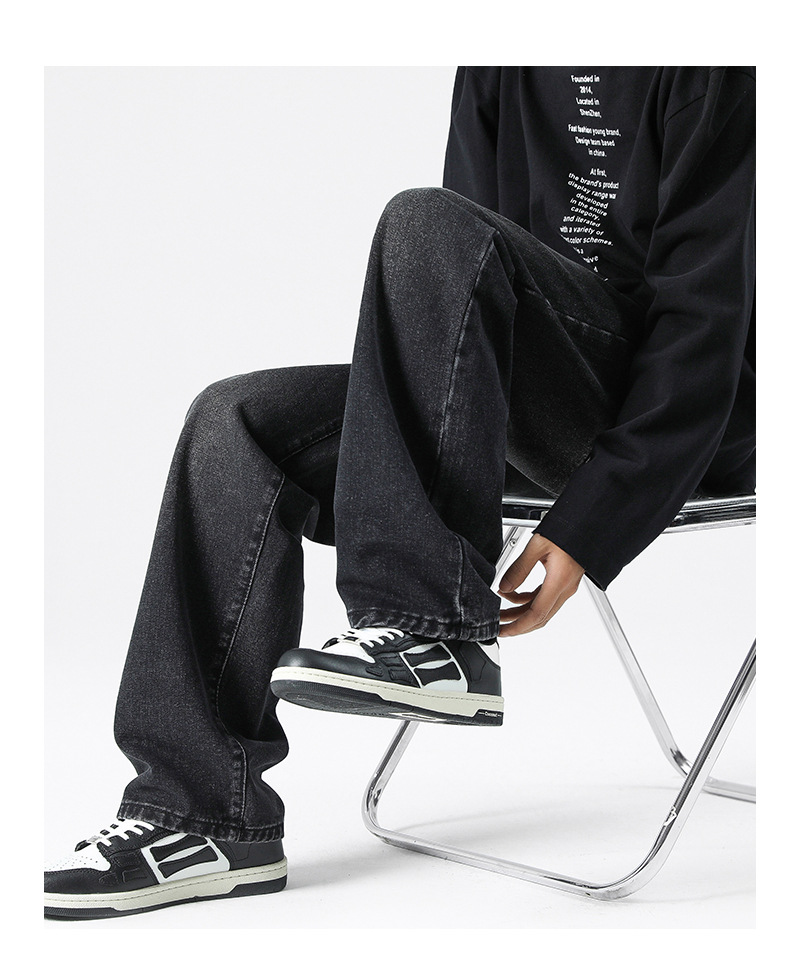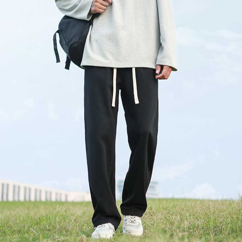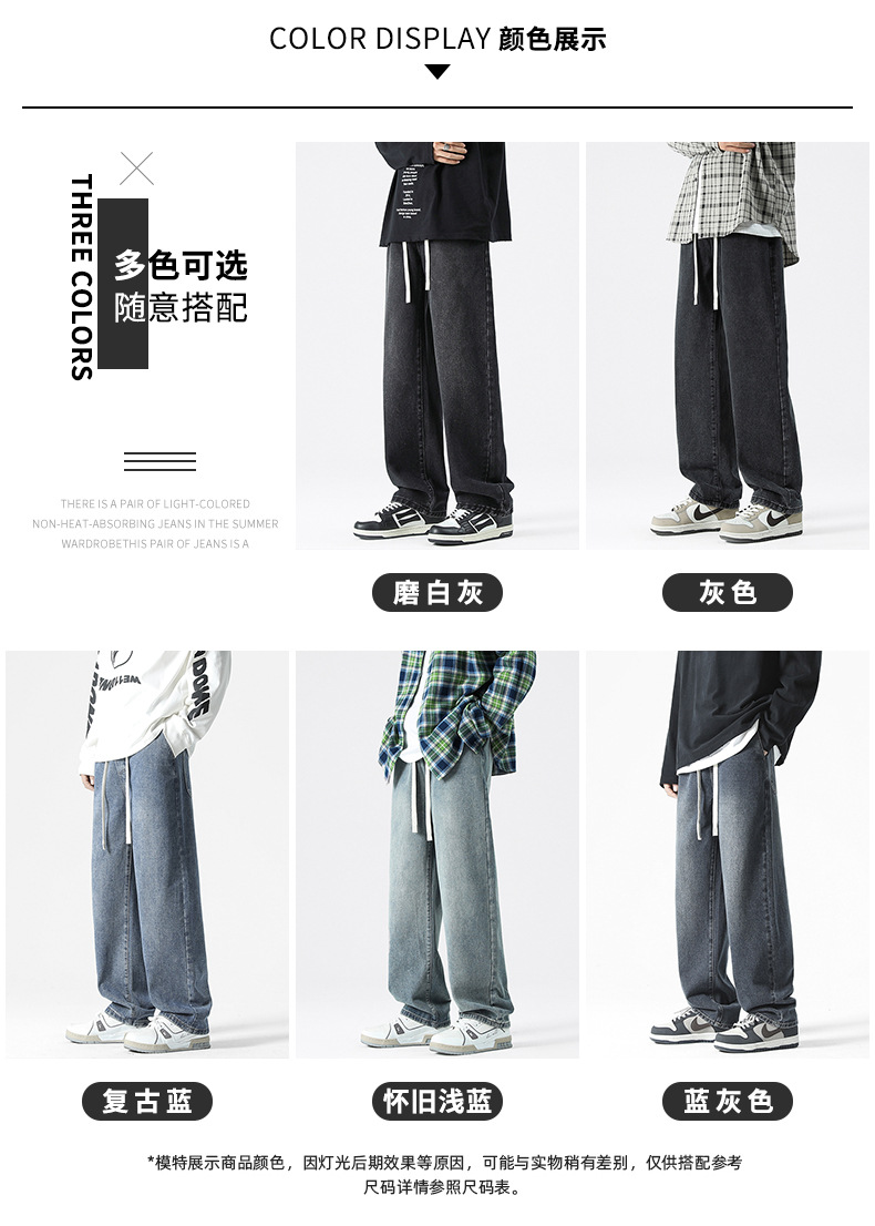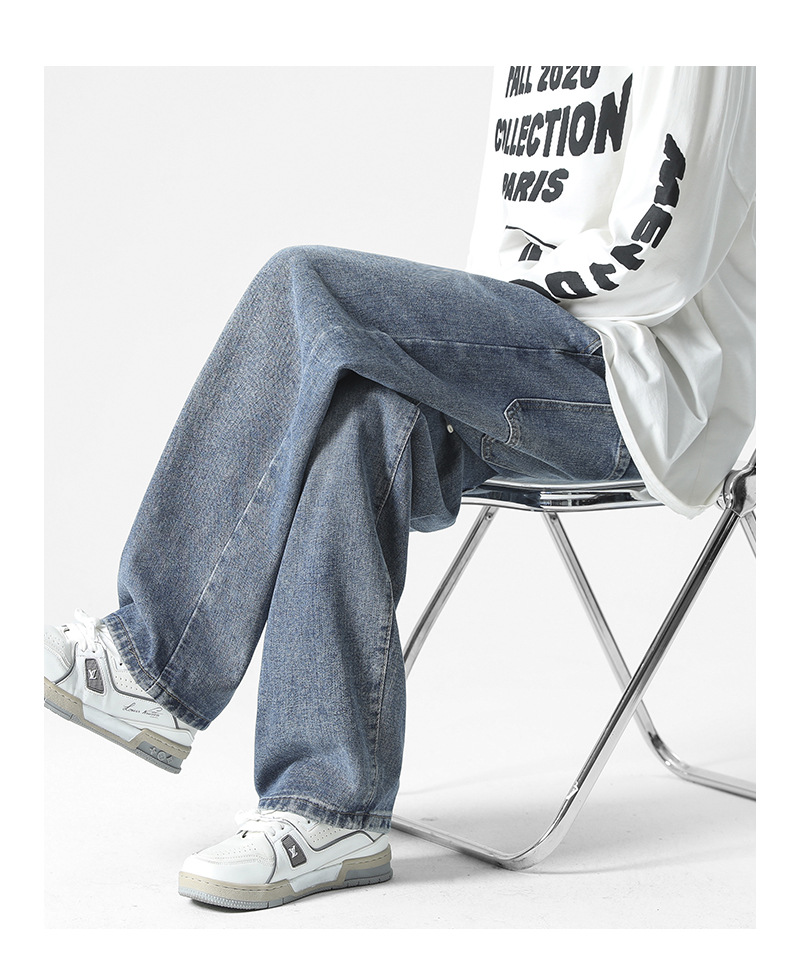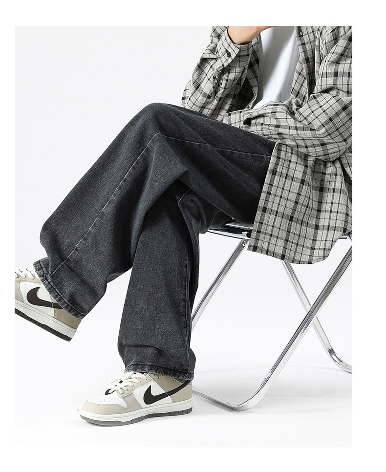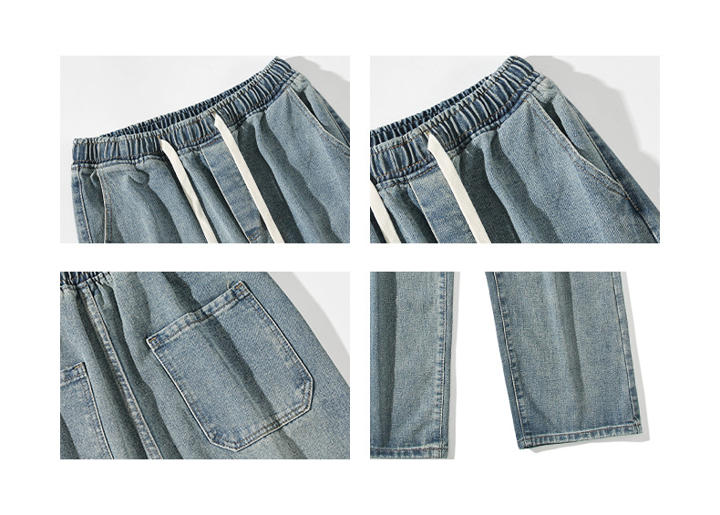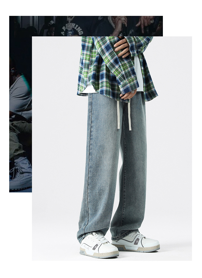 复古牛仔裤宽松直筒男士阔腿裤休闲美式长裤百搭春秋季抽绳男裤子