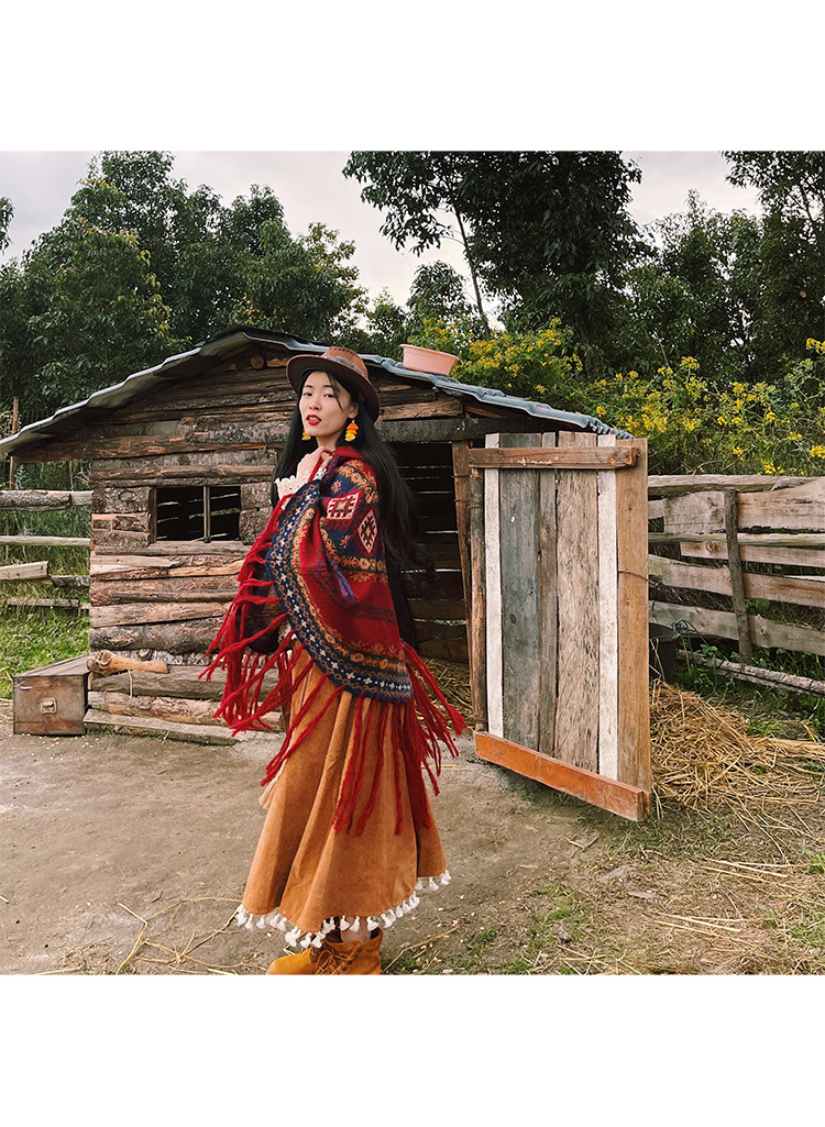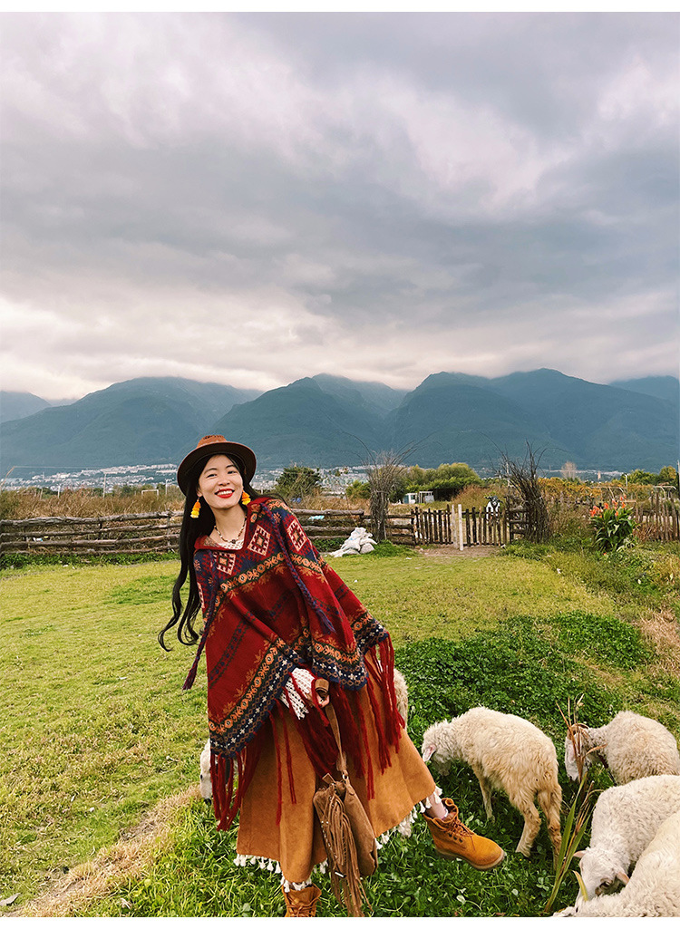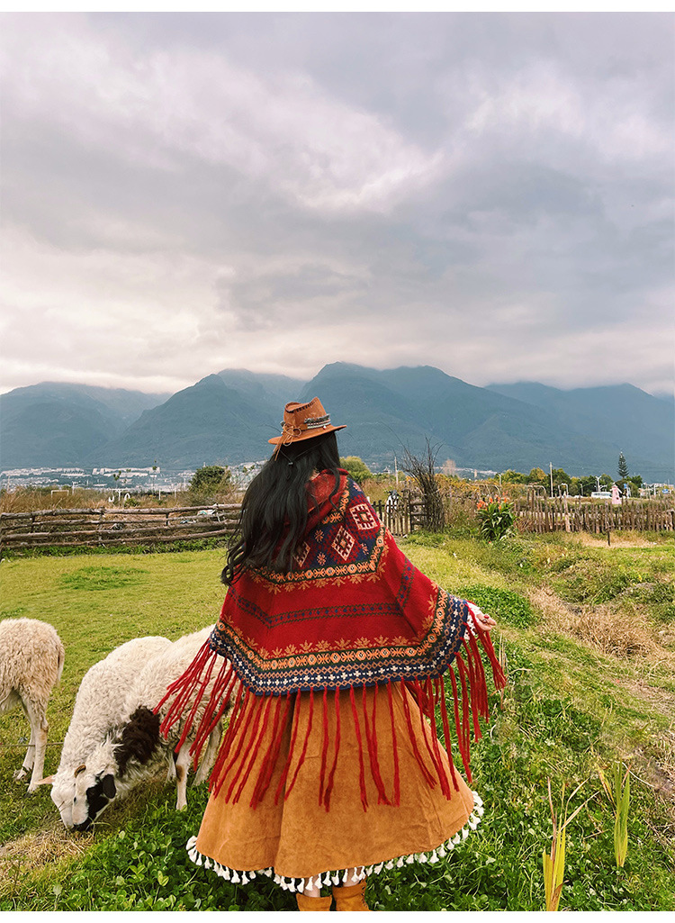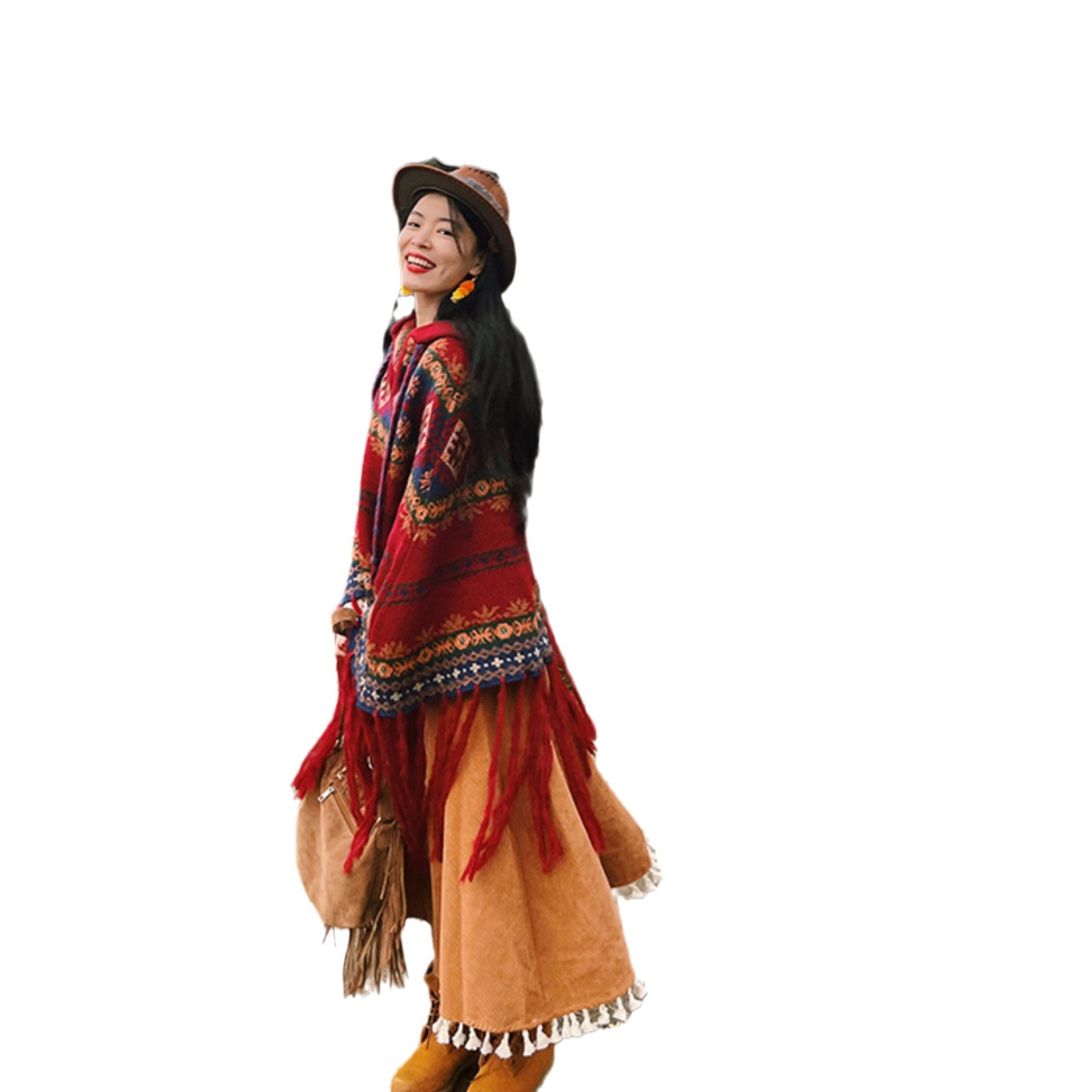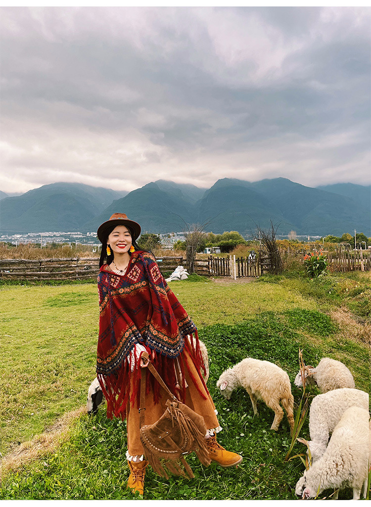 云南西藏青海湖茶卡旅游保暖围巾女复古红色民族风流苏春秋季披肩