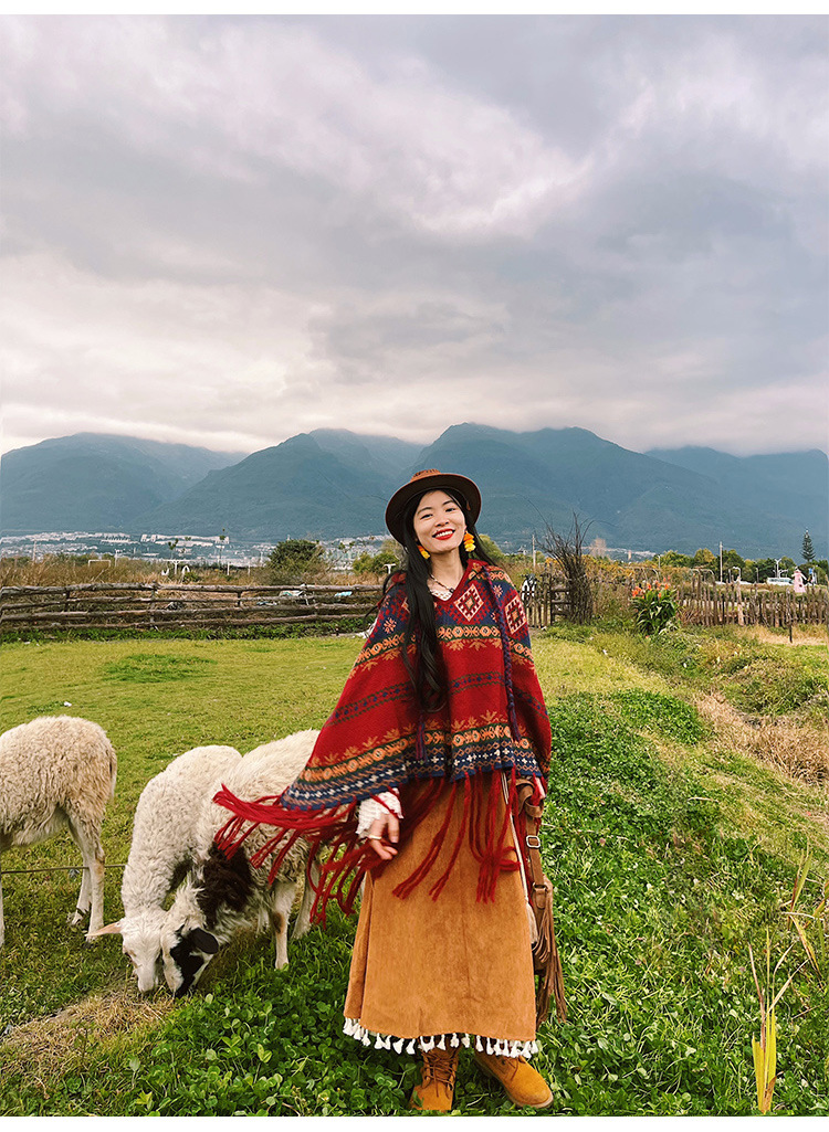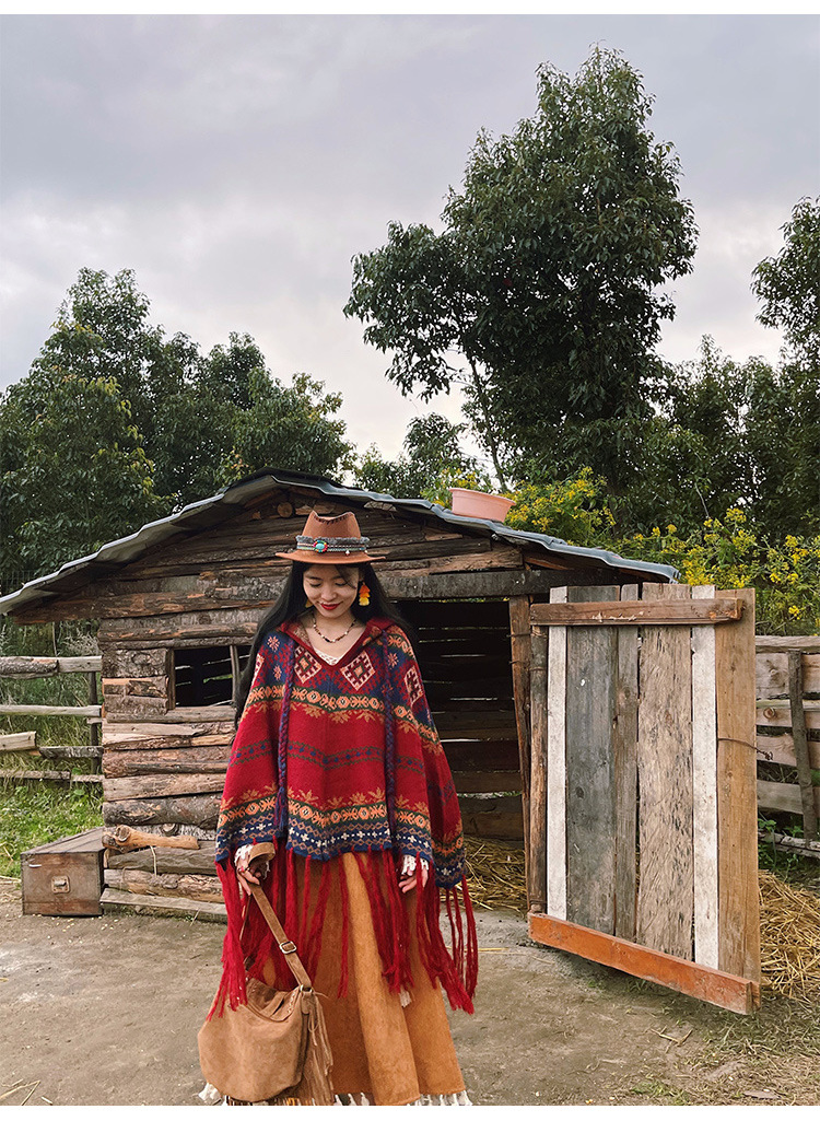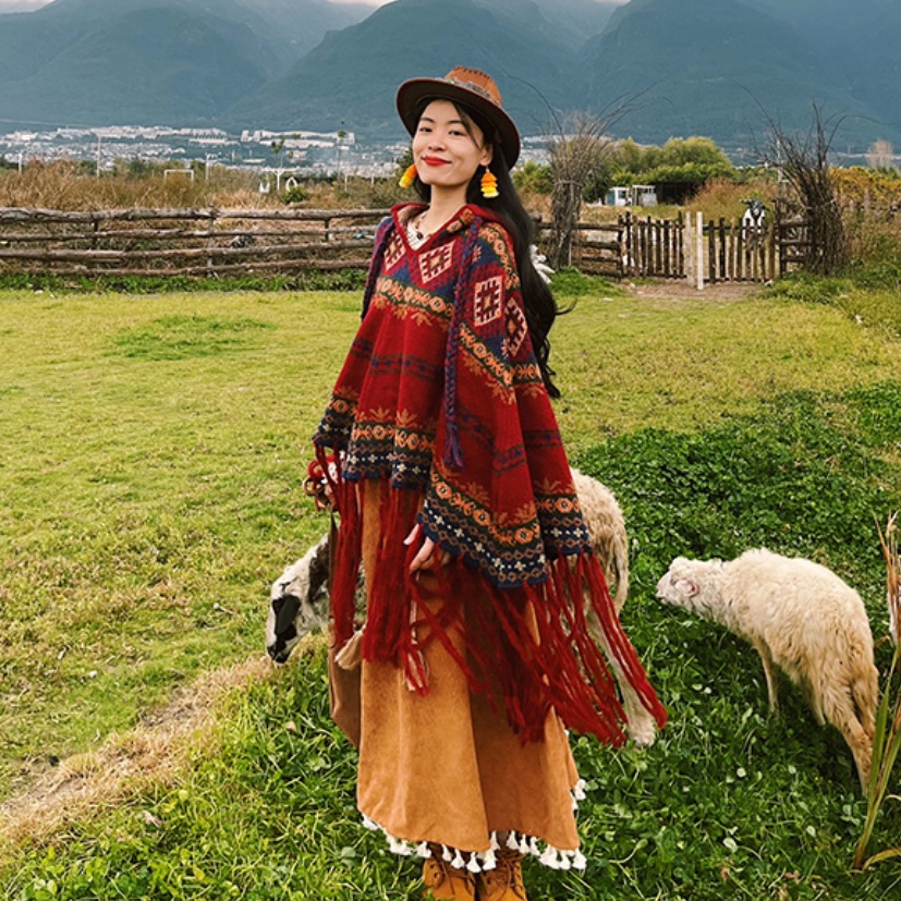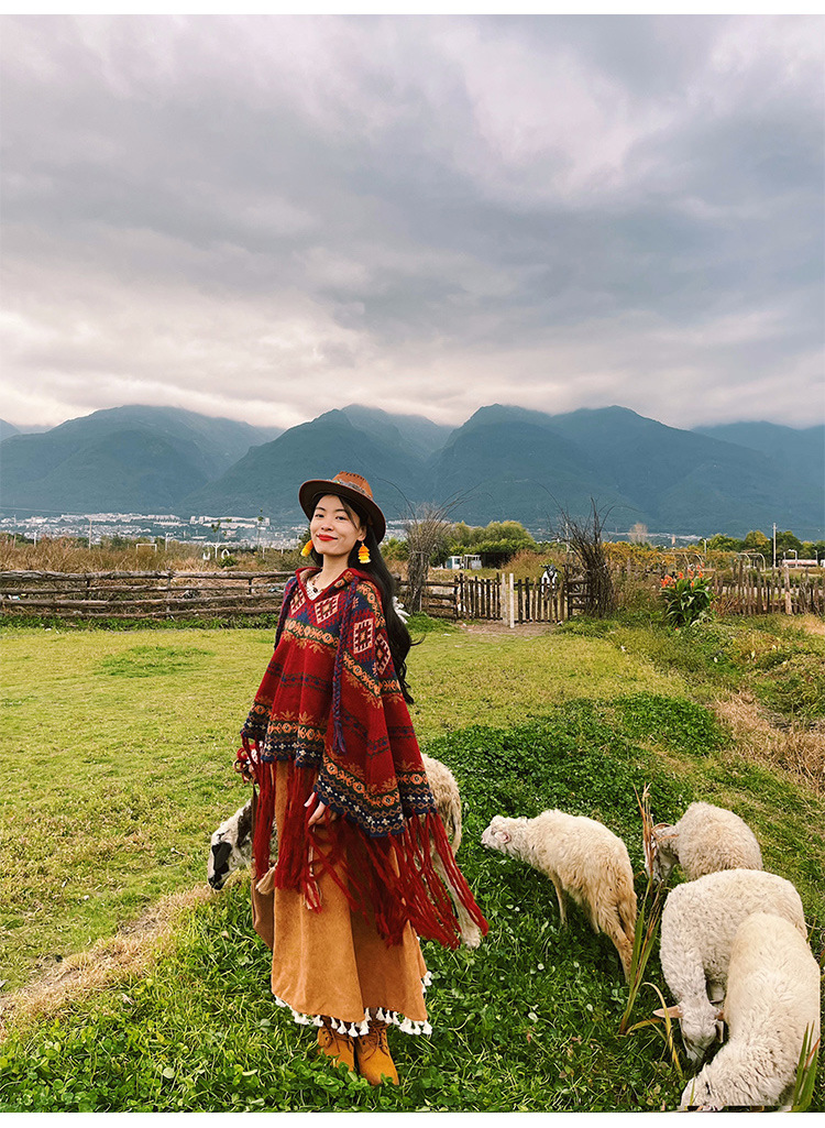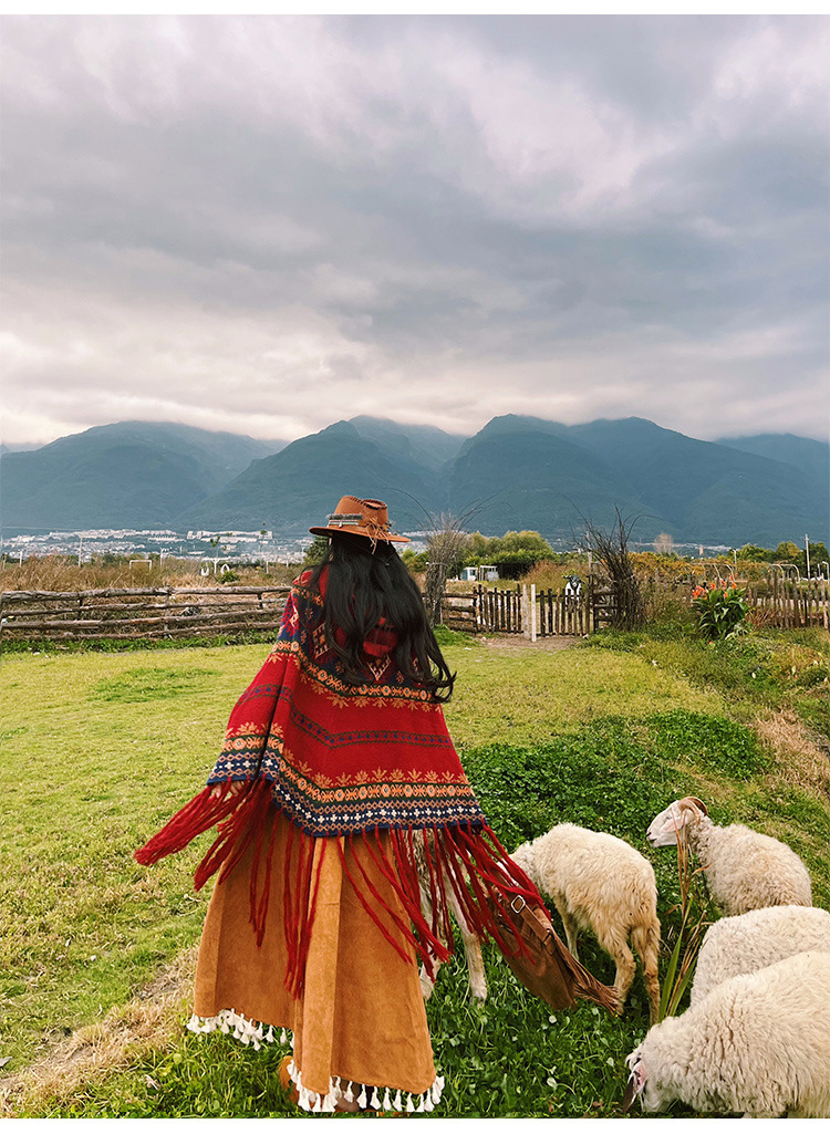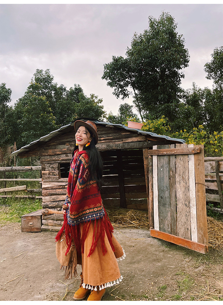 云南西藏青海湖茶卡旅游保暖围巾女复古红色民族风流苏春秋季披肩