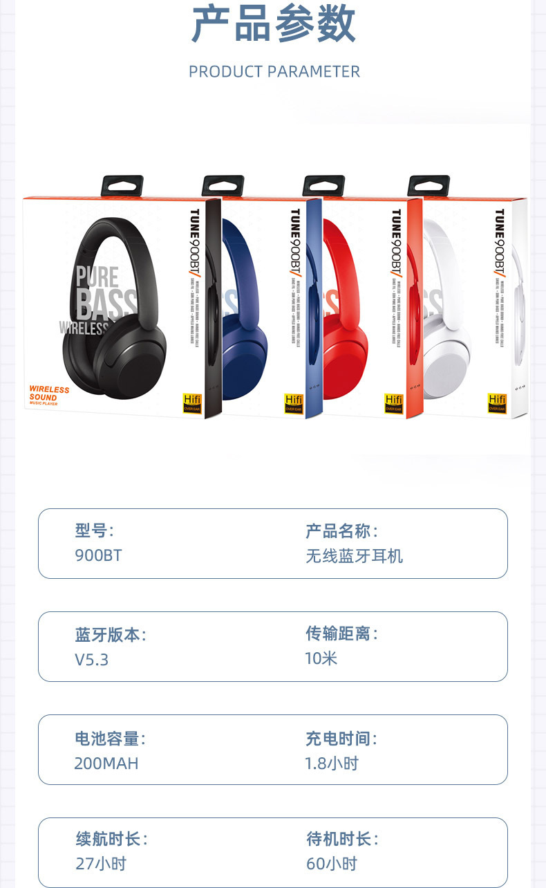 跨境爆款头戴式无线蓝牙耳机900BT 记忆连接HIFI运动长续航低延迟
