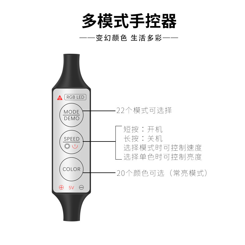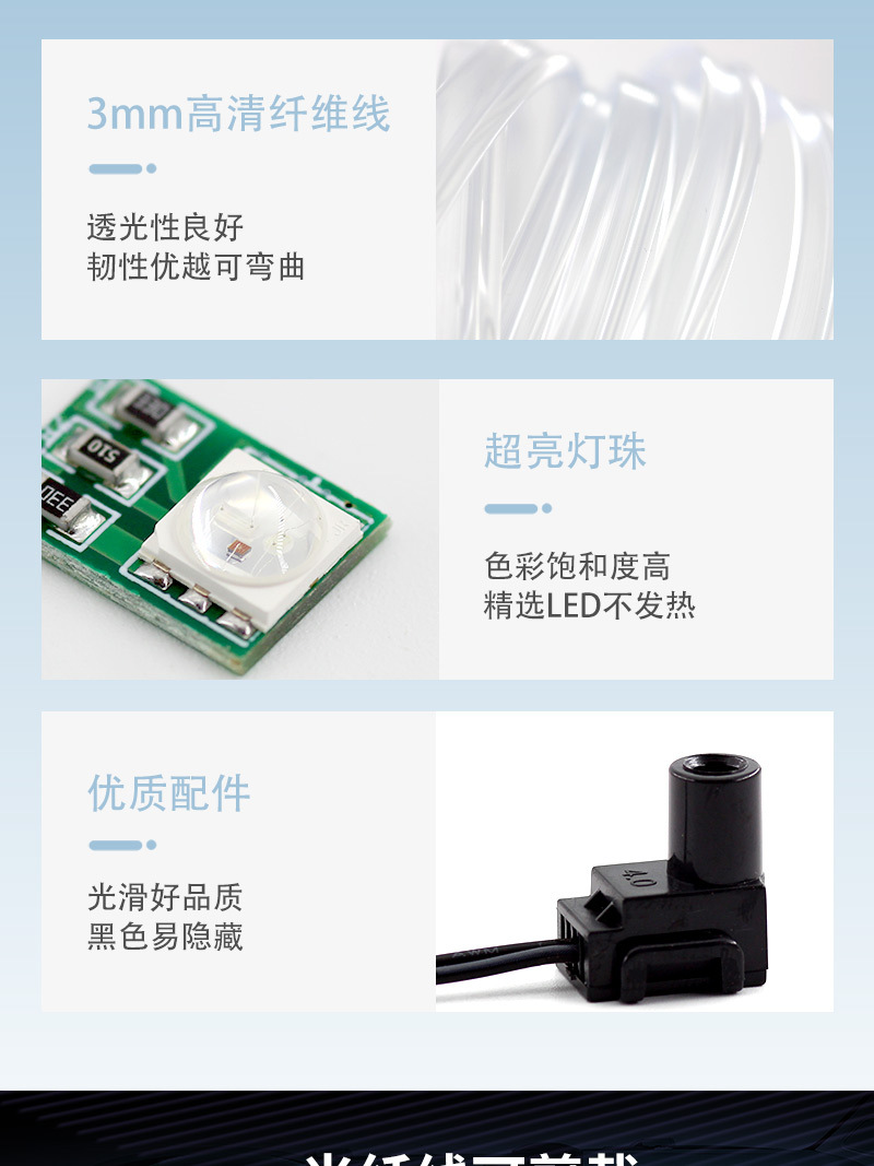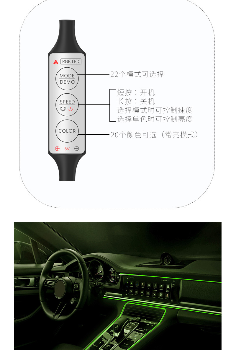 产品报价不含税,一拖一三键款中控氛围灯,按键控制,22种模式可以切换,采用3.0的光纤高亮款,20种单色可以选择,可调节亮度速度开光,具有断电记忆功能,USB插口设计,挂式包装,现正热卖款