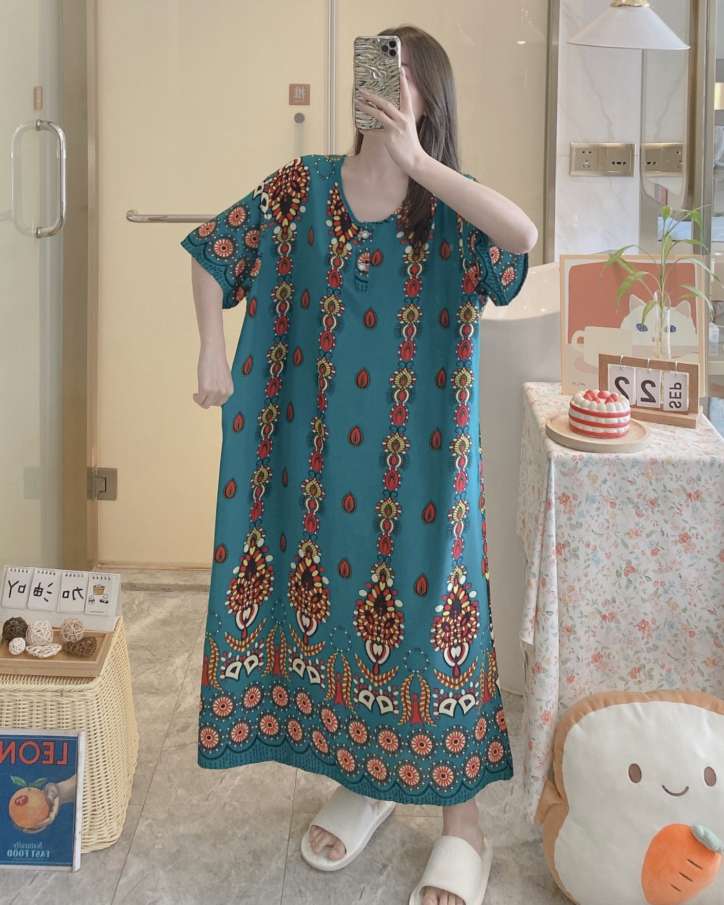 女夏棉绸睡裙短袖套头睡衣大码阿拉伯长裙可外穿人棉亚马逊家居服