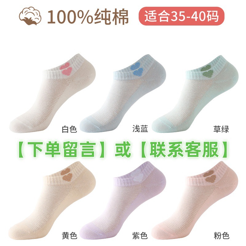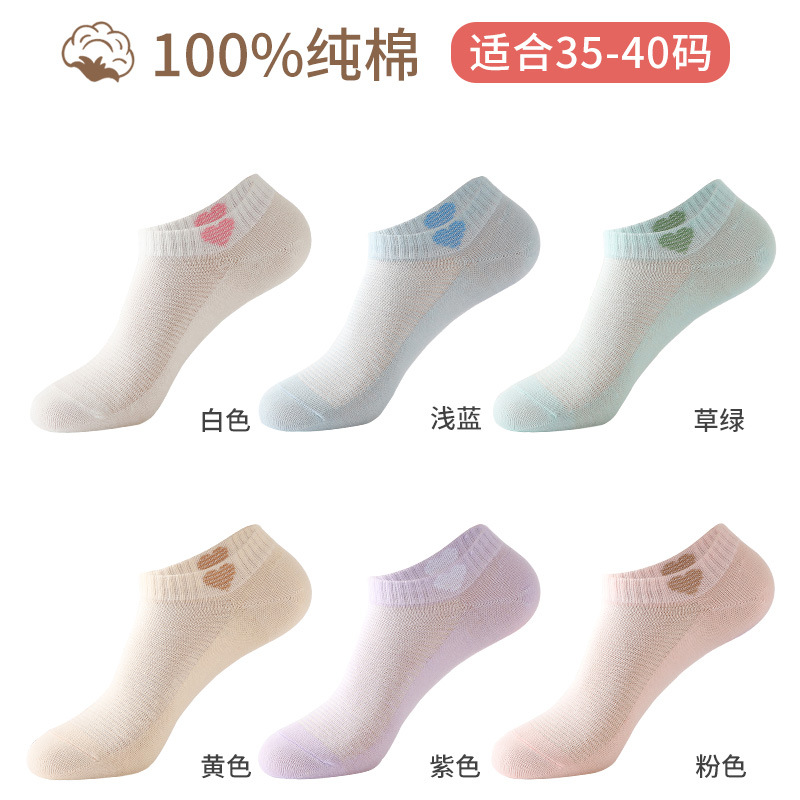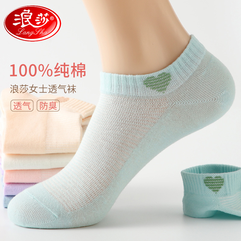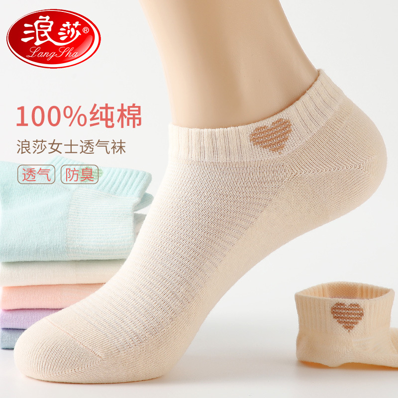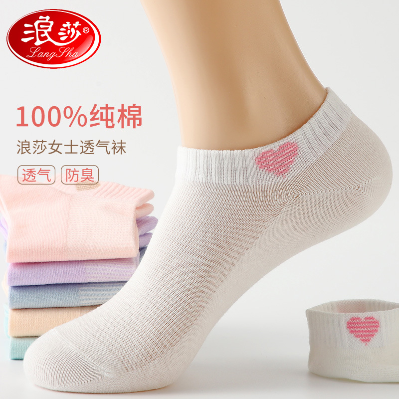 浪莎袜子女夏季薄款棉袜船袜不掉跟韩系爱心图案纯棉女袜网眼透气