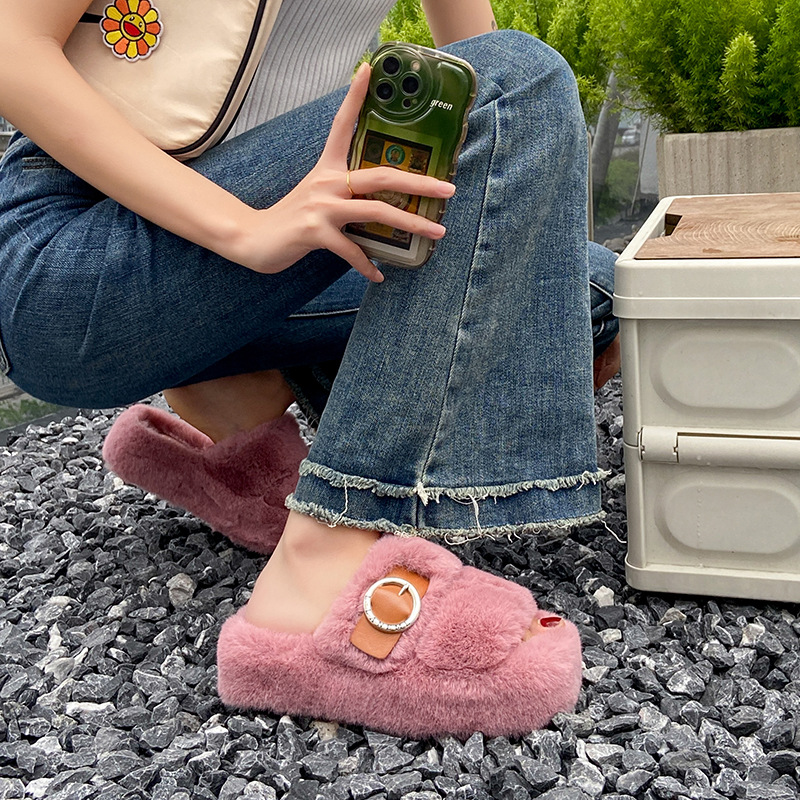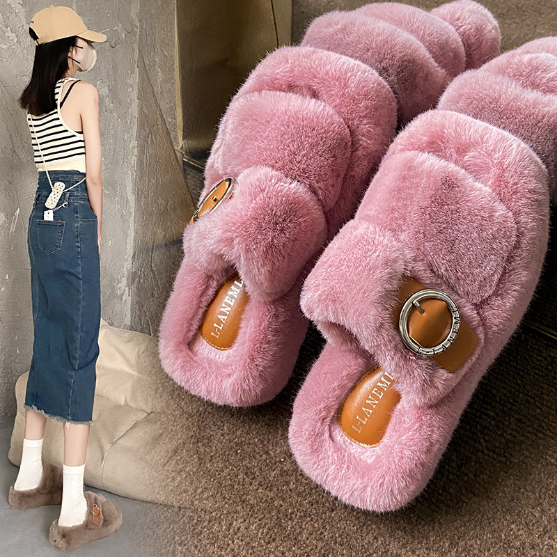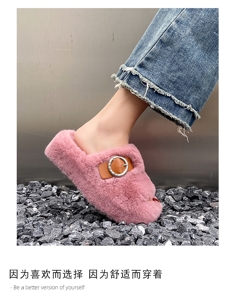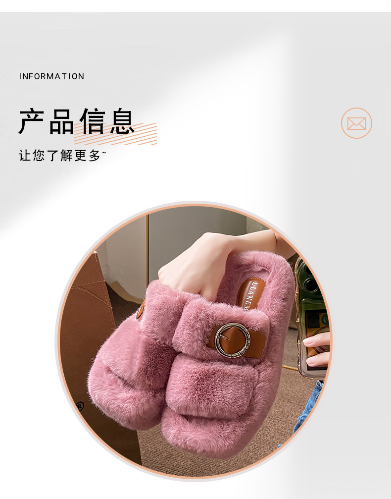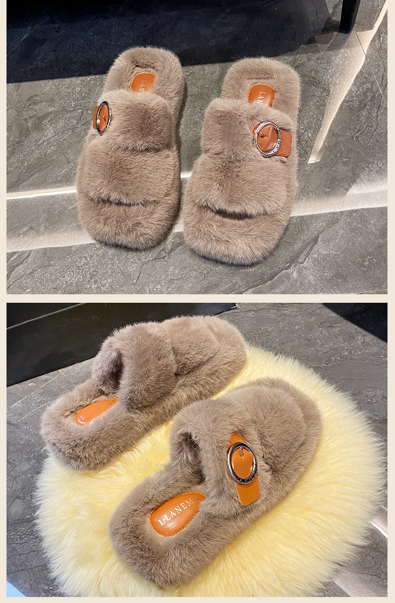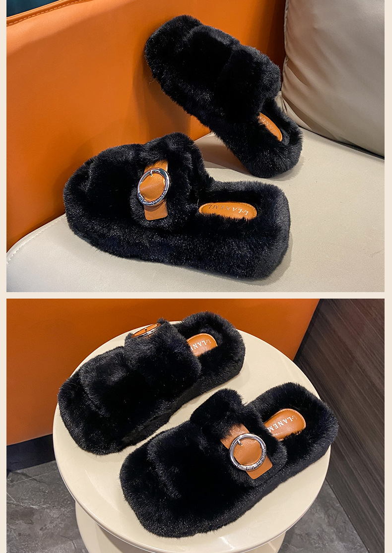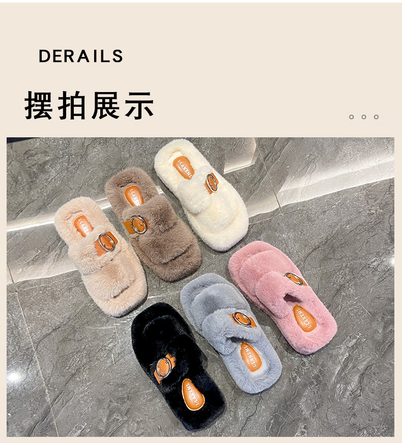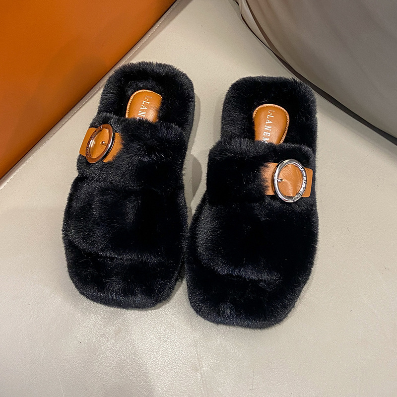 2023秋冬新款厚底方头内里加绒皮带扣舒适休闲时尚网红女毛毛拖鞋