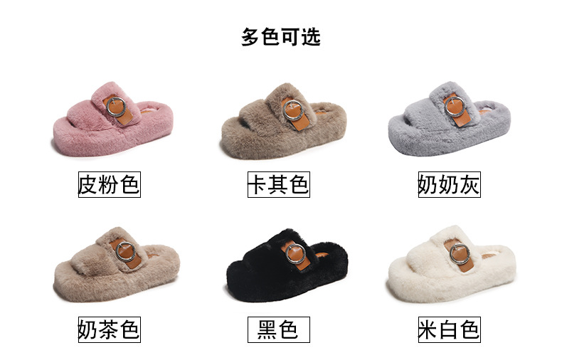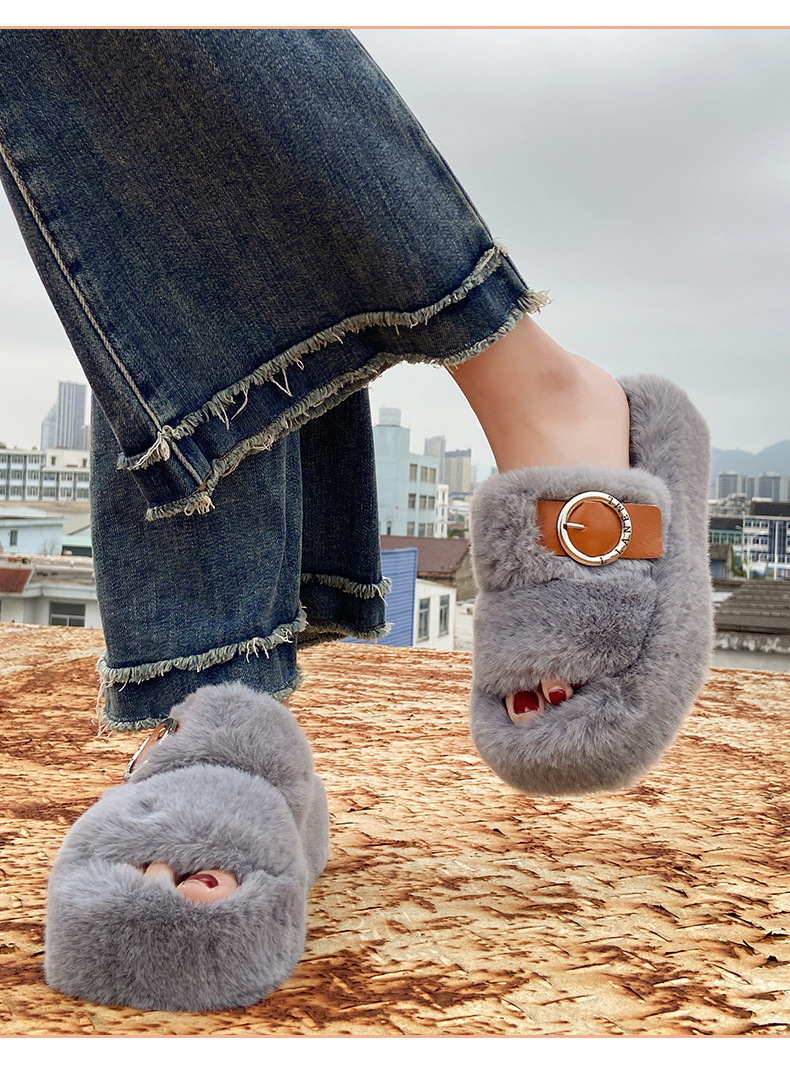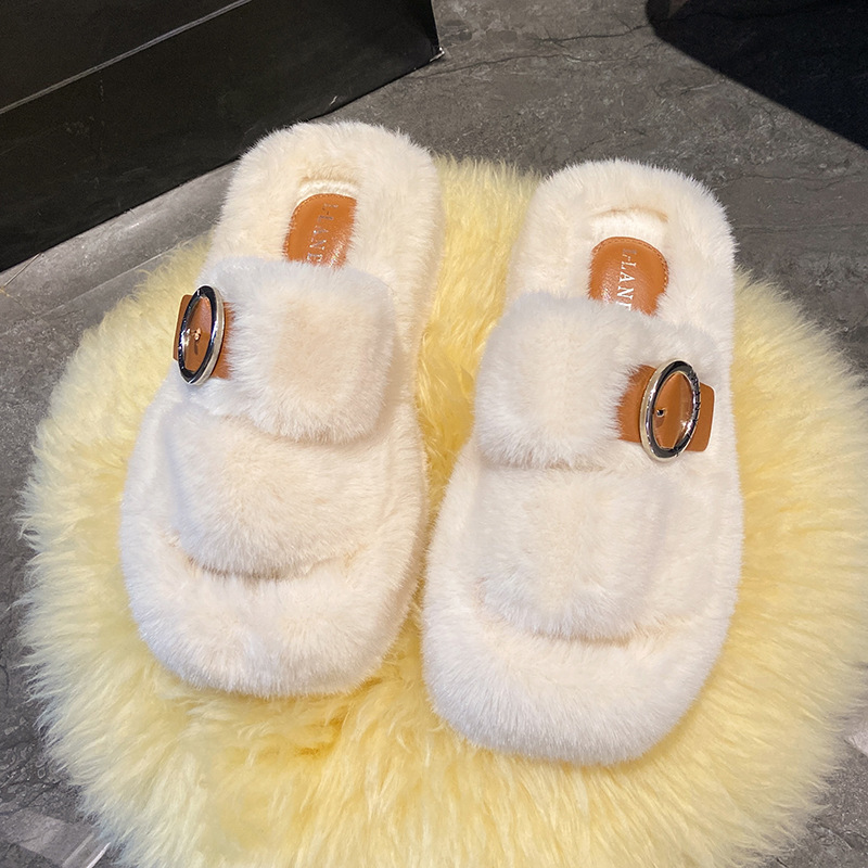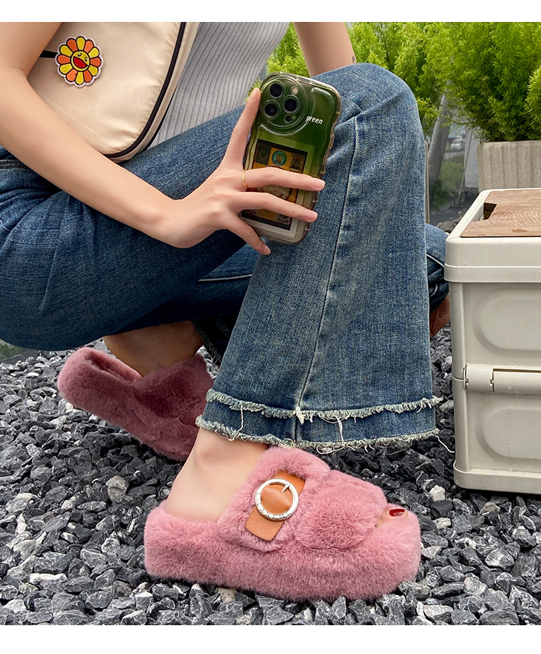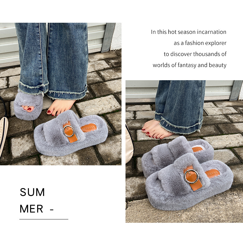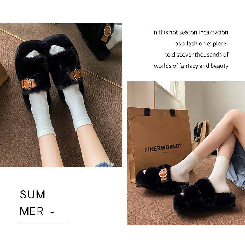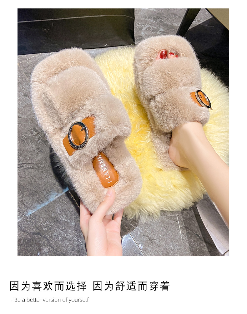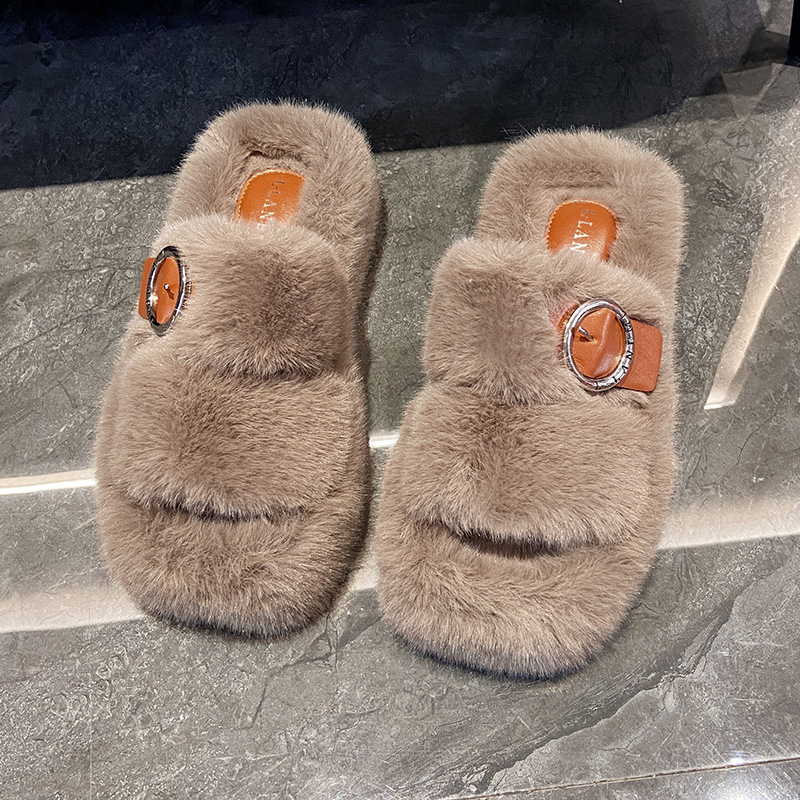 2023秋冬新款厚底方头内里加绒皮带扣舒适休闲时尚网红女毛毛拖鞋
