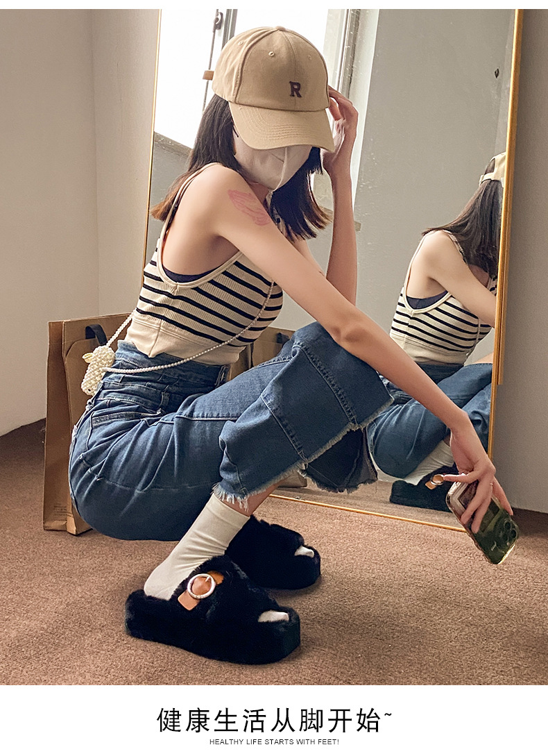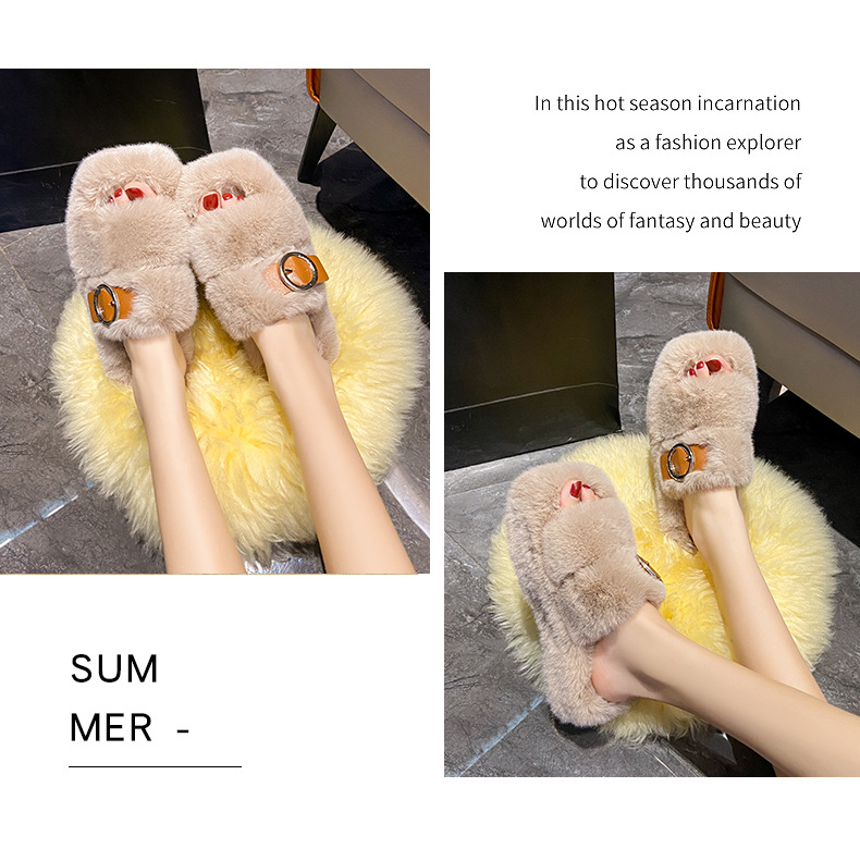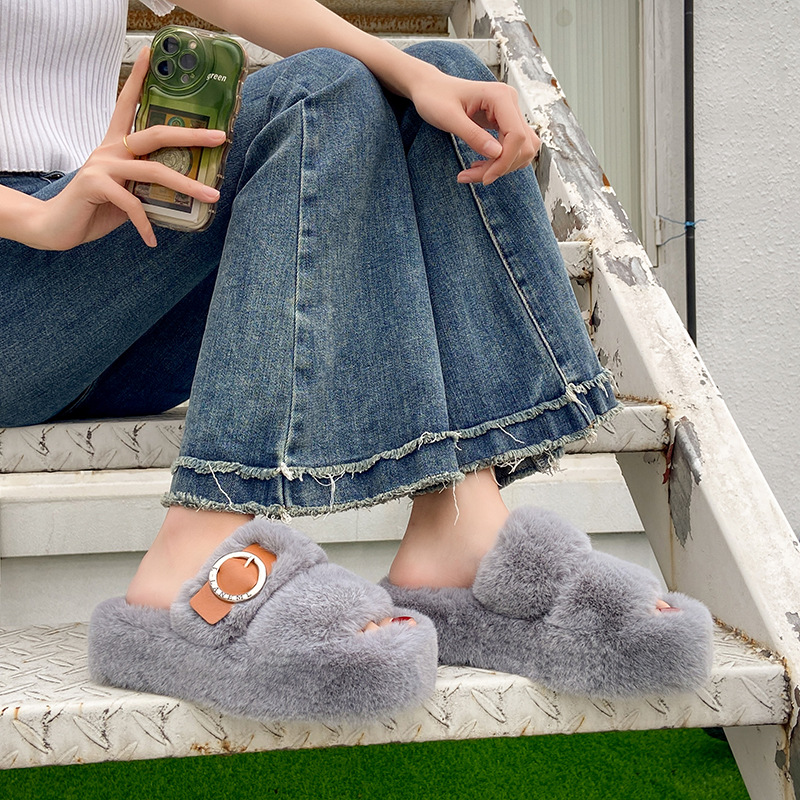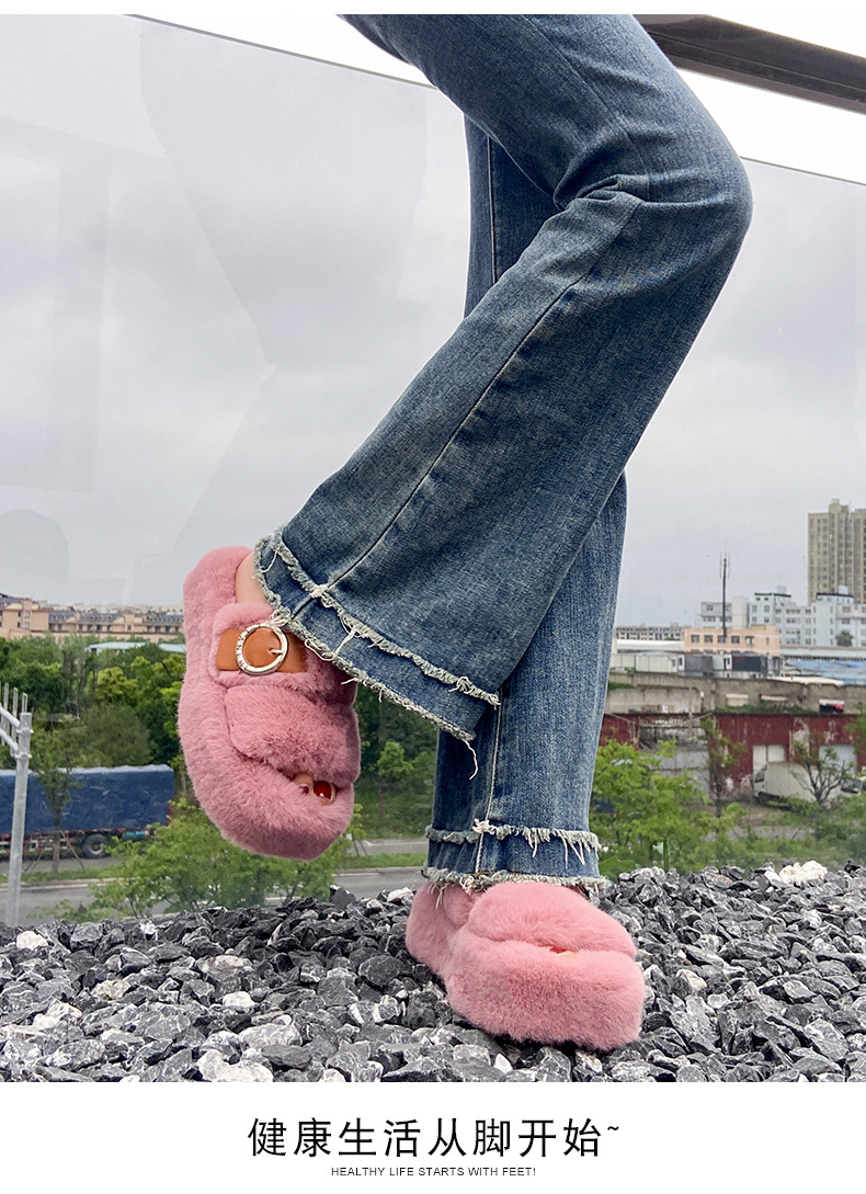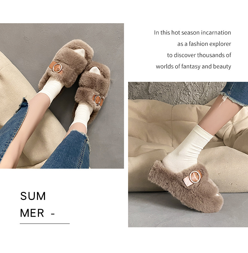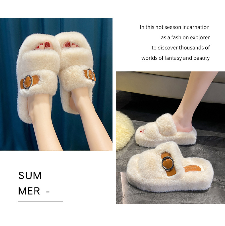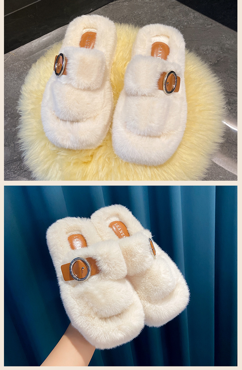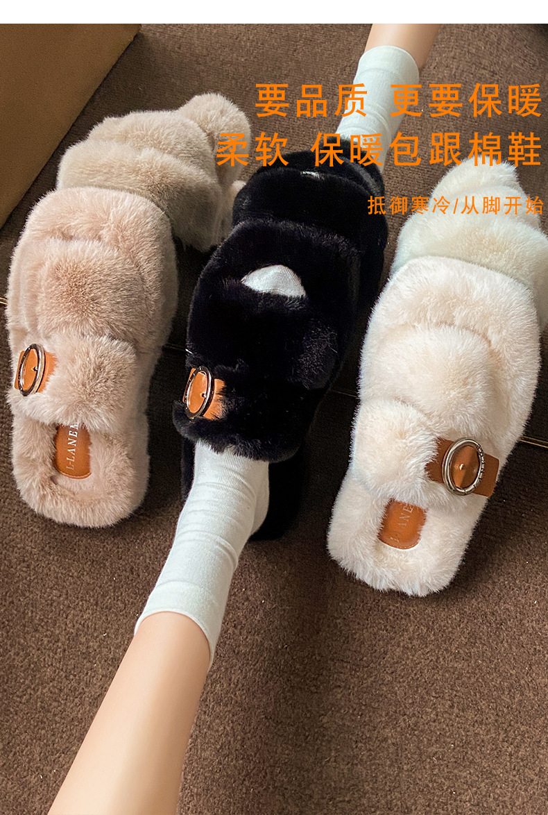 2023秋冬新款厚底方头内里加绒皮带扣舒适休闲时尚网红女毛毛拖鞋