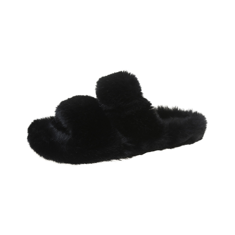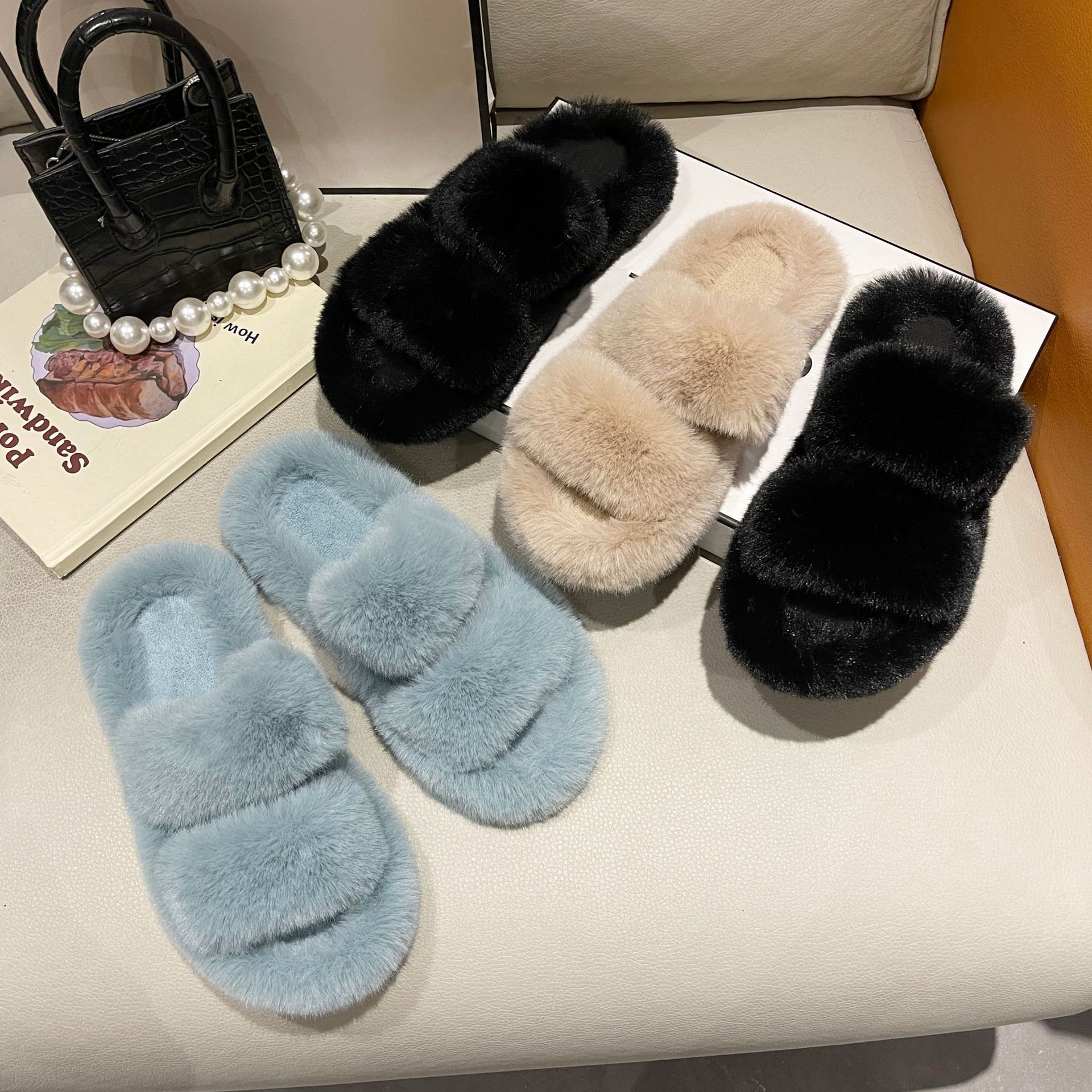 大码拖鞋女双条外贸平底一字内室保暖拖鞋秋冬毛毛拖鞋女厂家批发