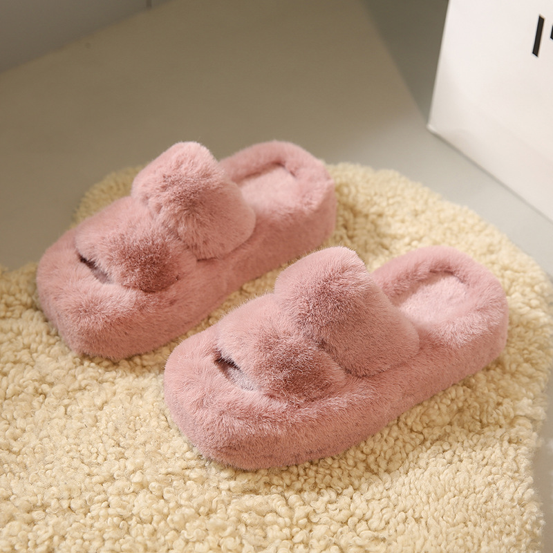 外贸跨境大码秋冬新款方头加绒双条加厚5厘米家居外穿毛毛拖鞋厂