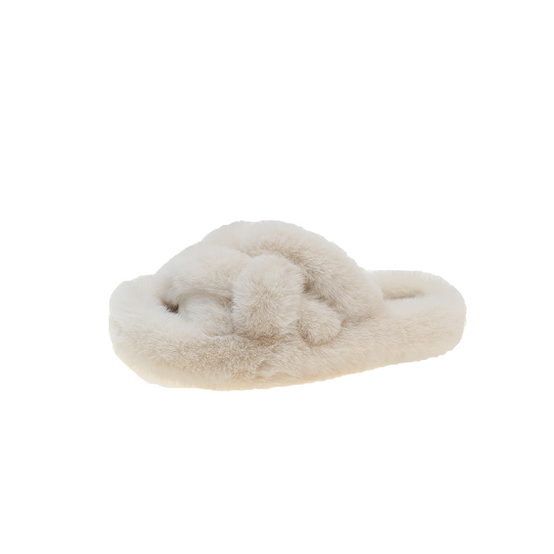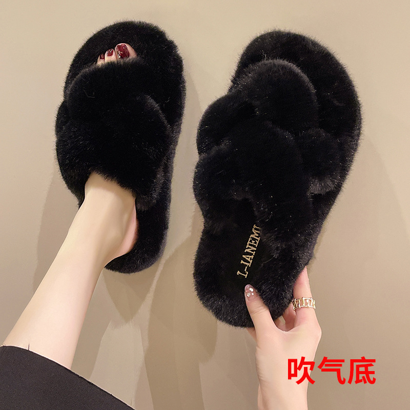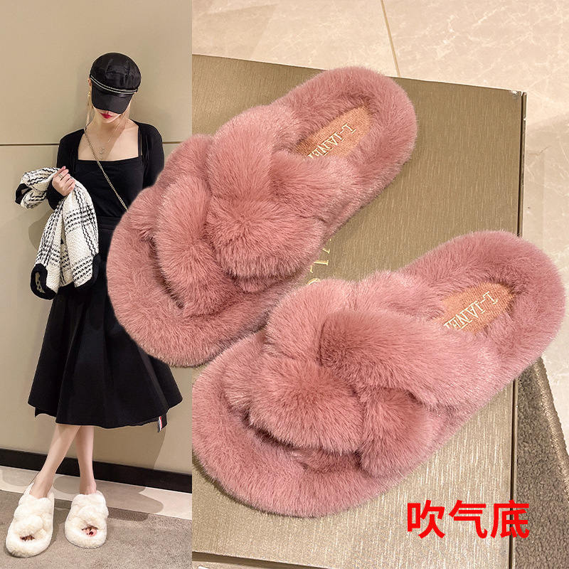 外贸大码毛毛拖鞋女2023秋冬季新款韩版外穿交叉厚底露趾拖鞋批发