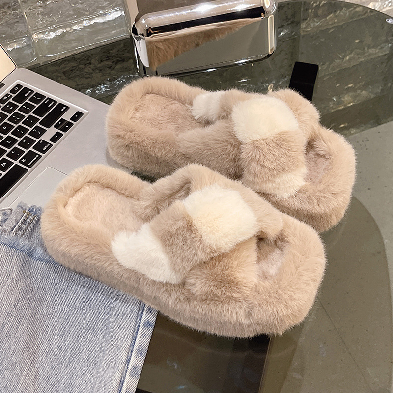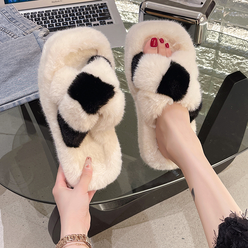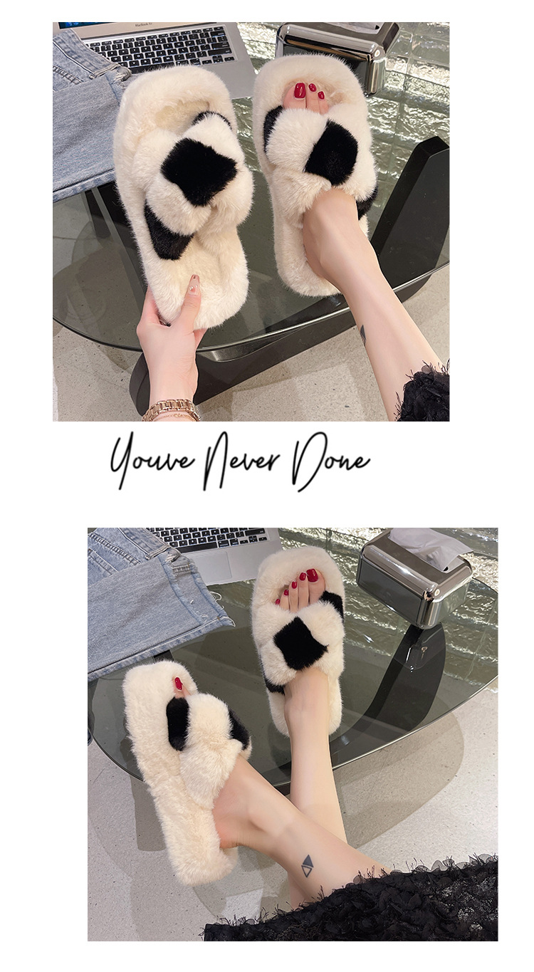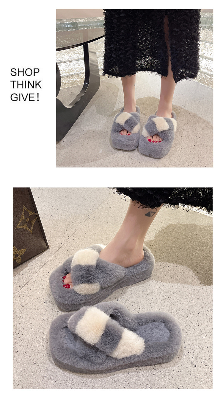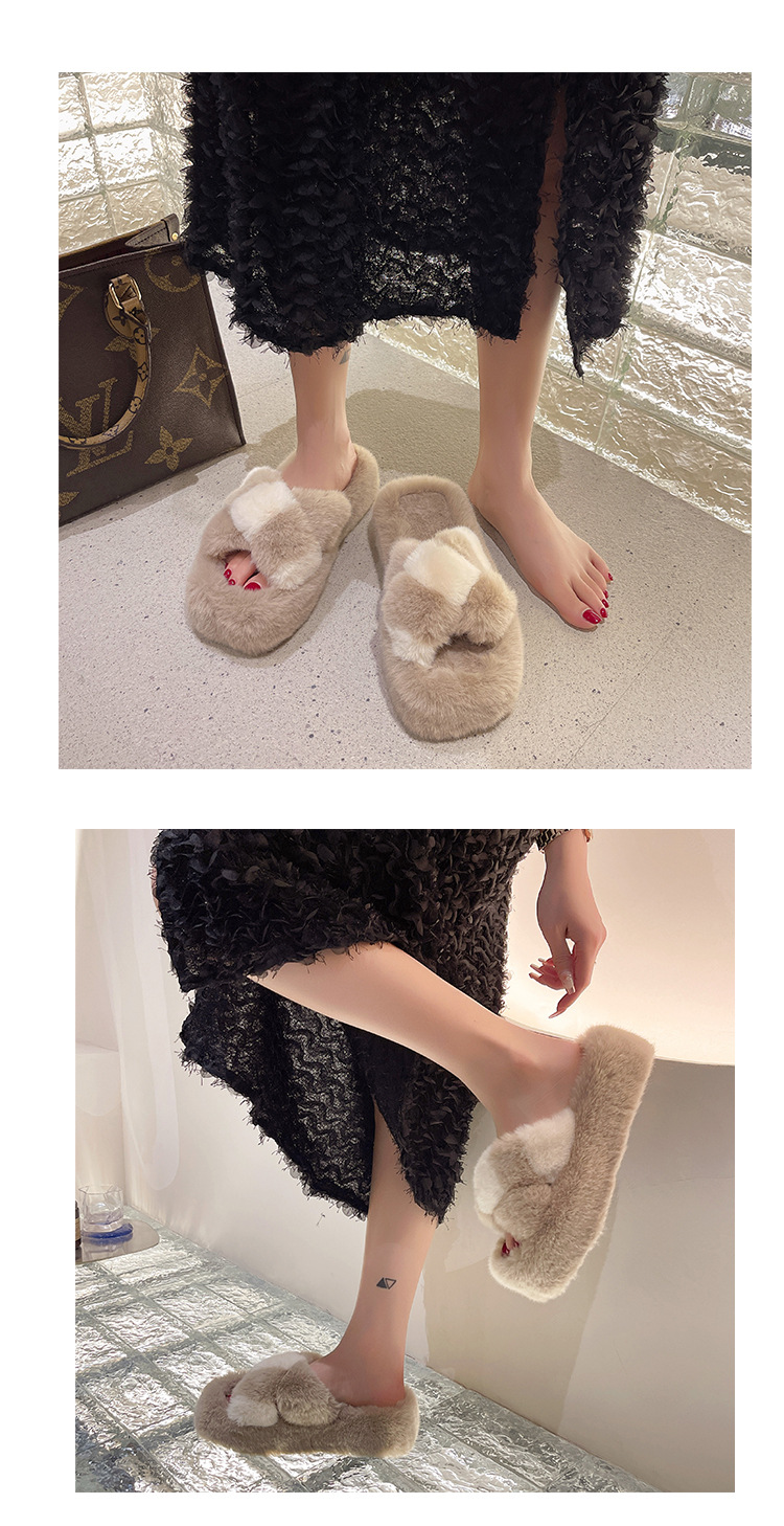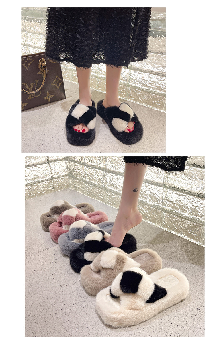 外贸跨境新款厚底大码拼色家居外穿新韩版百搭平底时尚毛毛拖鞋