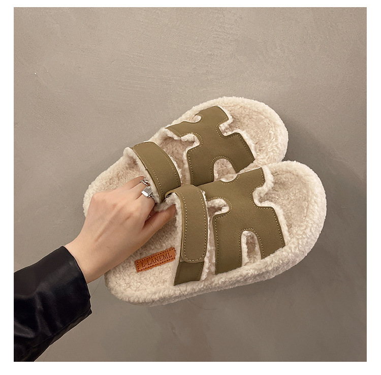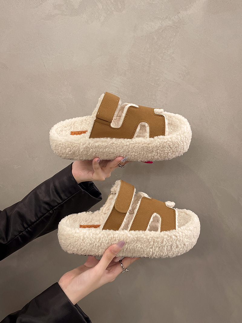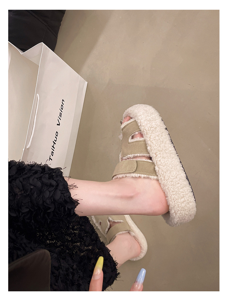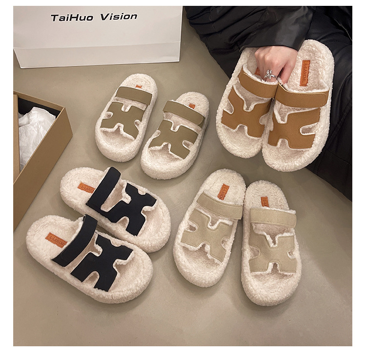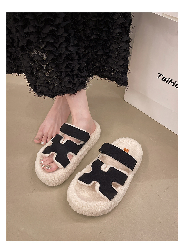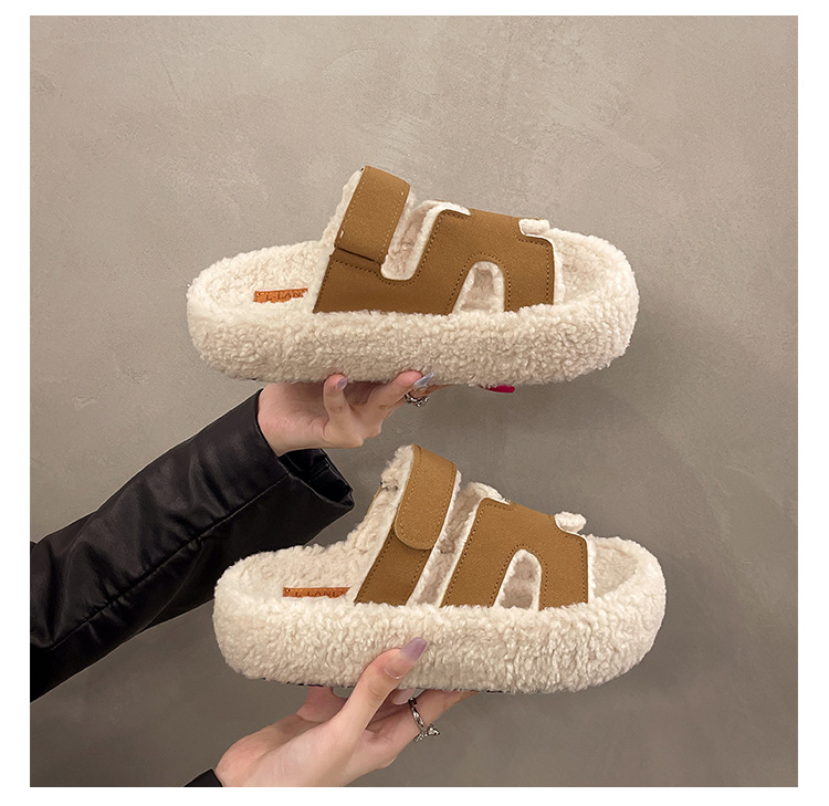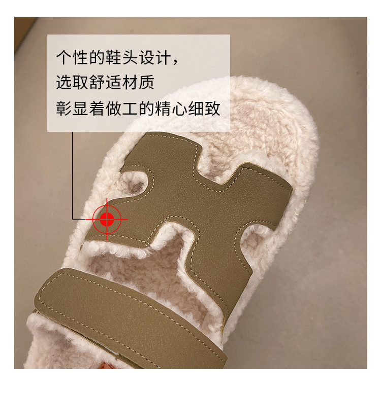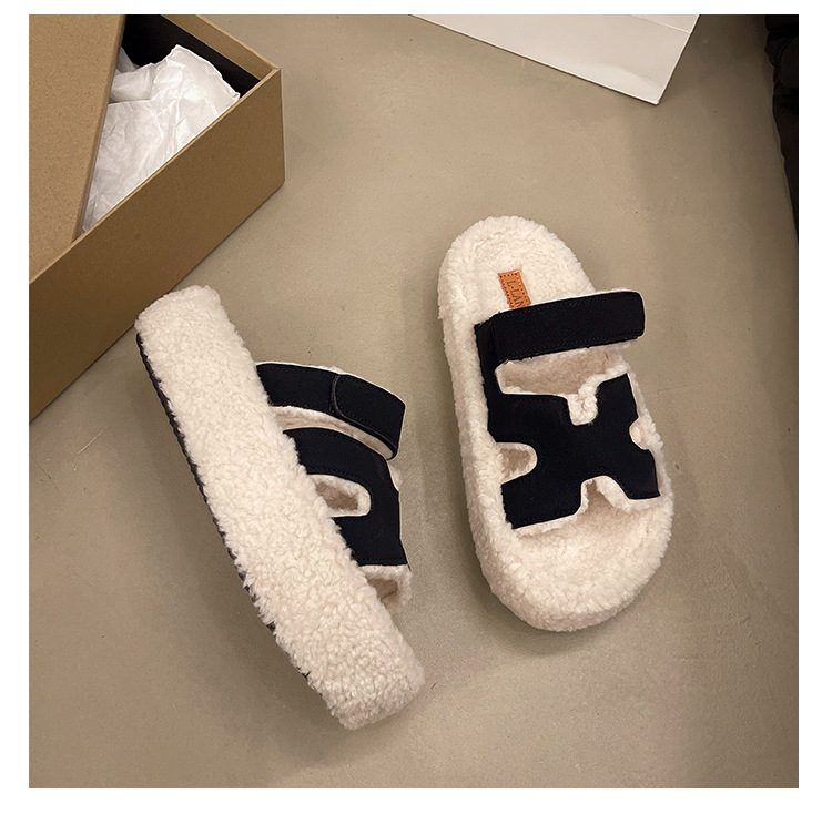 厚底毛毛鞋女2024年新款皮毛一体拼色外穿魔术贴拖鞋一脚蹬懒人鞋