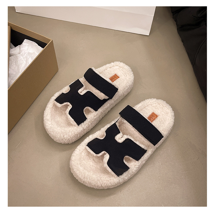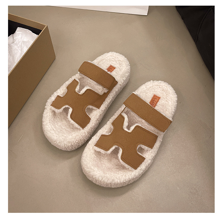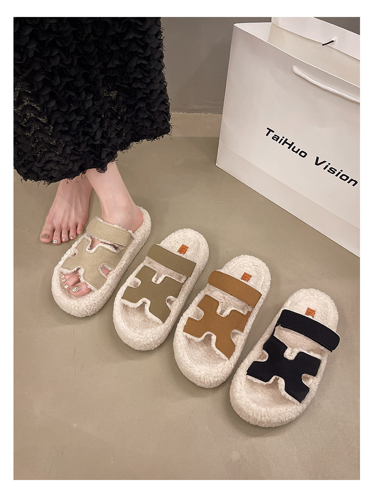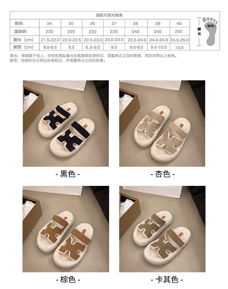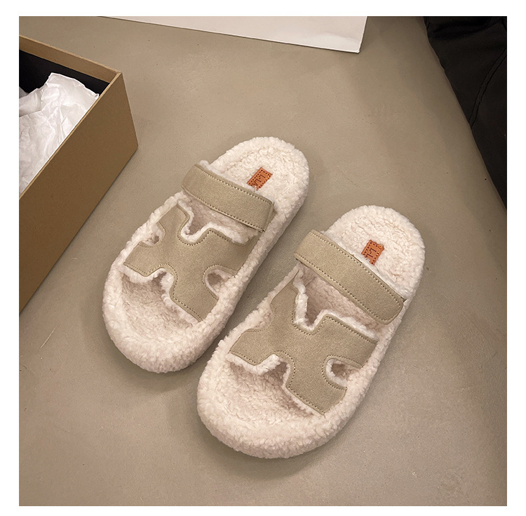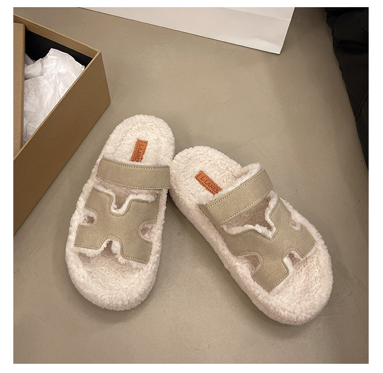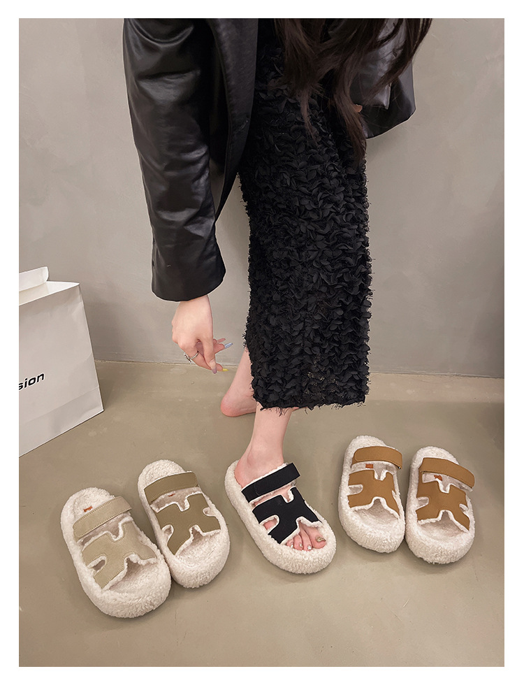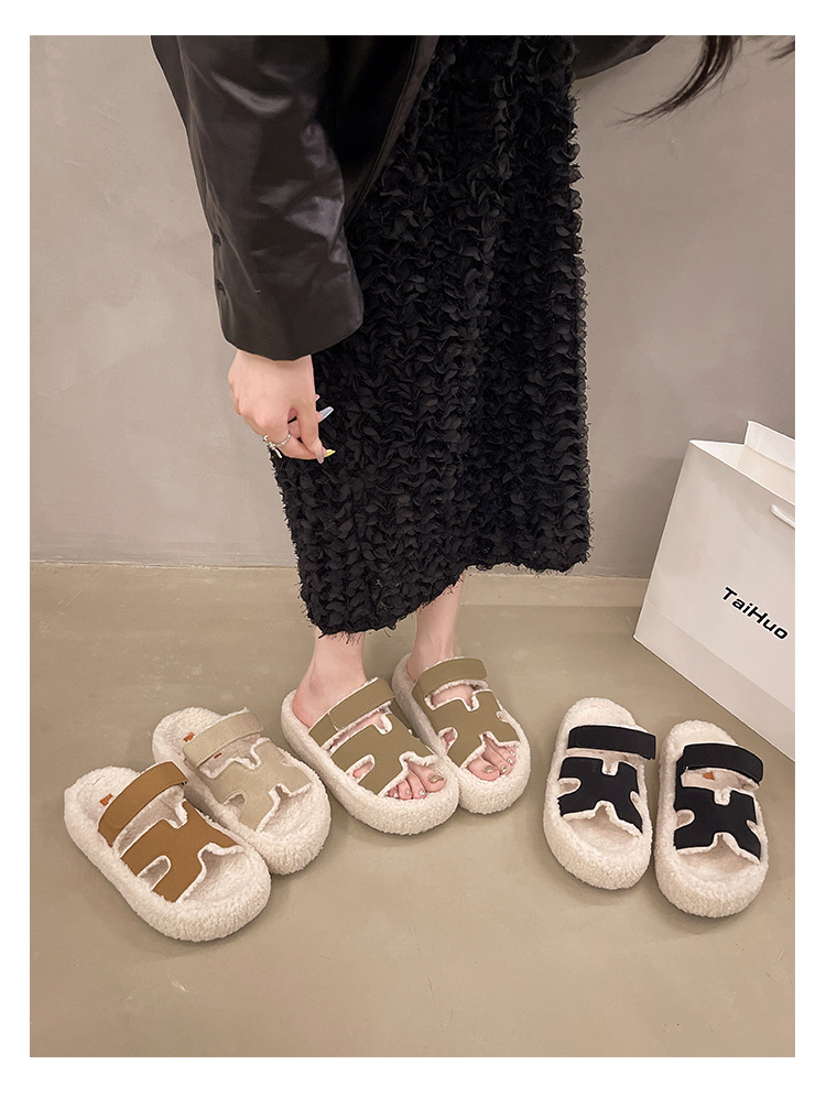 厚底毛毛鞋女2024年新款皮毛一体拼色外穿魔术贴拖鞋一脚蹬懒人鞋