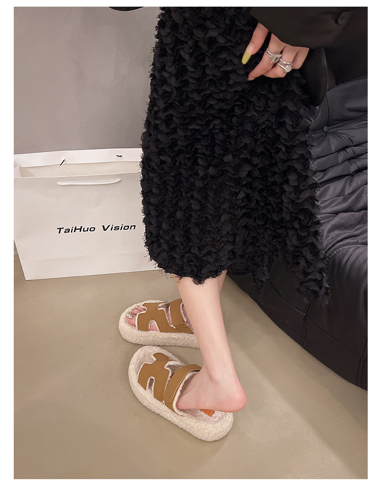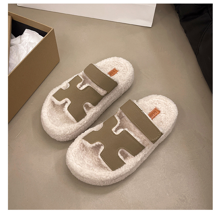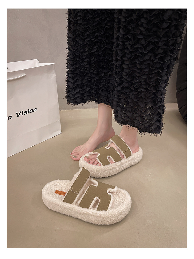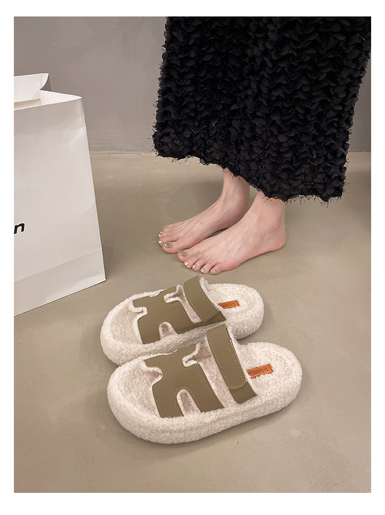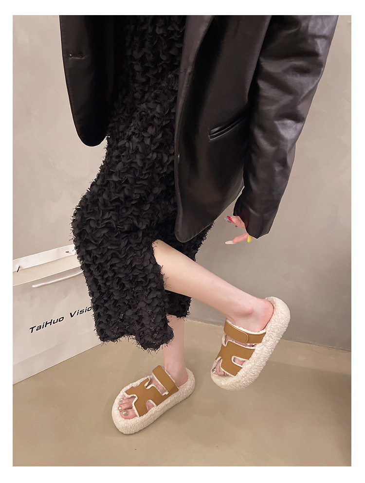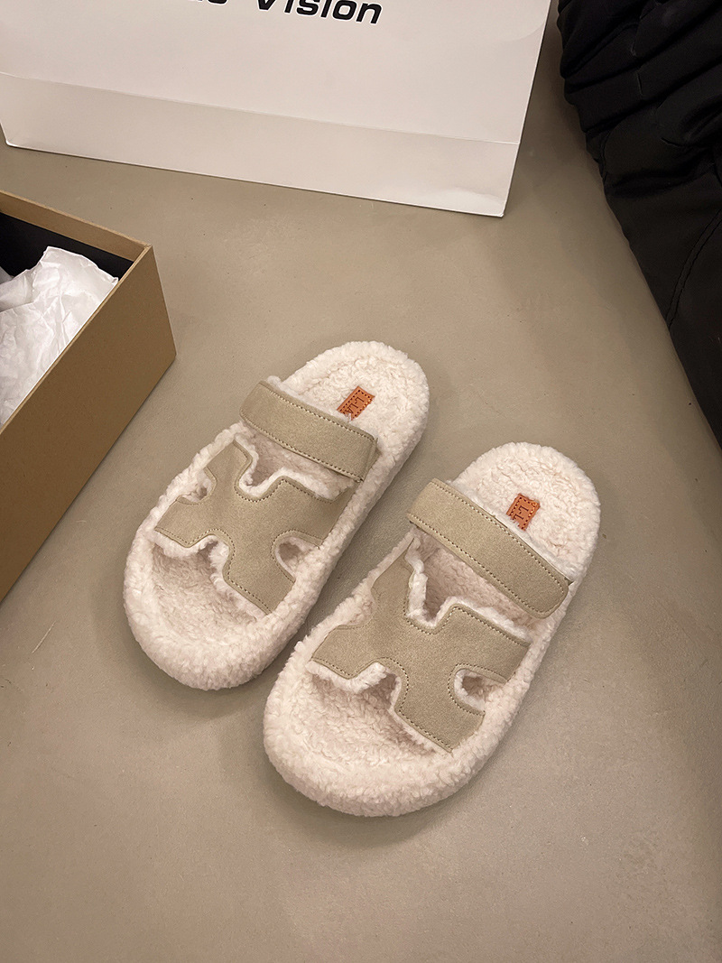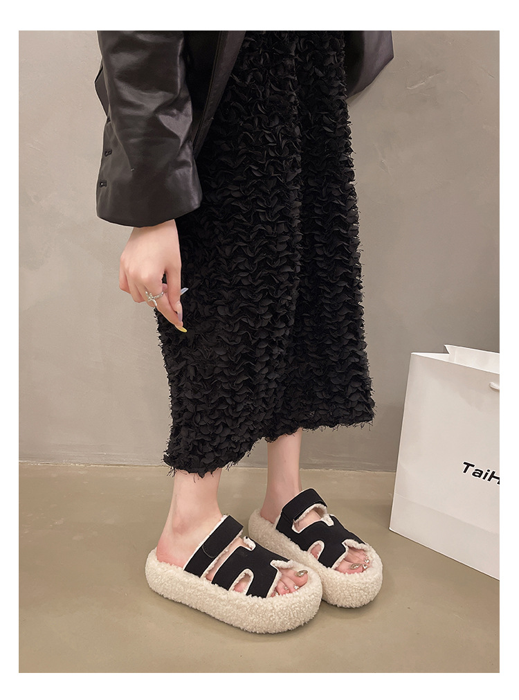 厚底毛毛鞋女2024年新款皮毛一体拼色外穿魔术贴拖鞋一脚蹬懒人鞋