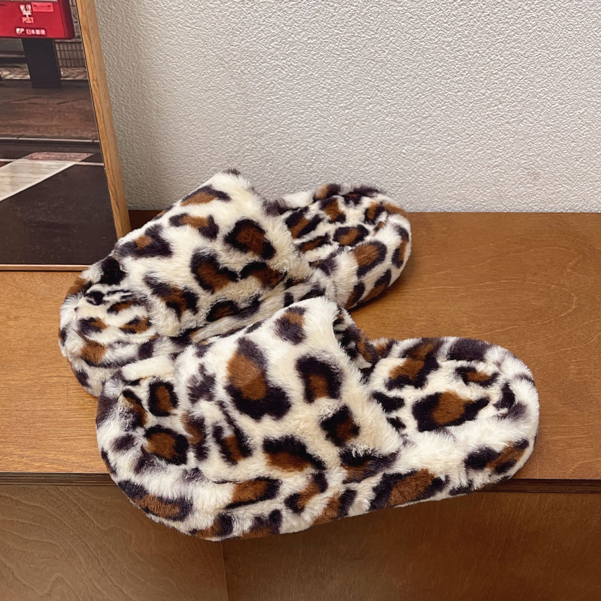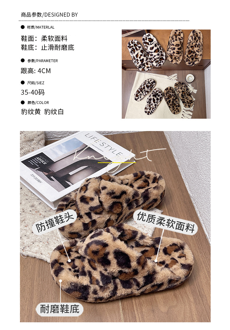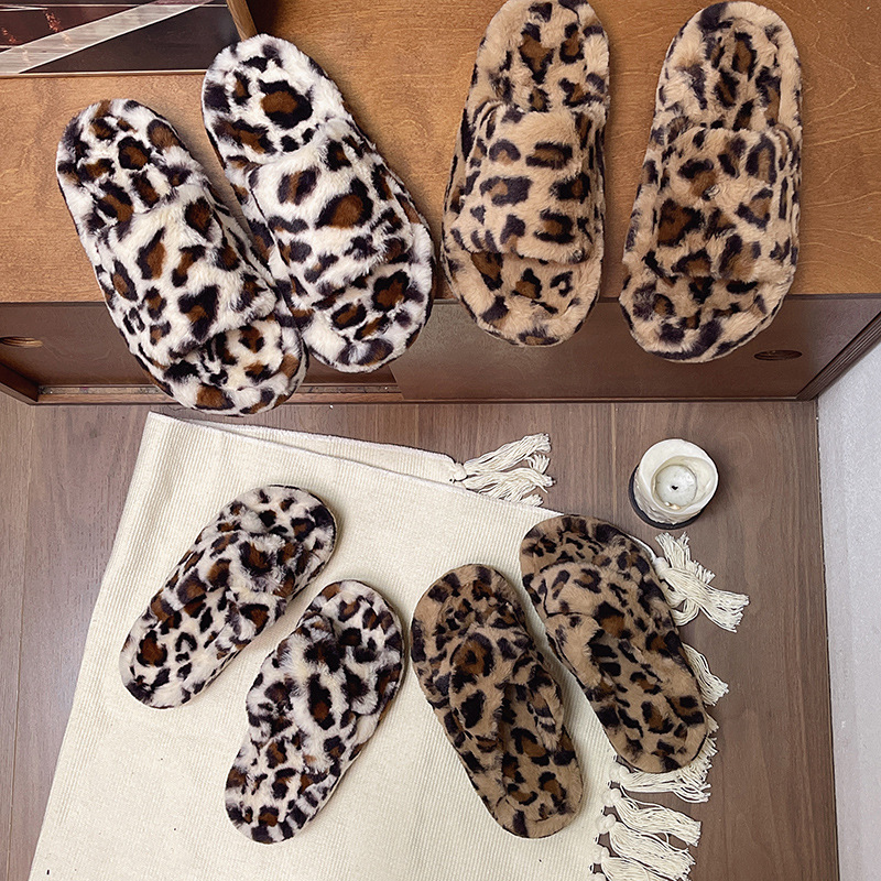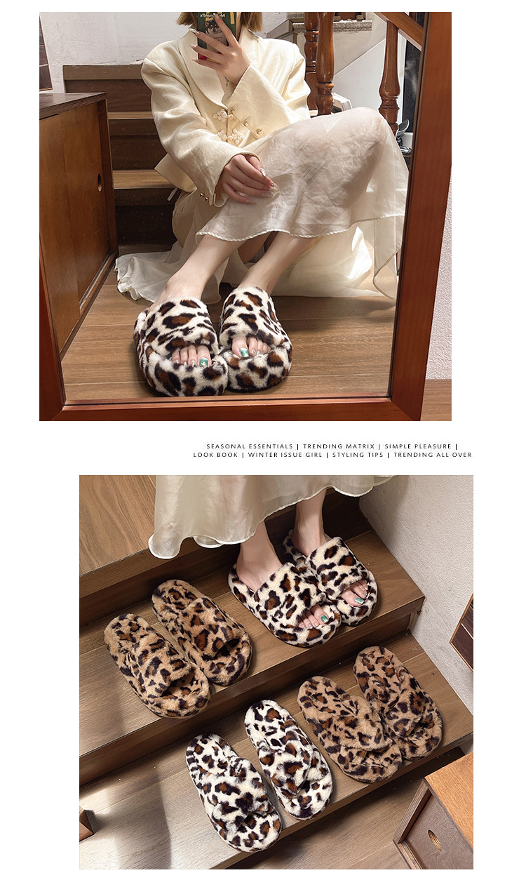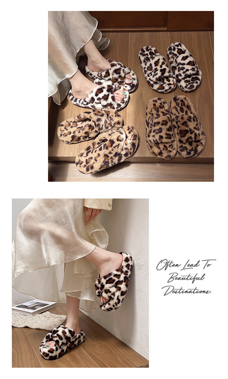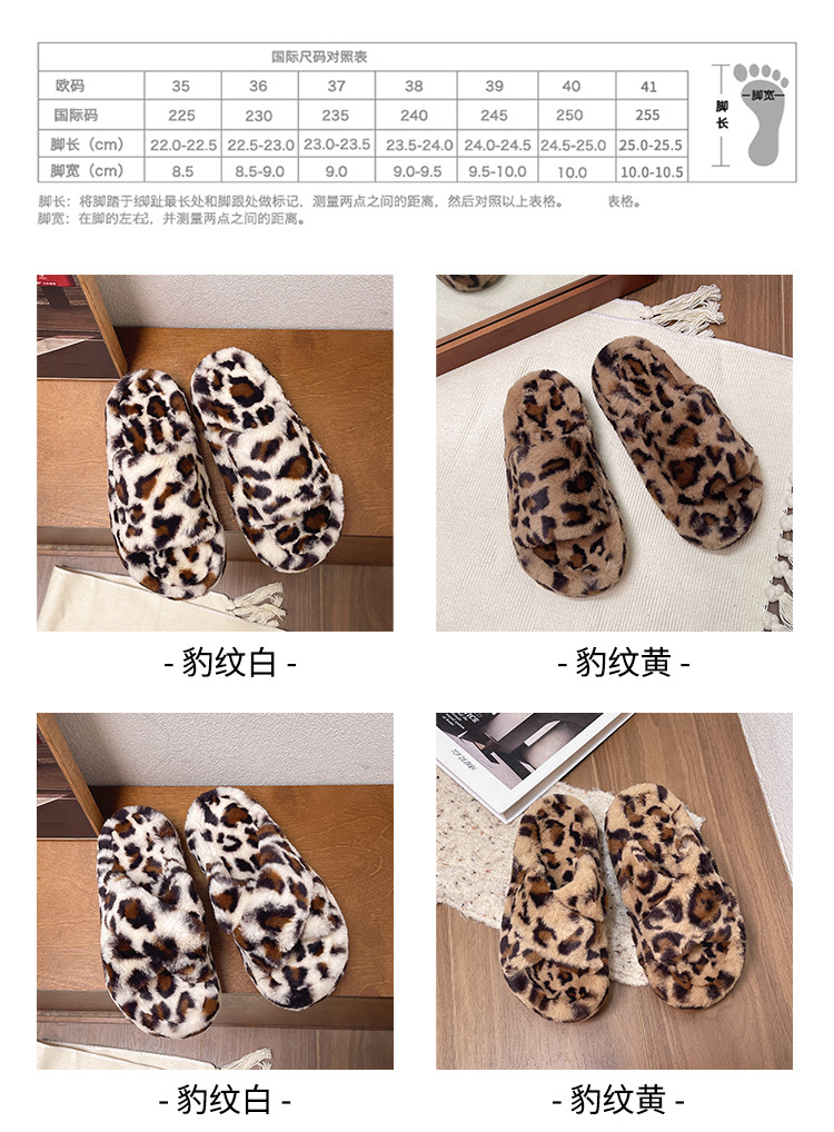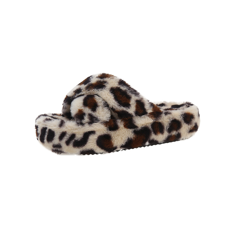 亚马逊跨境外贸大码豹纹交叉一字毛毛厚底露趾毛绒拖鞋女毛毛拖鞋