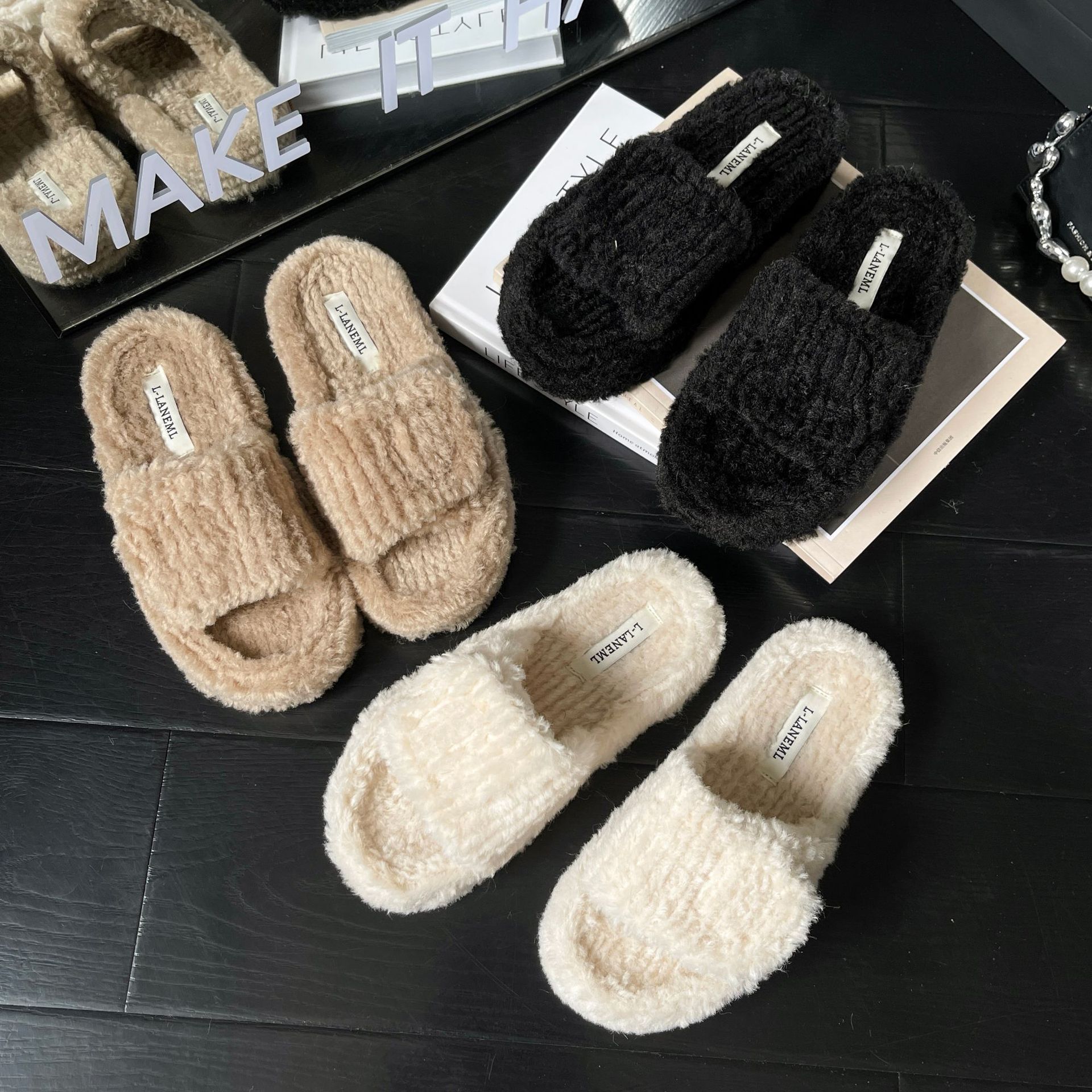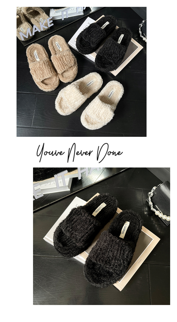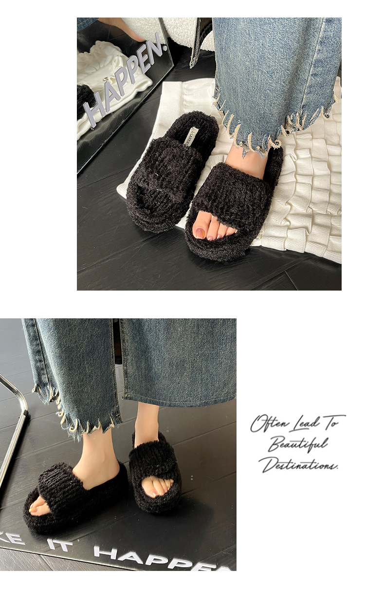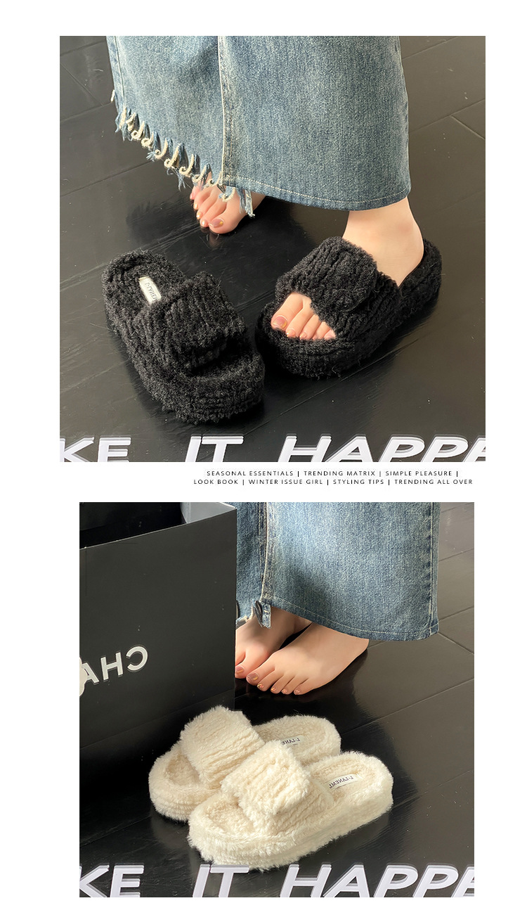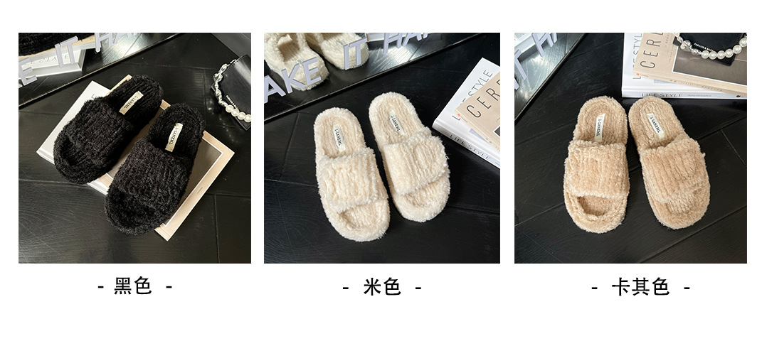 新款时尚羊羔毛跨境大码一字魔术贴舒适柔软毛毛拖鞋外穿居家批发