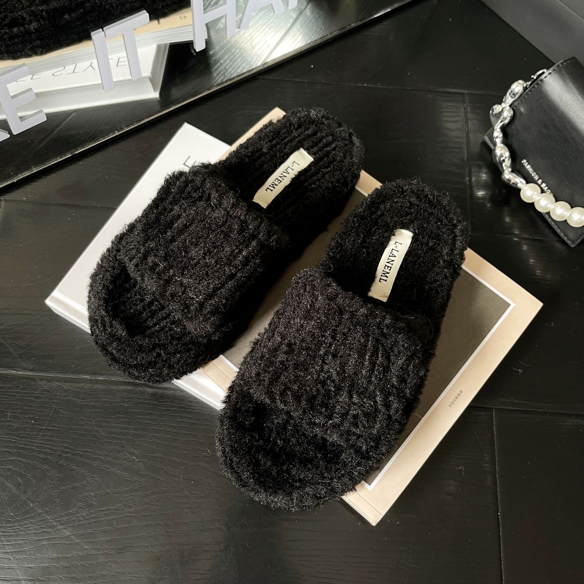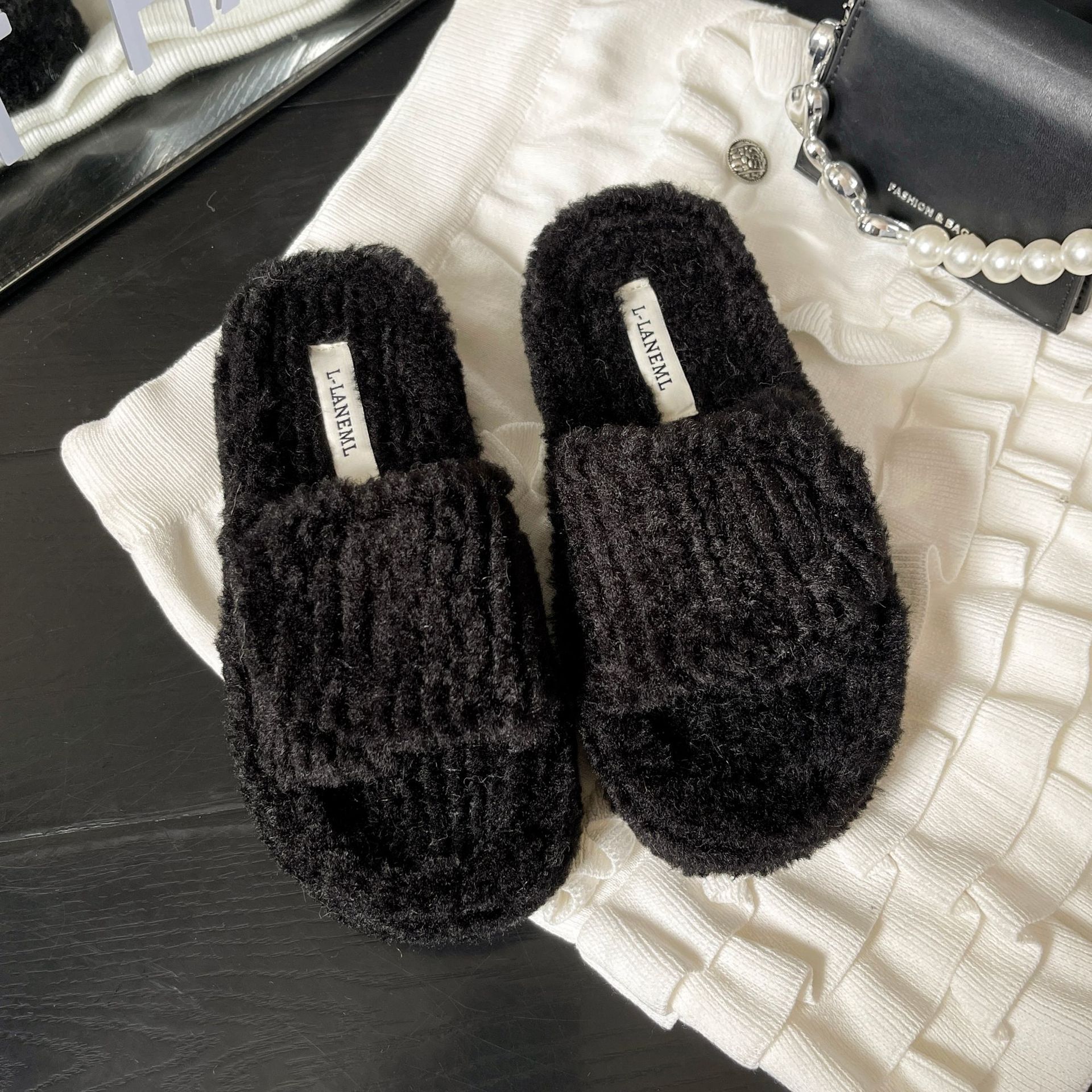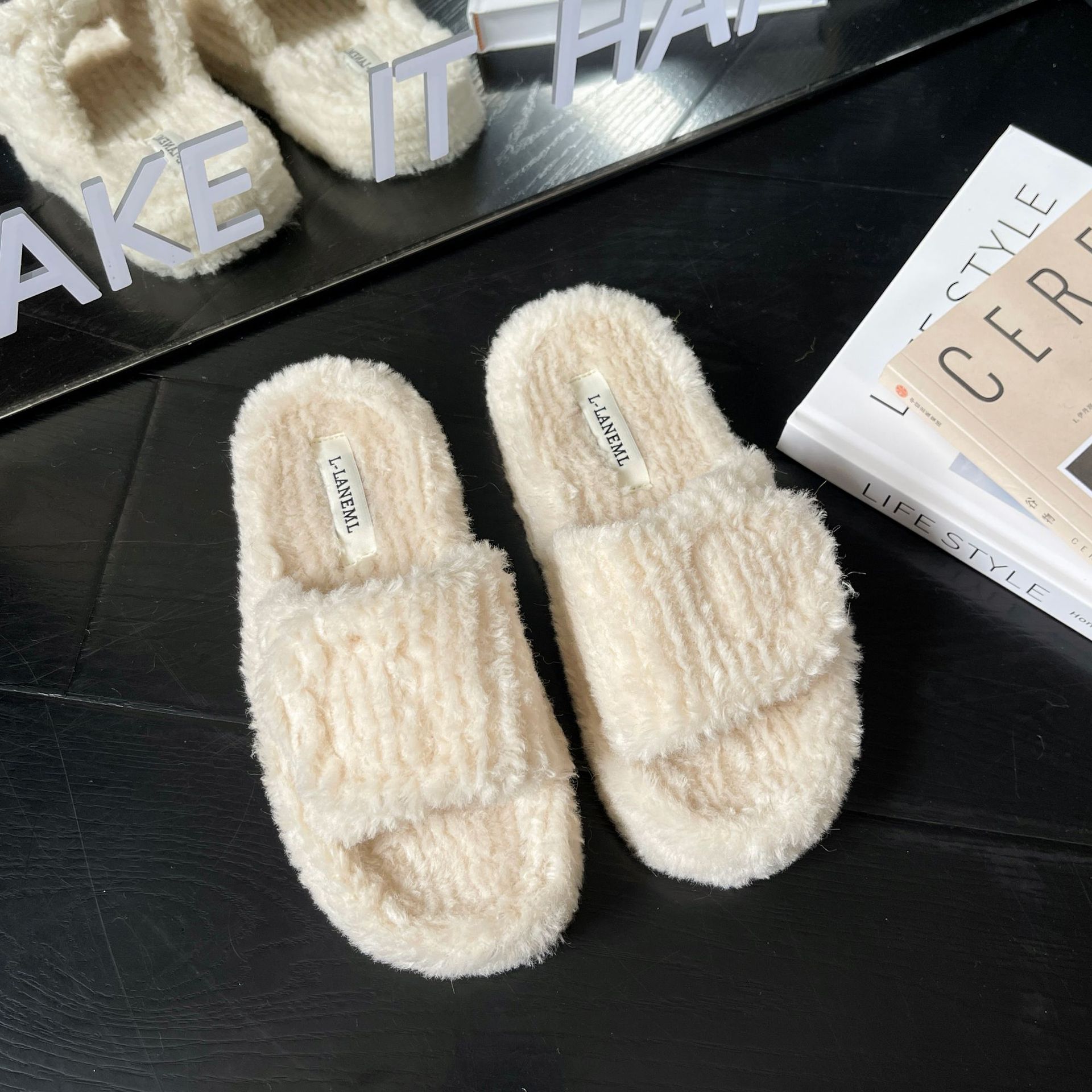 新款时尚羊羔毛跨境大码一字魔术贴舒适柔软毛毛拖鞋外穿居家批发