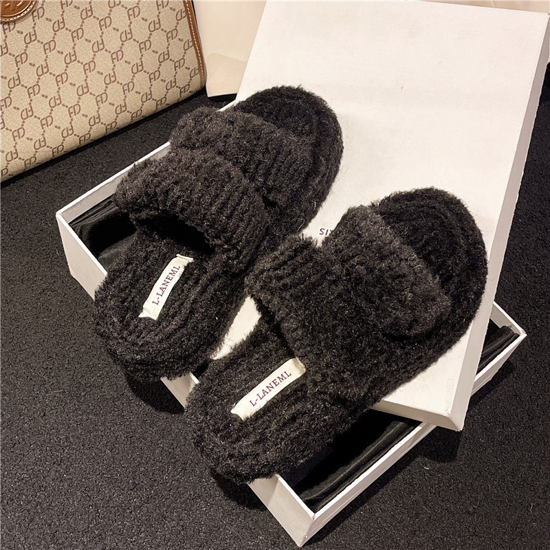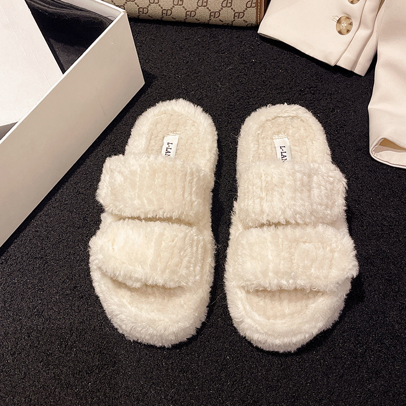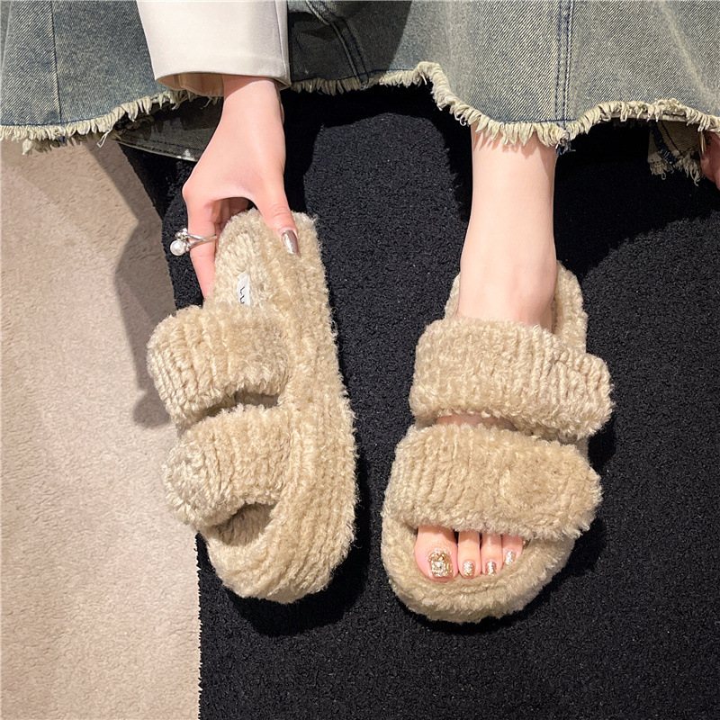 新款羊羔毛跨境大码一字魔术贴百搭舒适柔软毛毛拖鞋外穿居家拖鞋