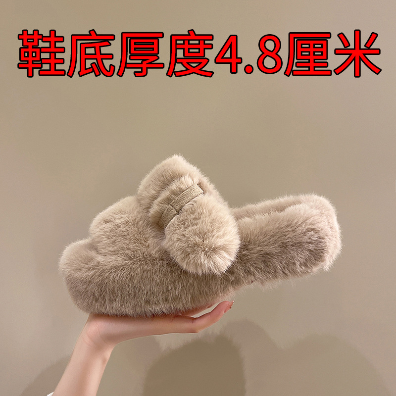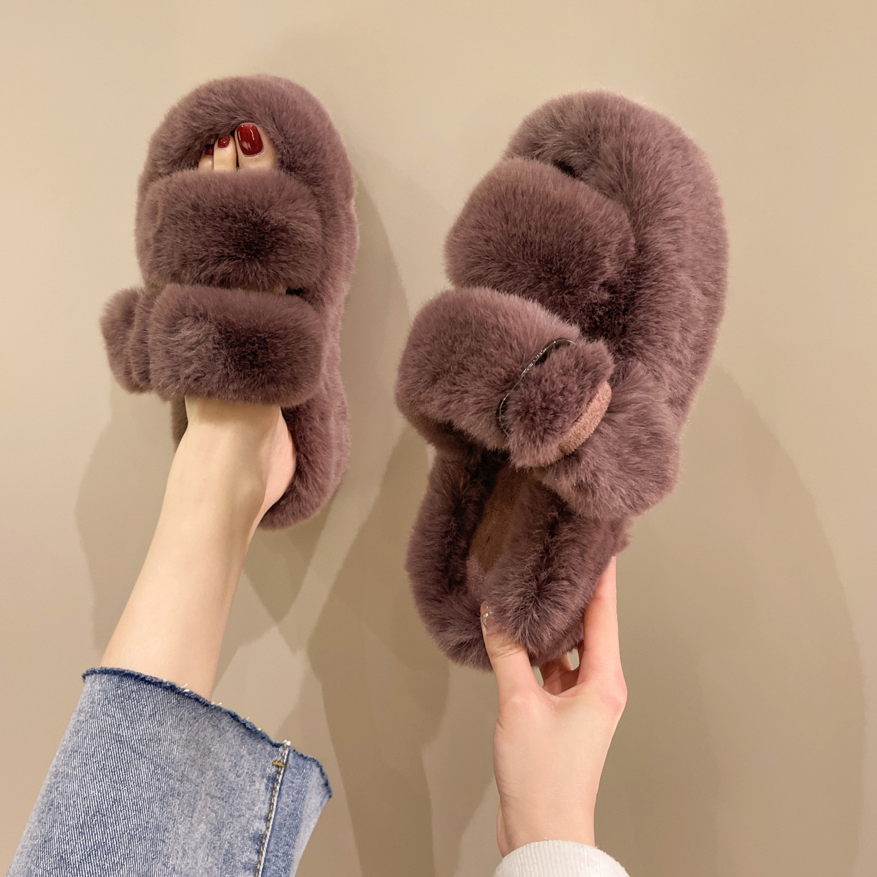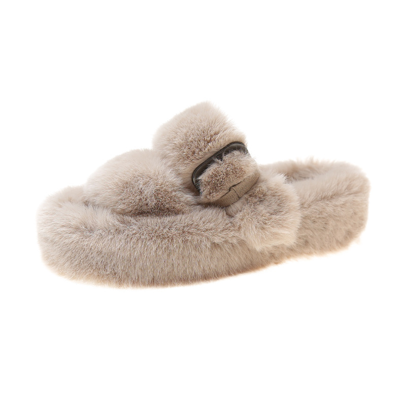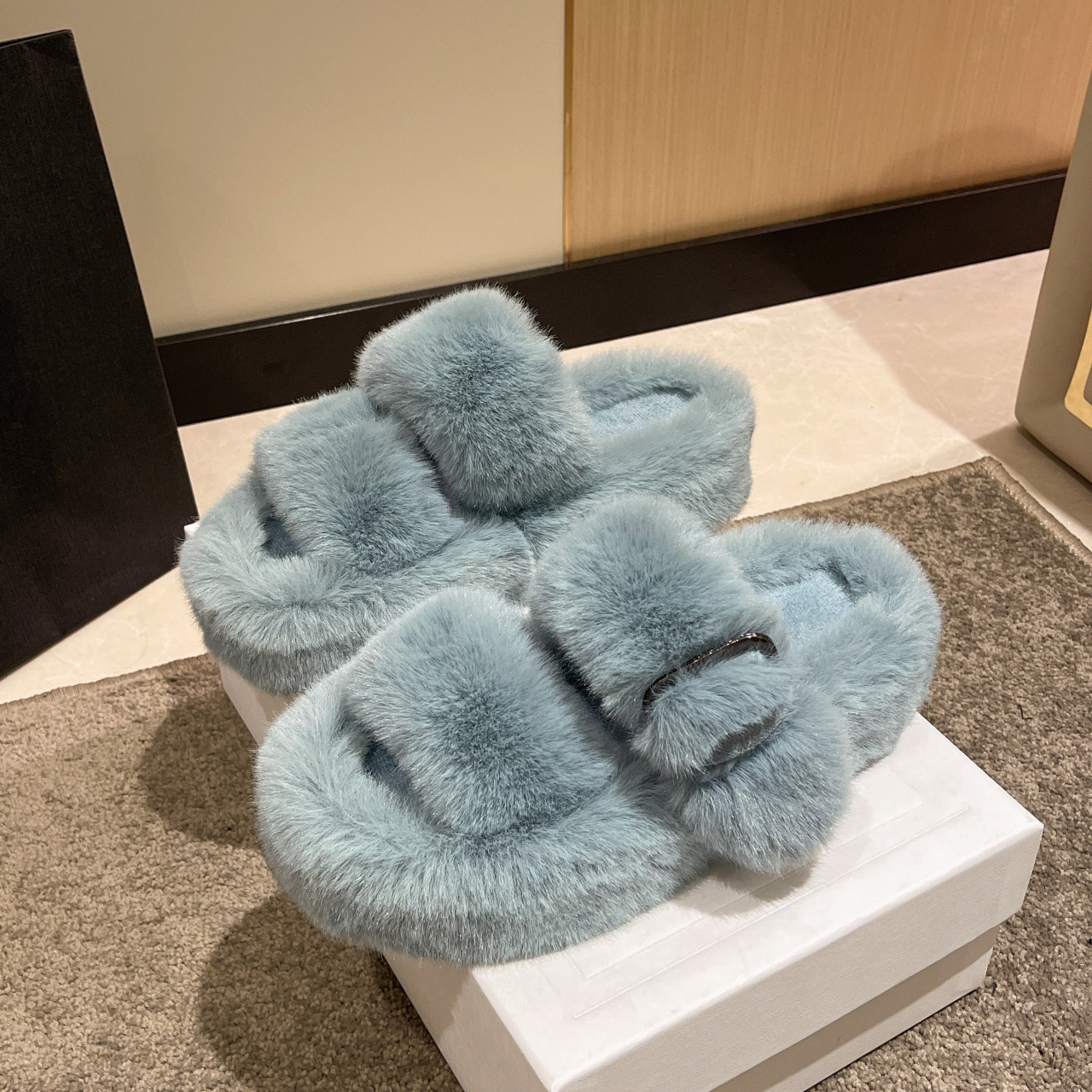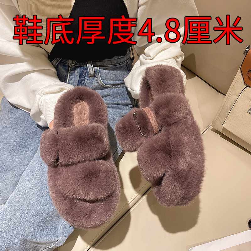 跨境大码松糕厚底毛毛拖鞋女外穿2023秋冬新款皮带扣露趾拖鞋批发