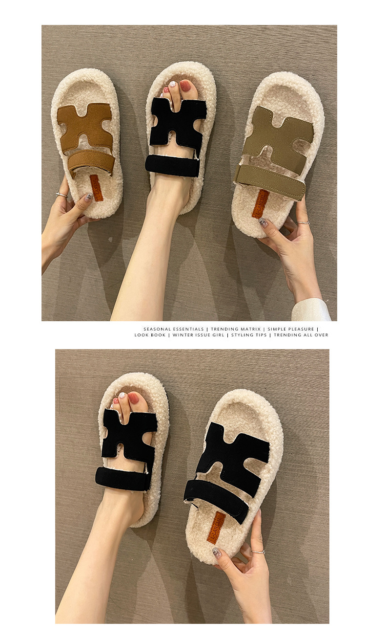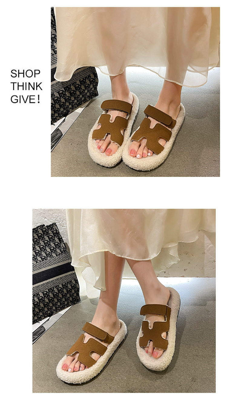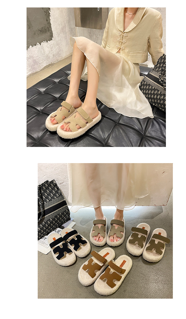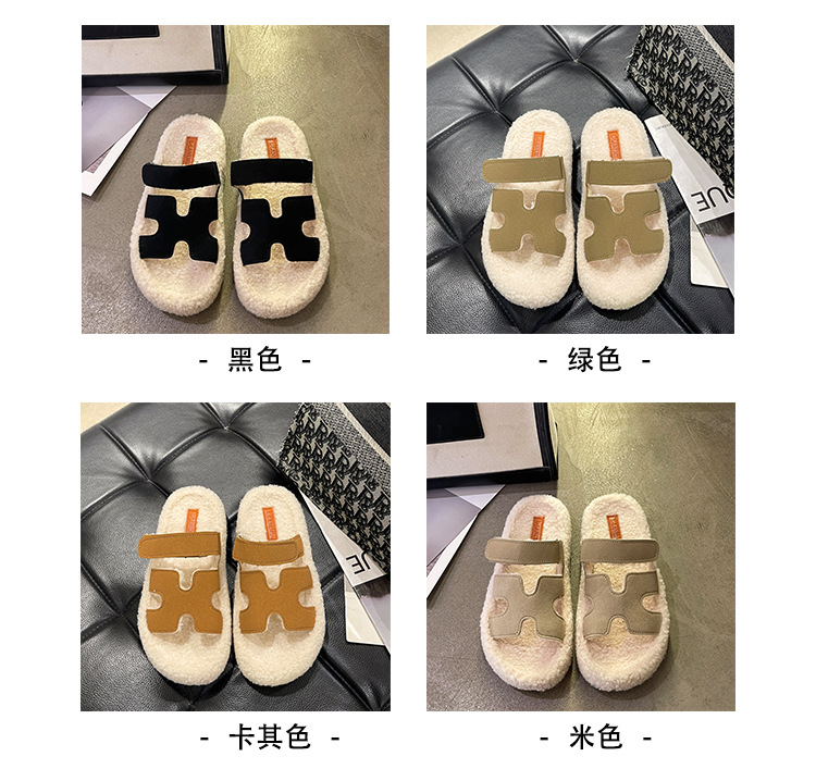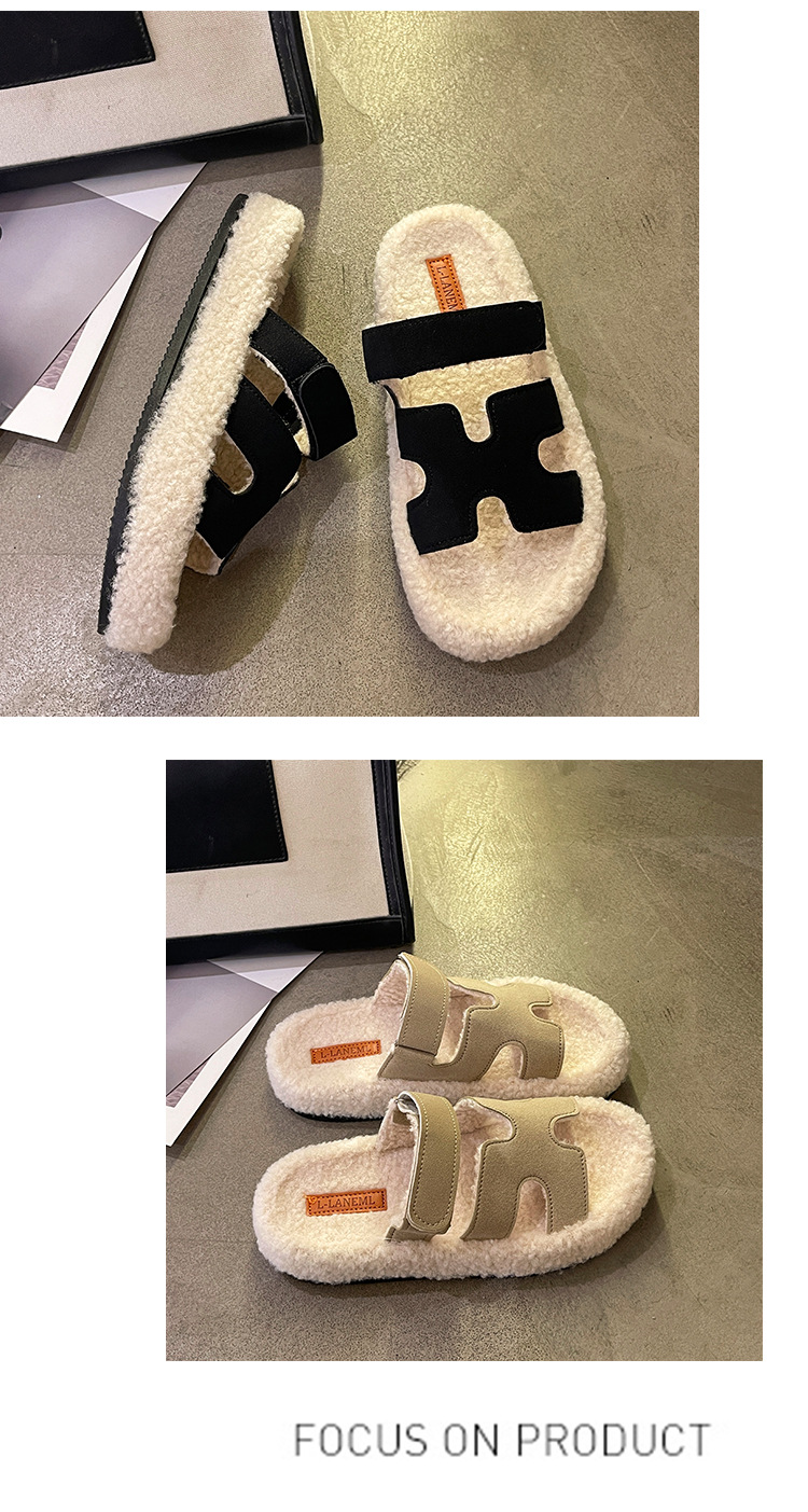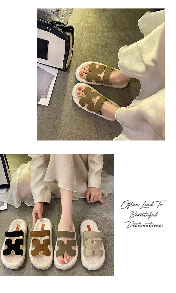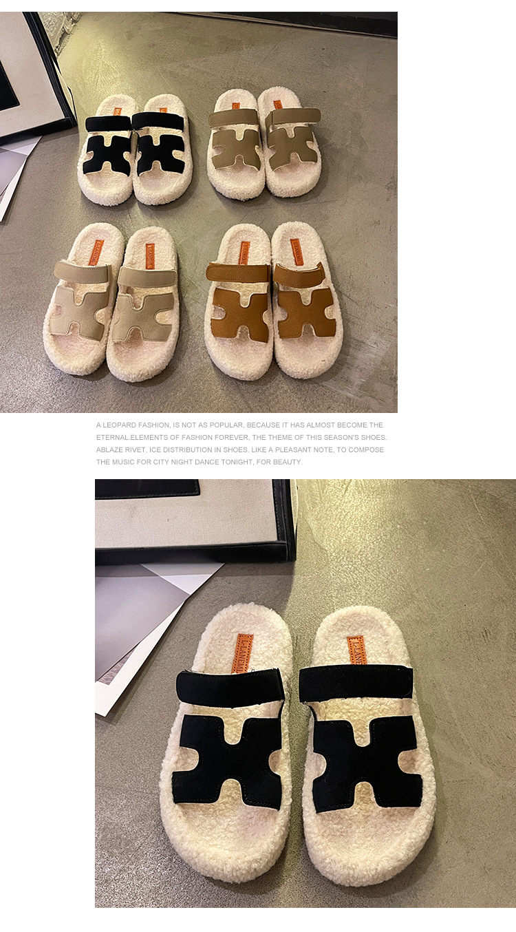 平底毛毛鞋女跨境大码新款皮毛一体拼色魔术贴拖鞋一脚蹬懒人鞋
