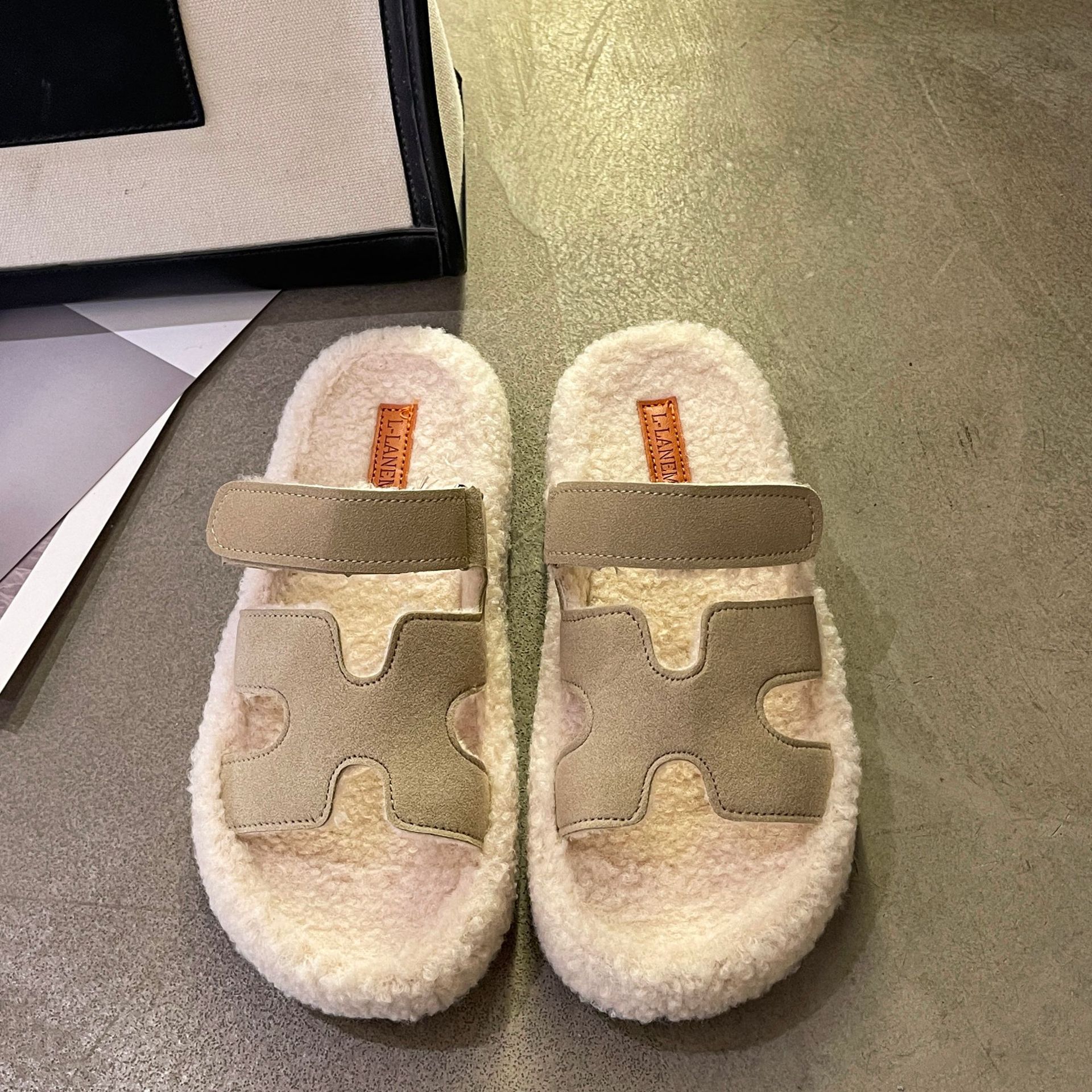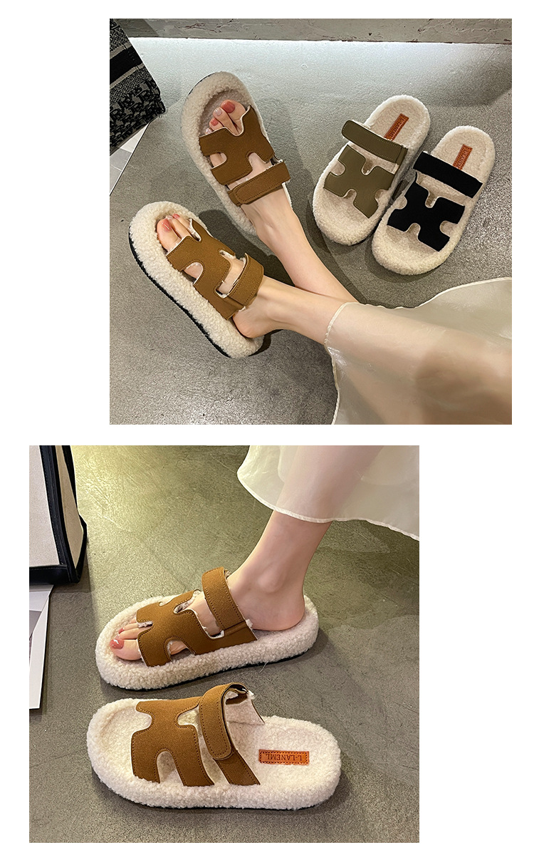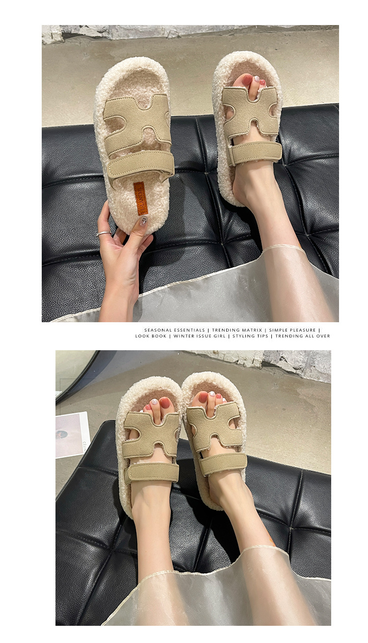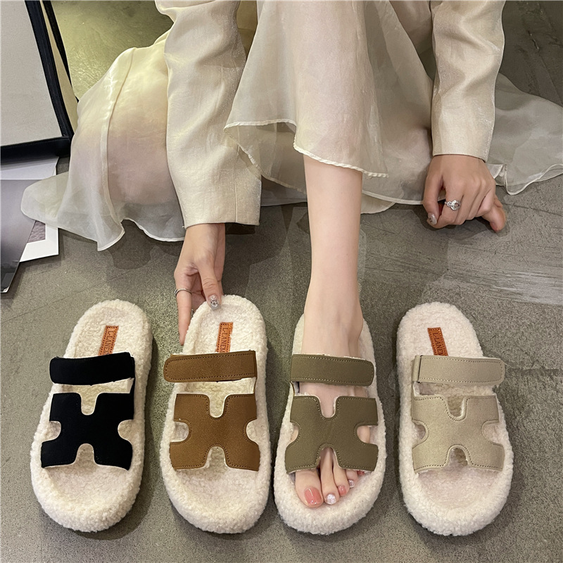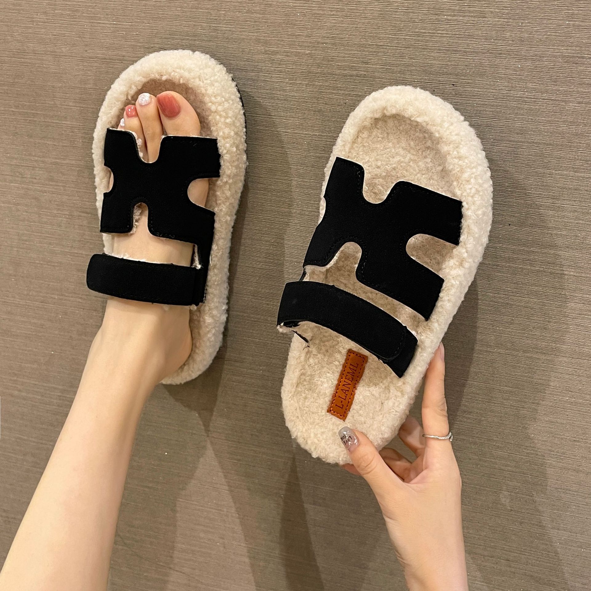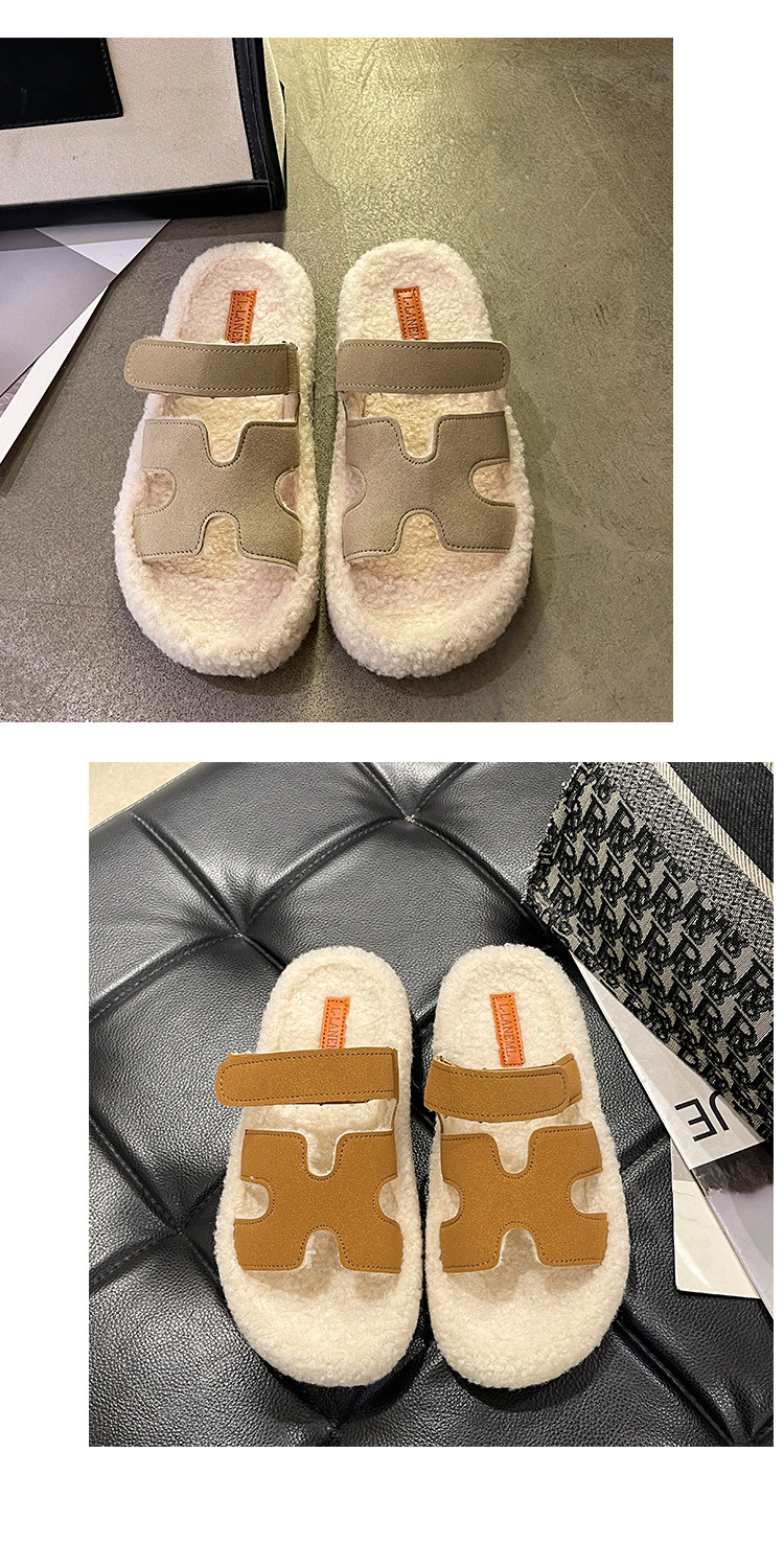 平底毛毛鞋女跨境大码新款皮毛一体拼色魔术贴拖鞋一脚蹬懒人鞋