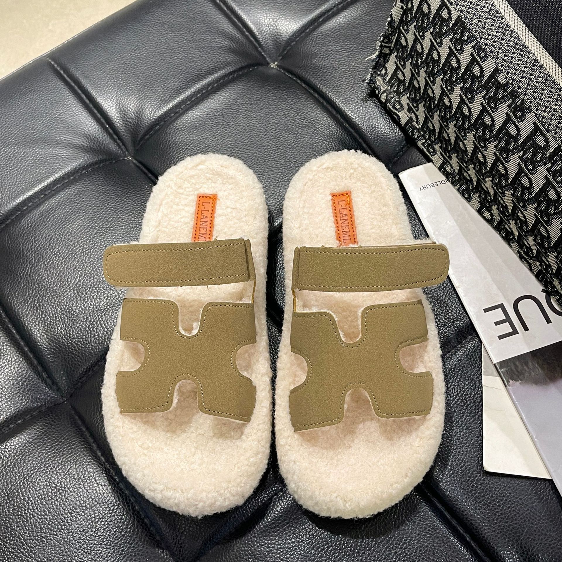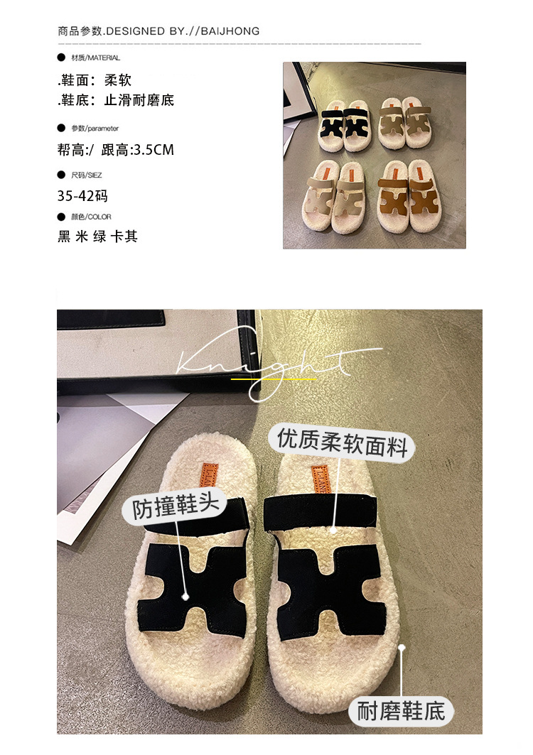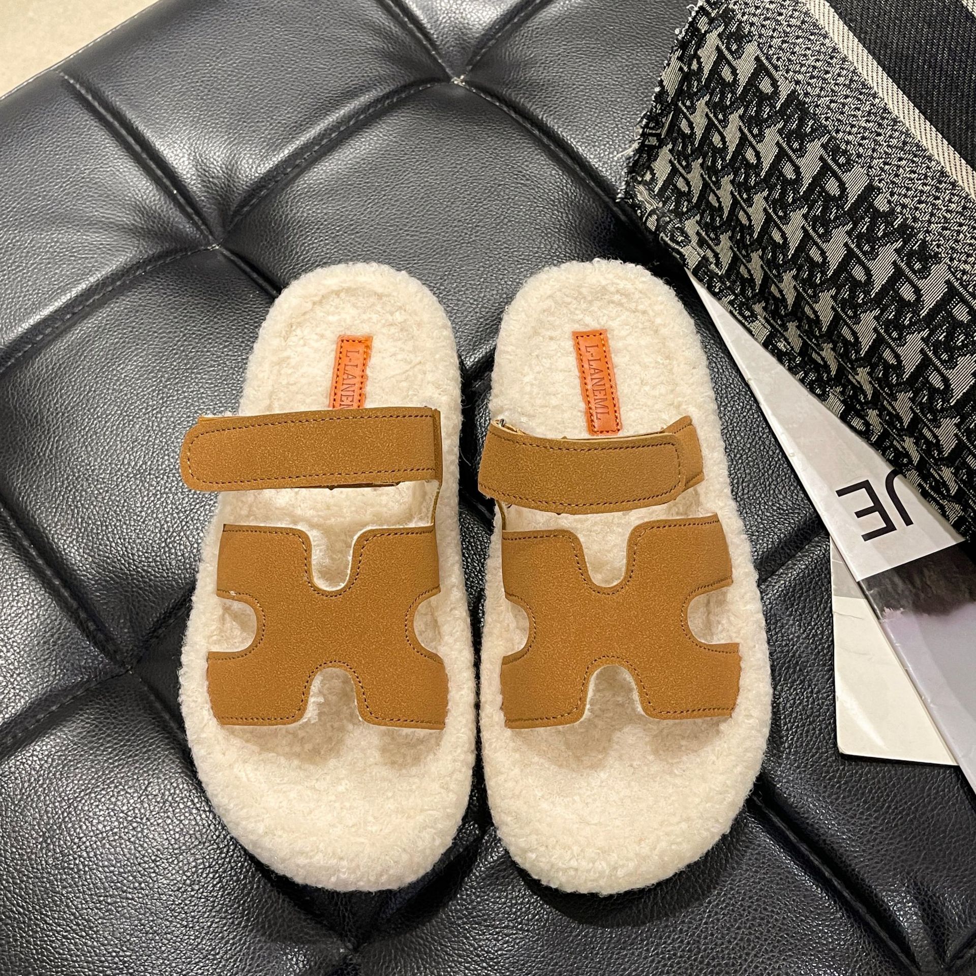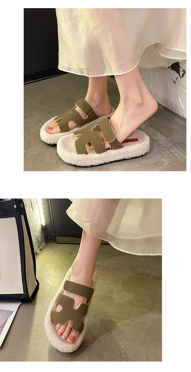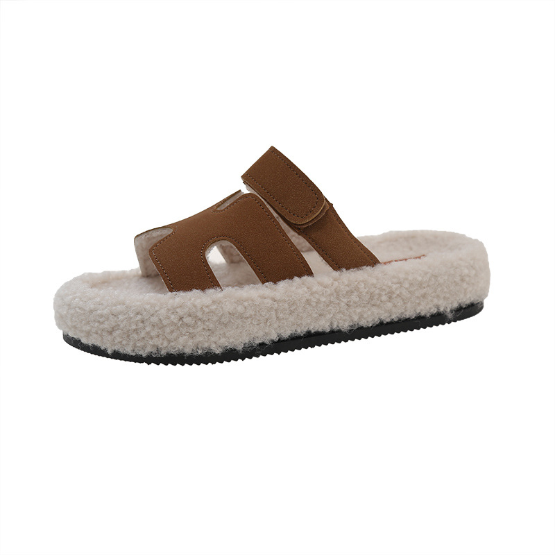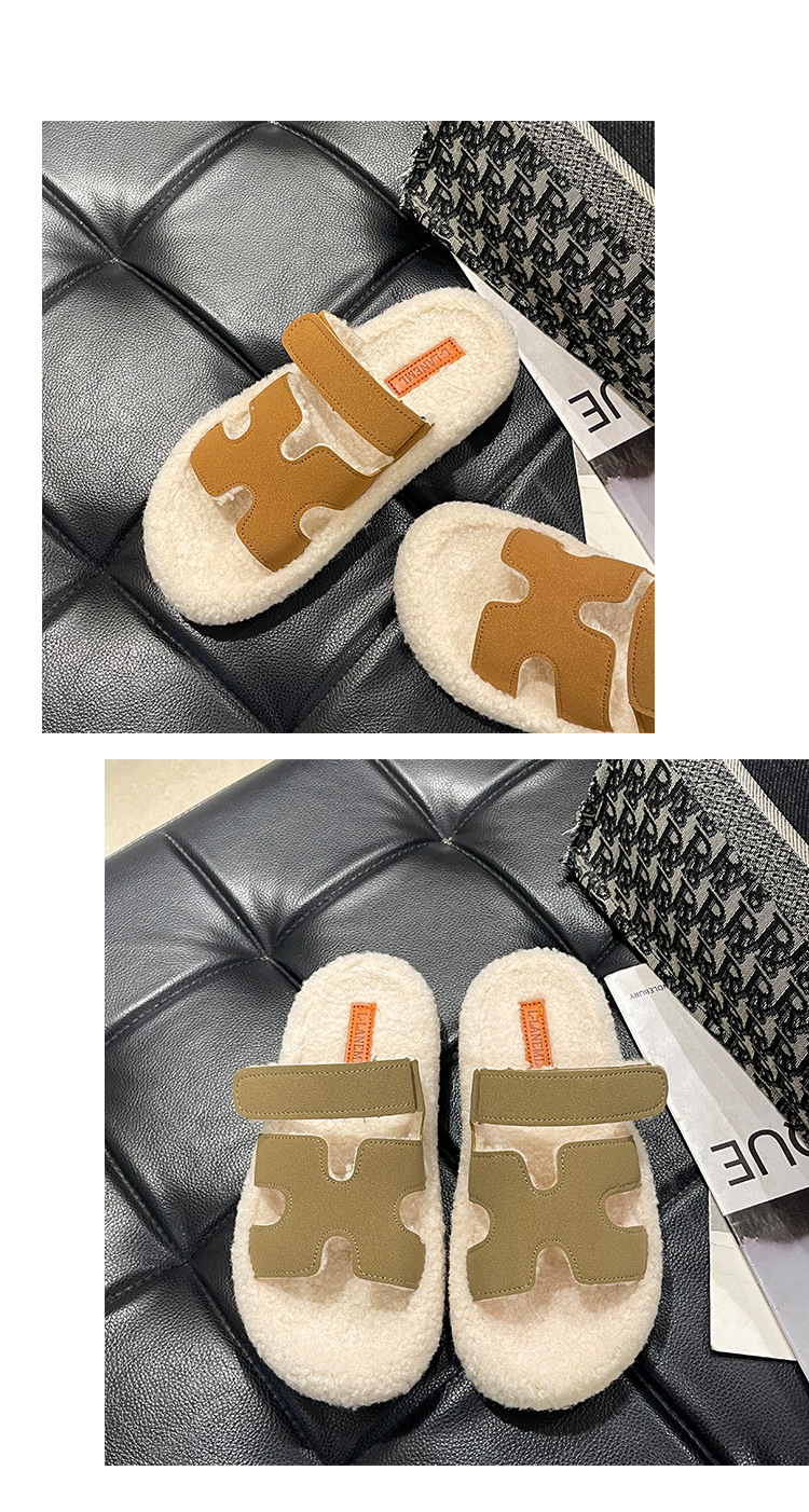 平底毛毛鞋女跨境大码新款皮毛一体拼色魔术贴拖鞋一脚蹬懒人鞋