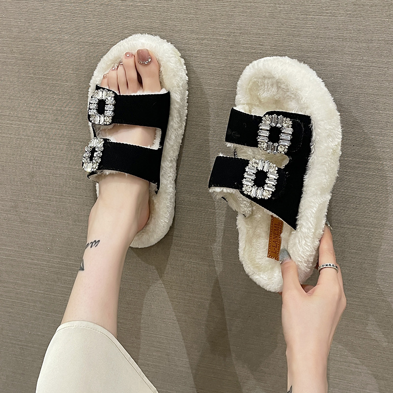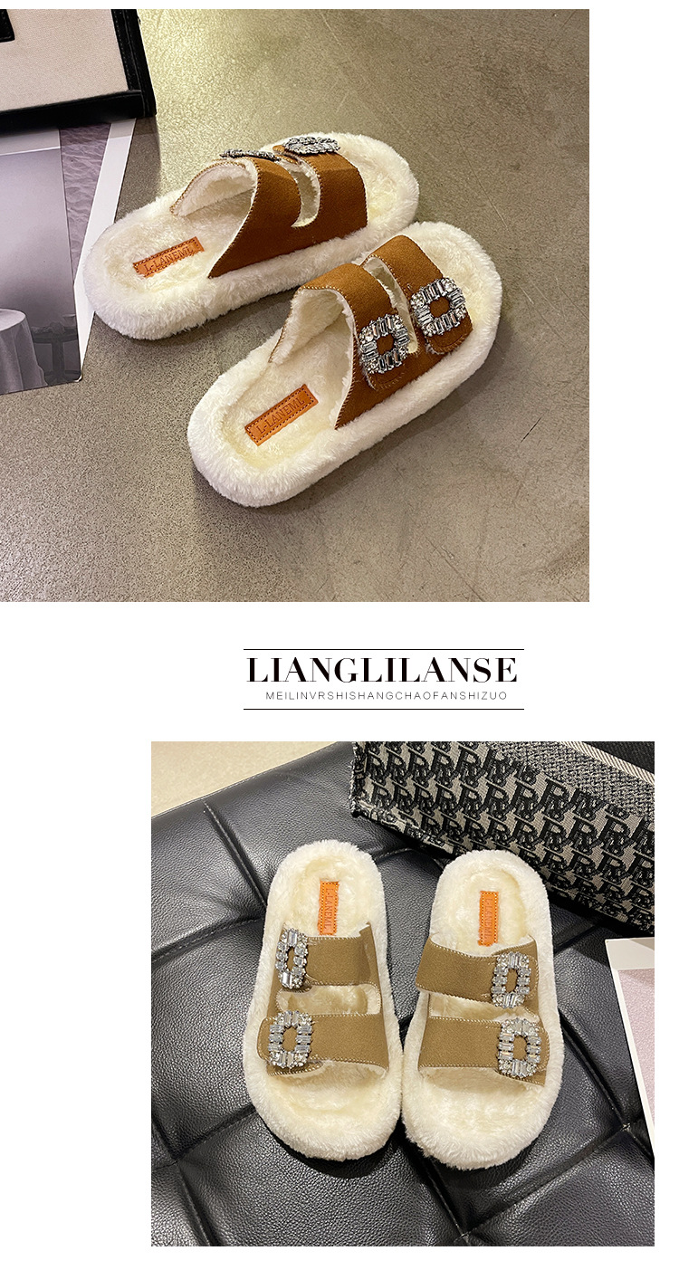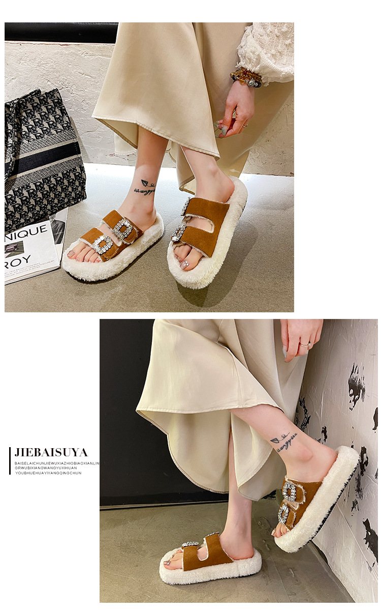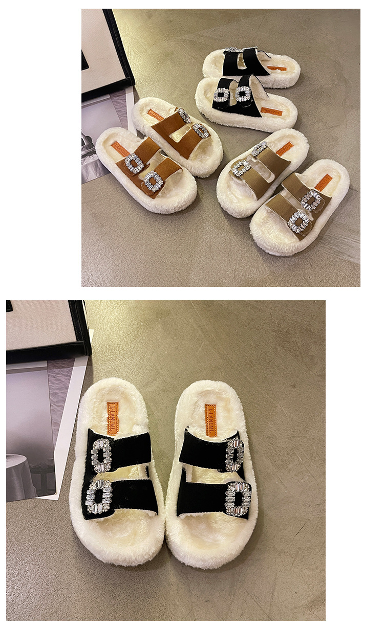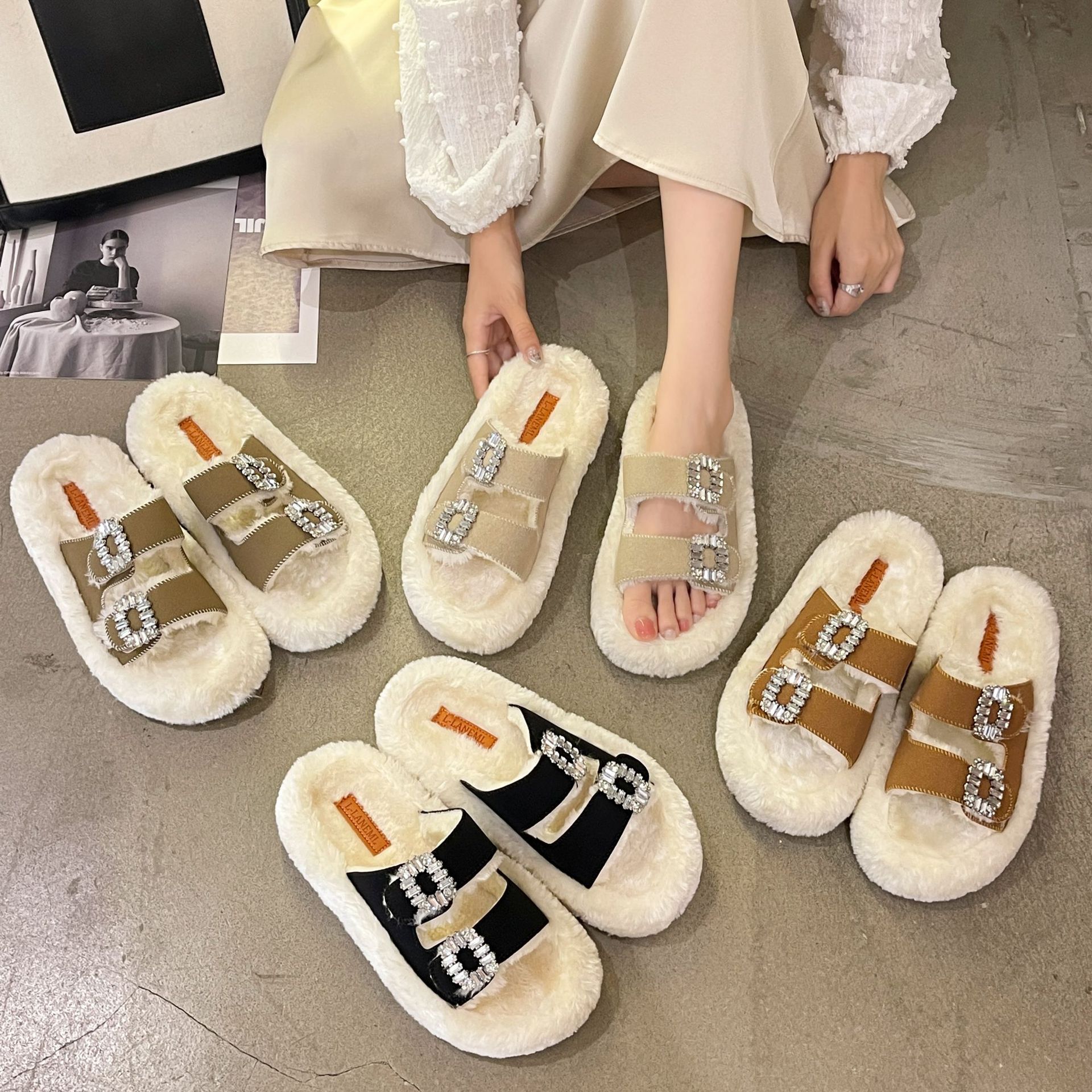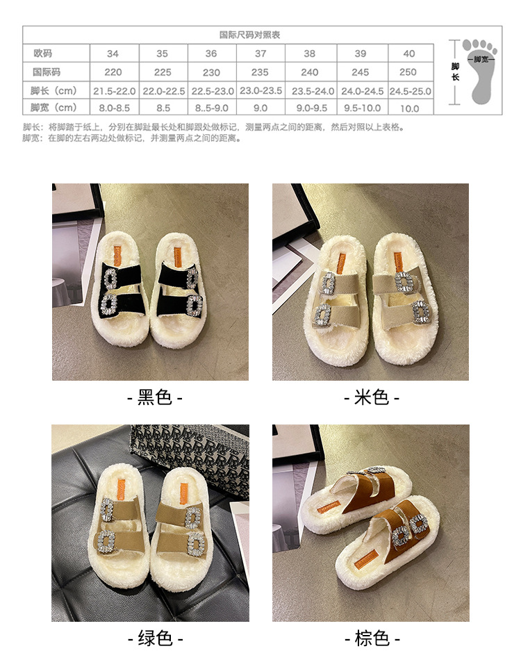 厚底勃肯毛毛拖鞋女双排大码新款带钻一字拖秋冬季外穿加绒棉拖