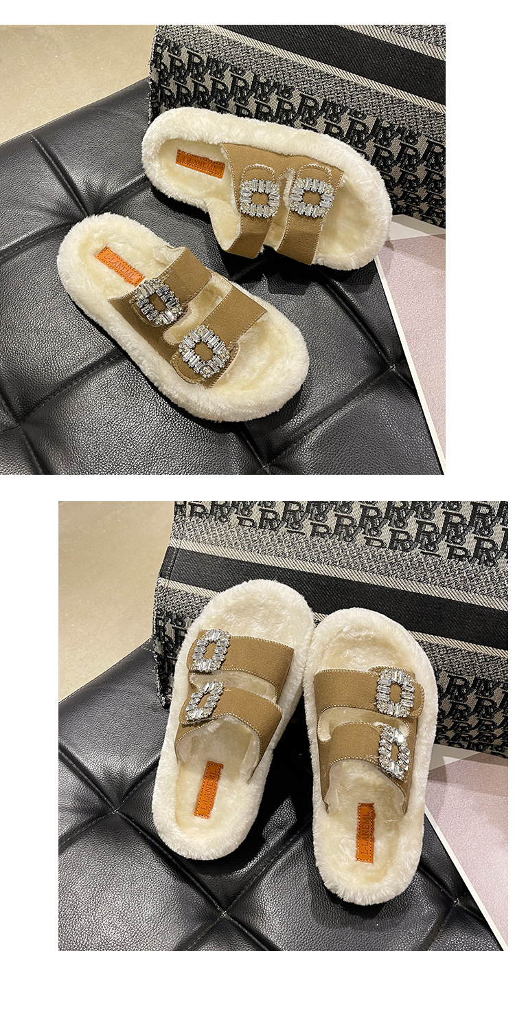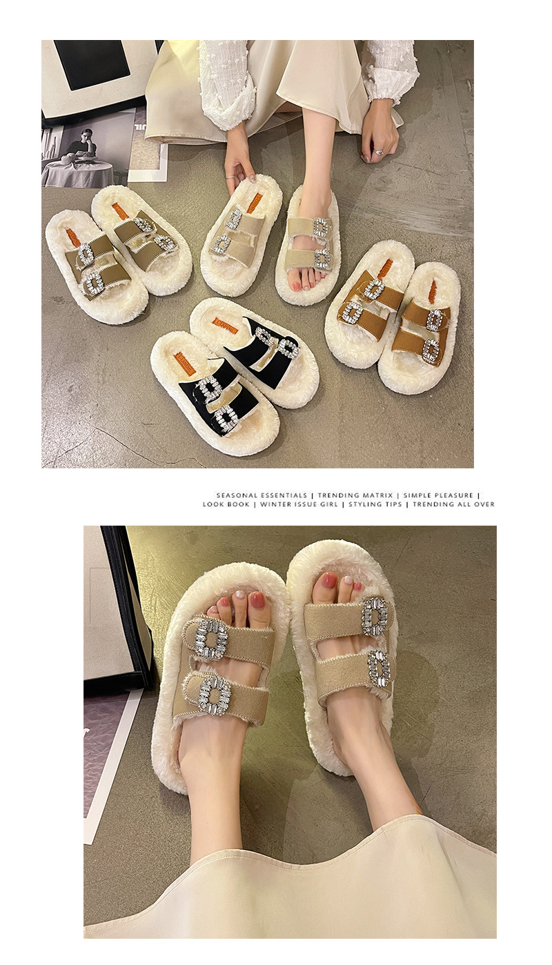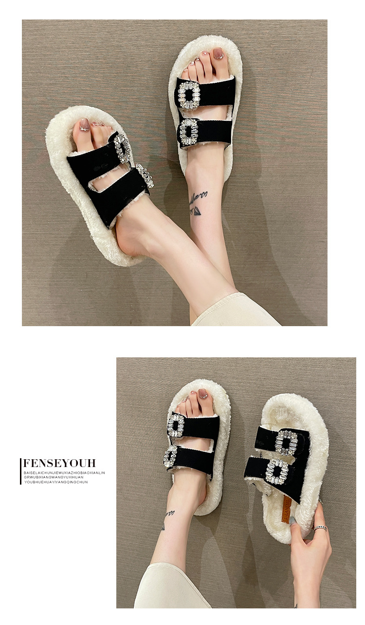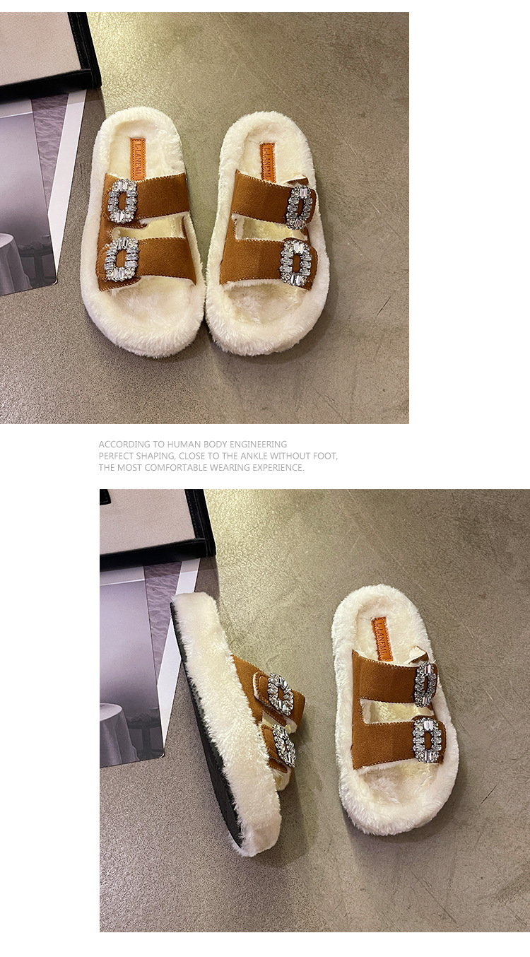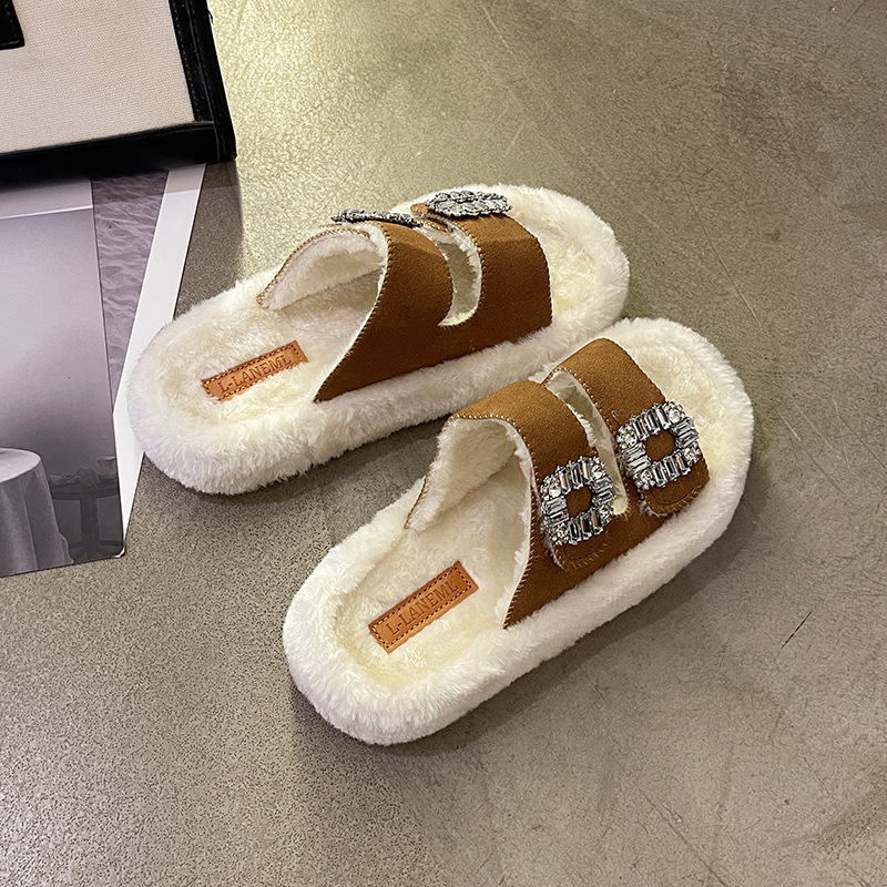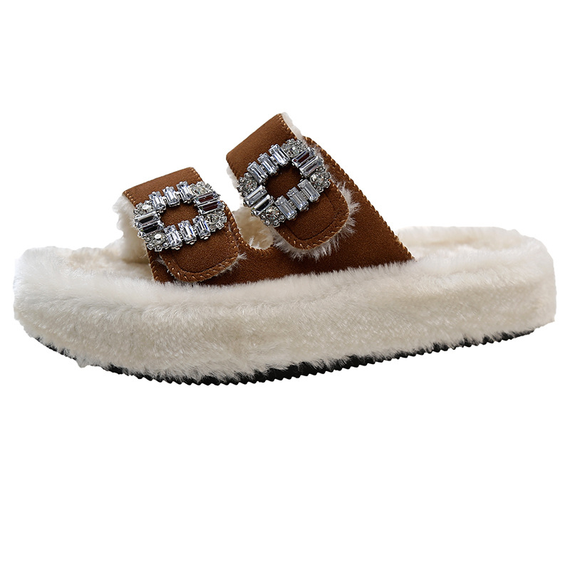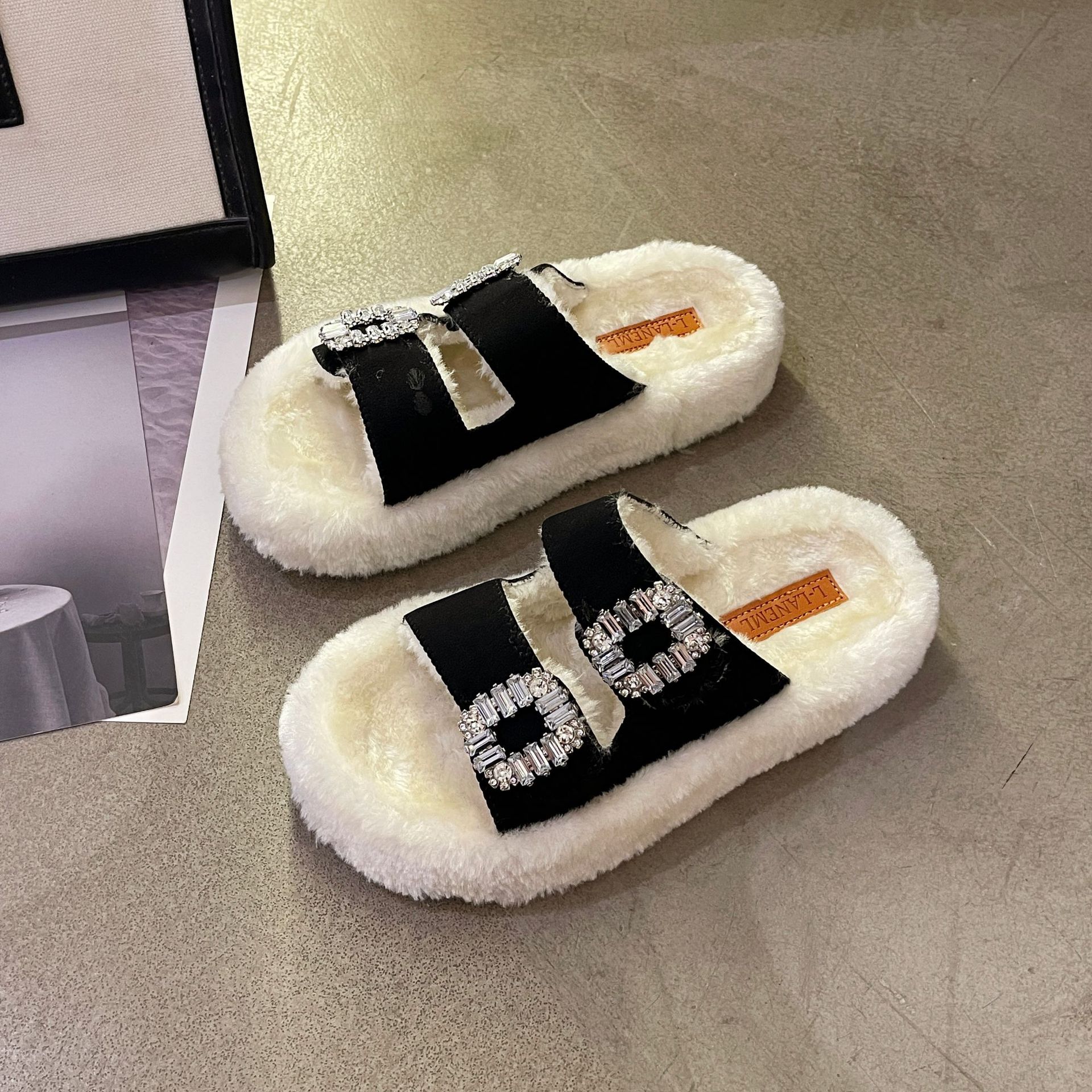 厚底勃肯毛毛拖鞋女双排大码新款带钻一字拖秋冬季外穿加绒棉拖