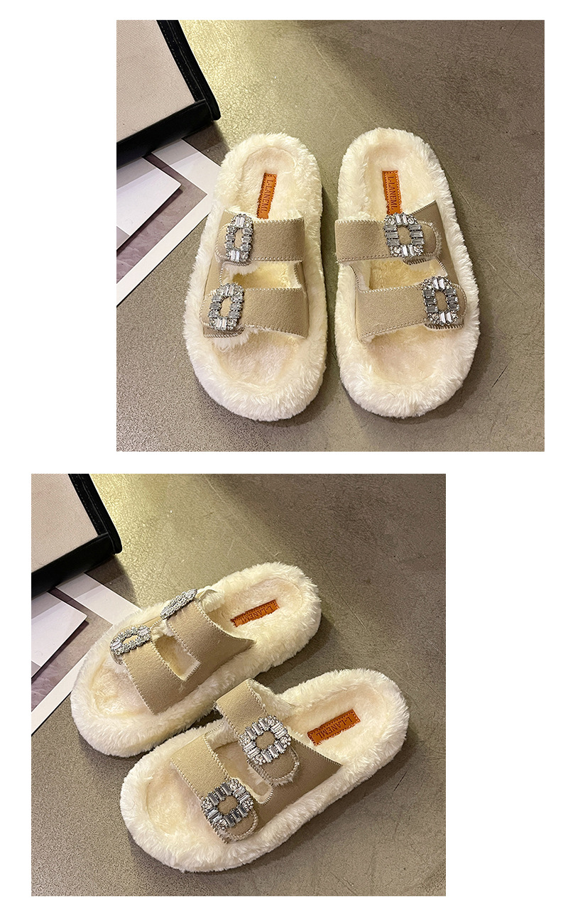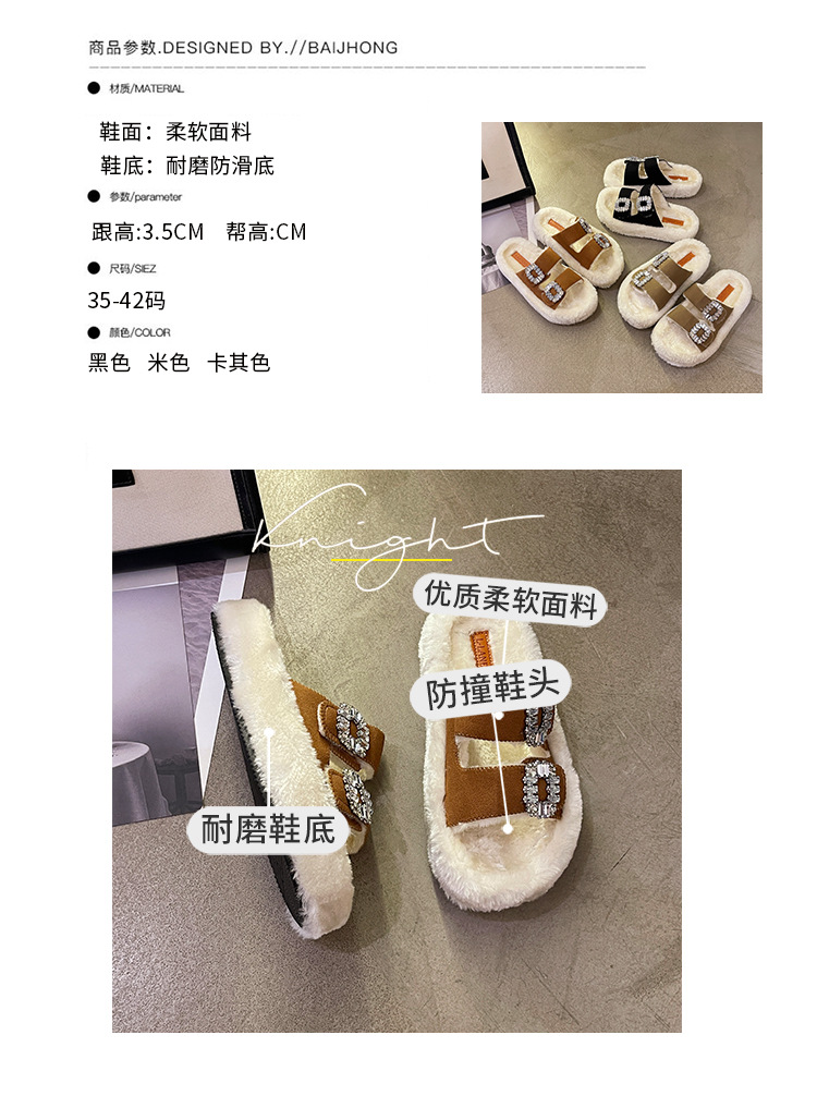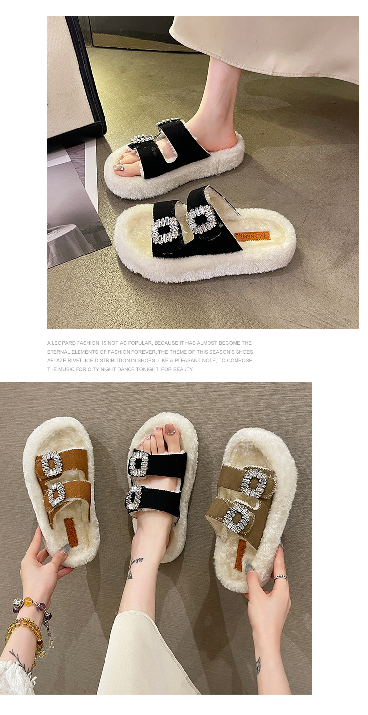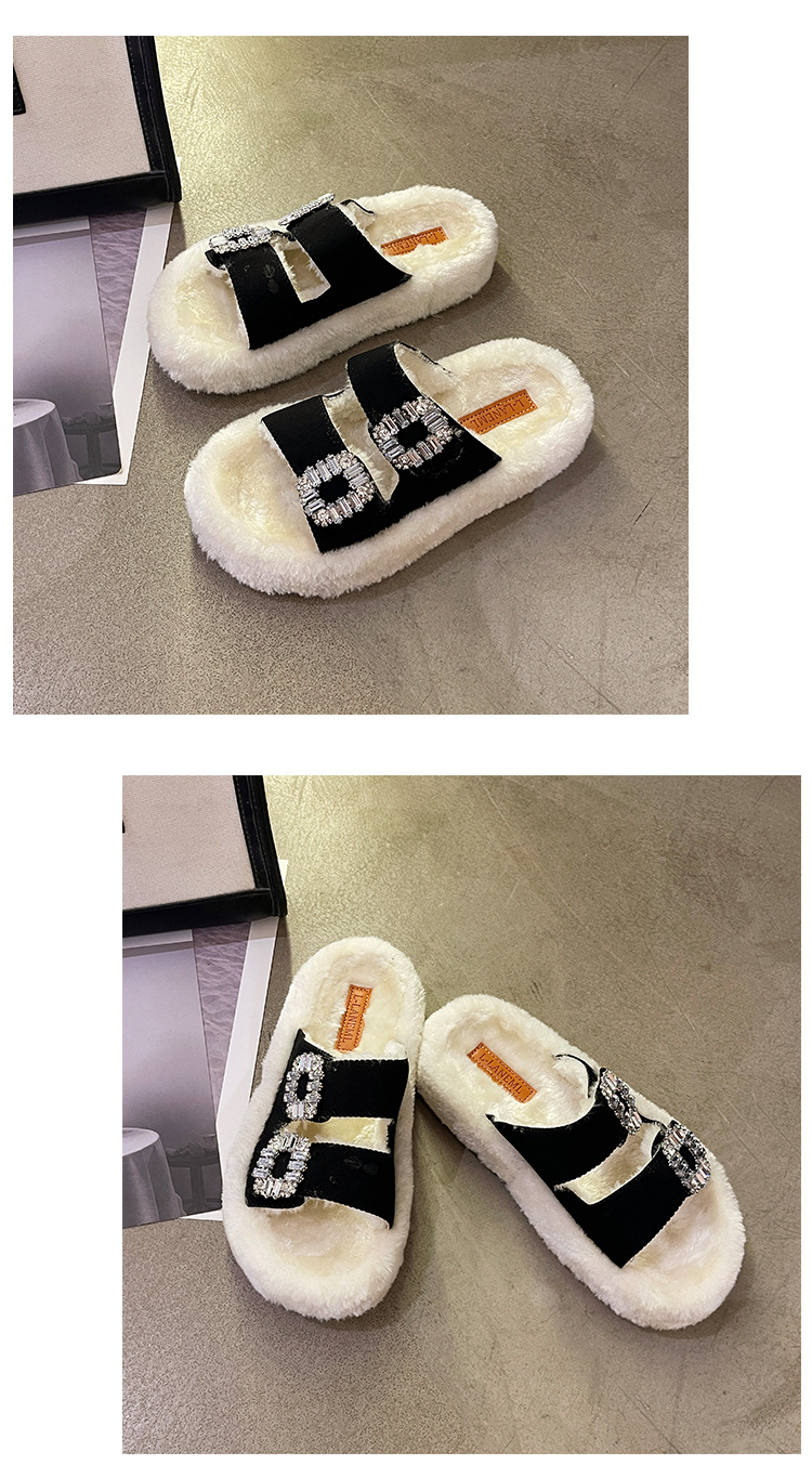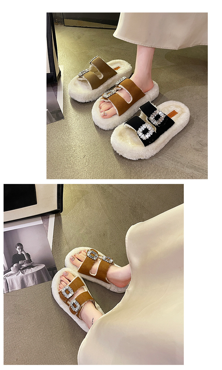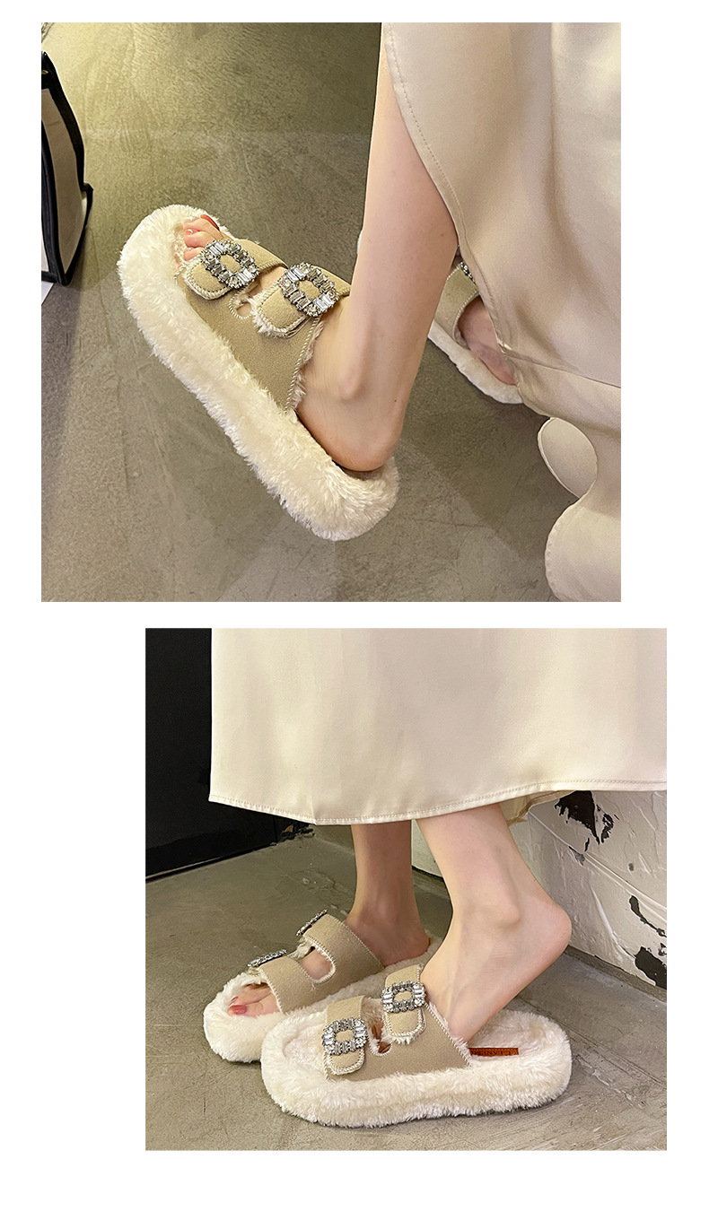 厚底勃肯毛毛拖鞋女双排大码新款带钻一字拖秋冬季外穿加绒棉拖