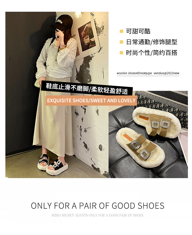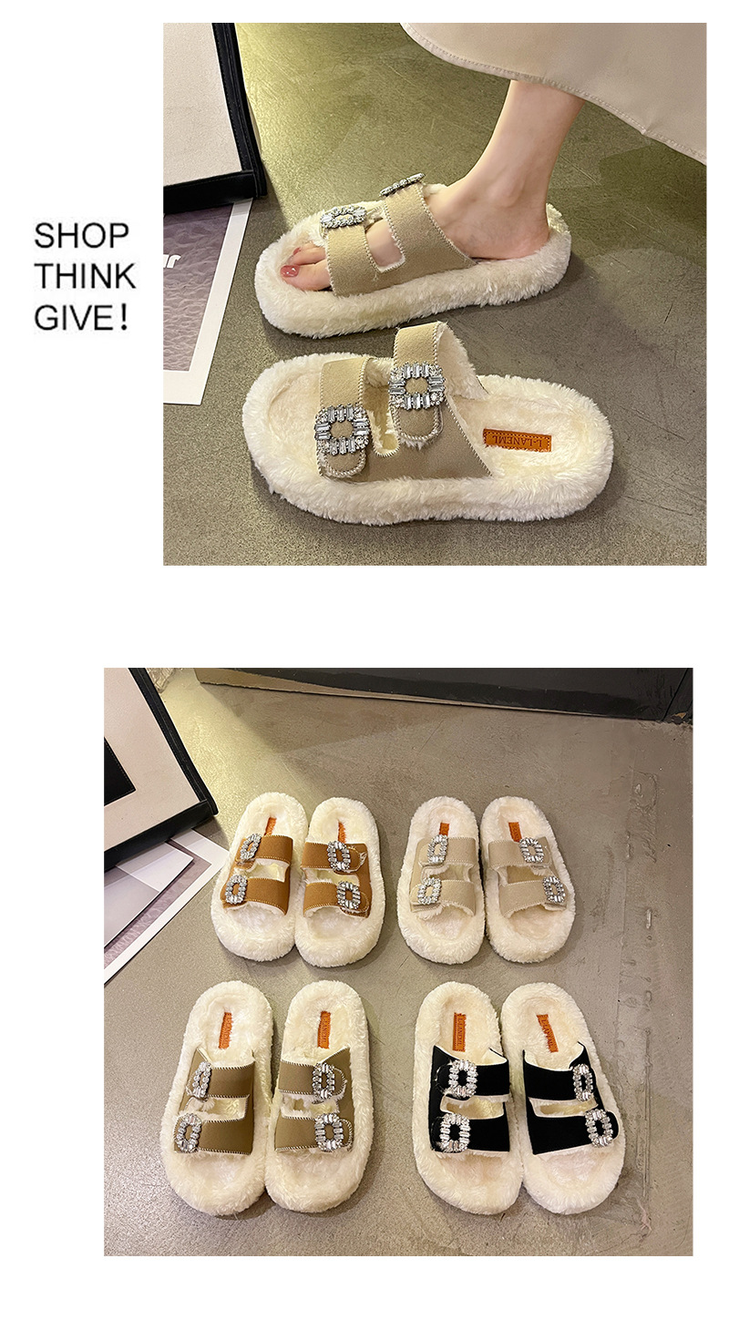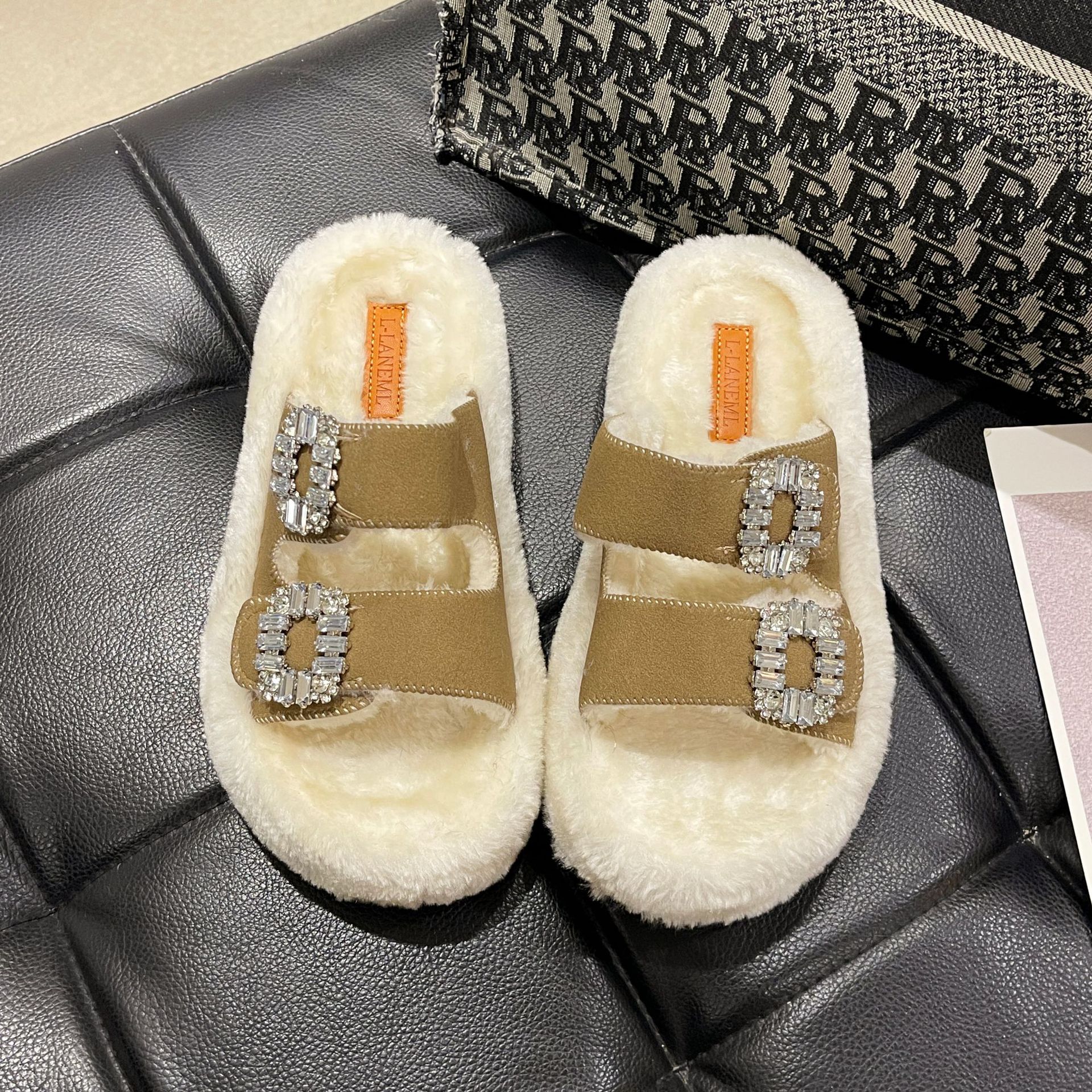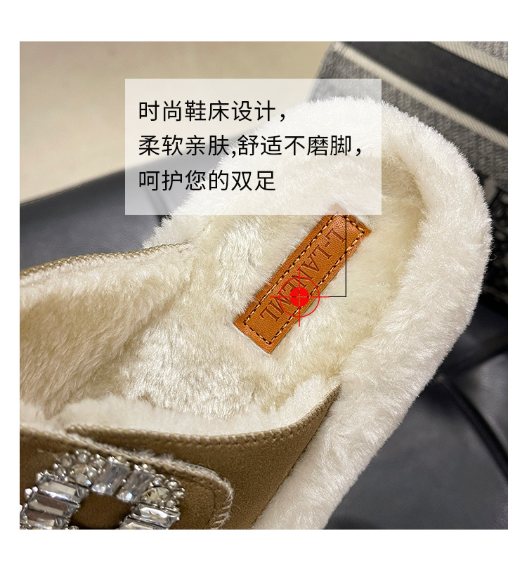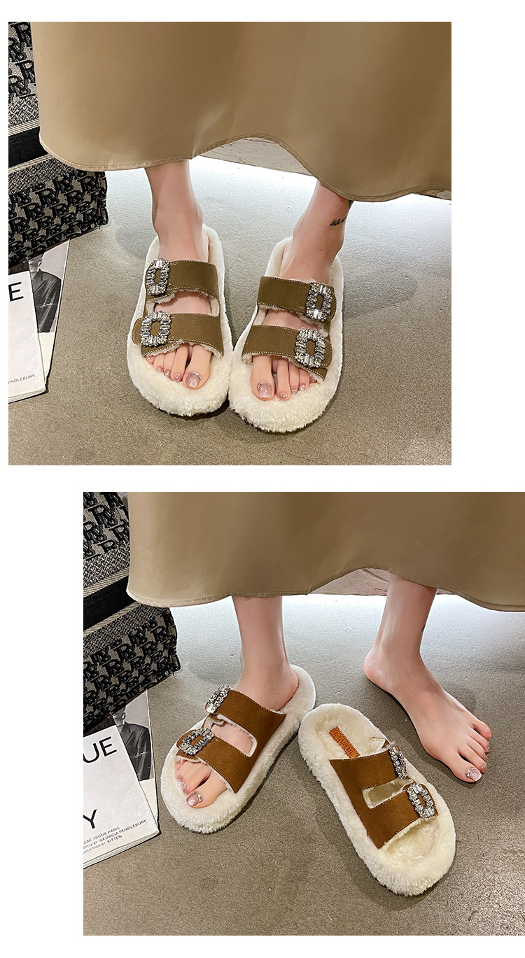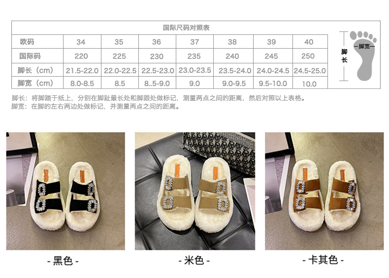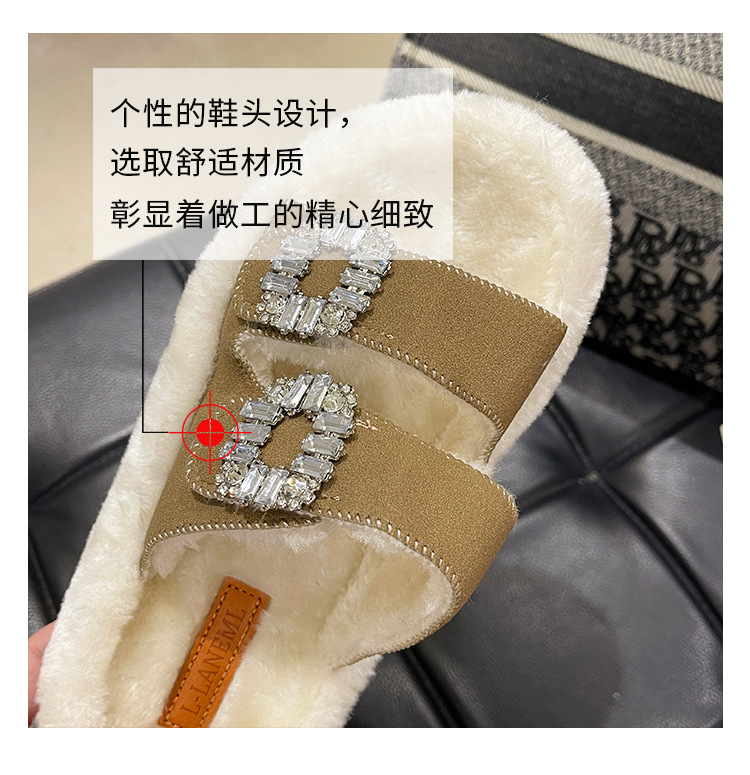 厚底勃肯毛毛拖鞋女双排大码新款带钻一字拖秋冬季外穿加绒棉拖