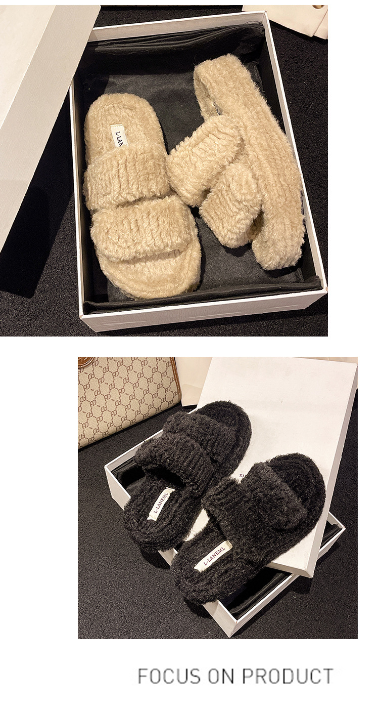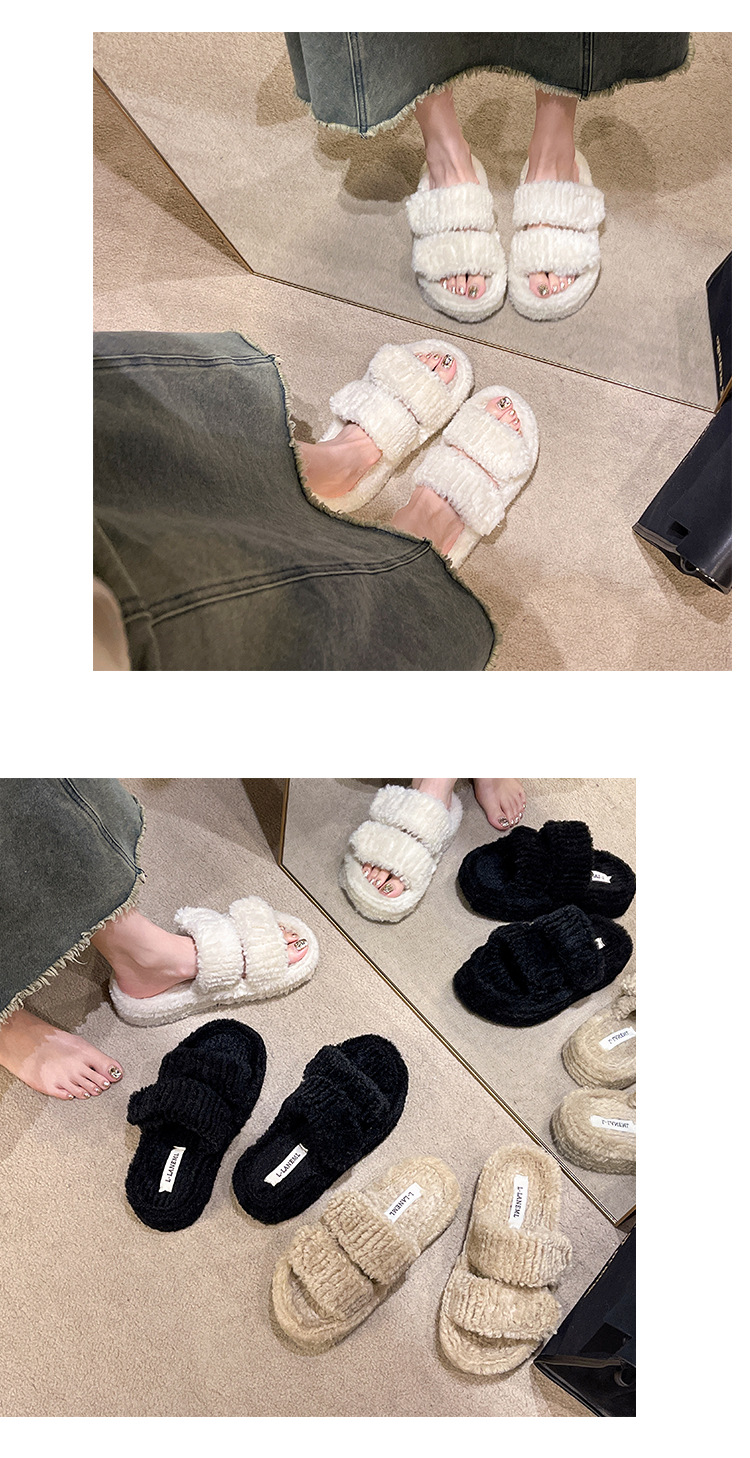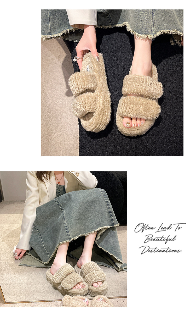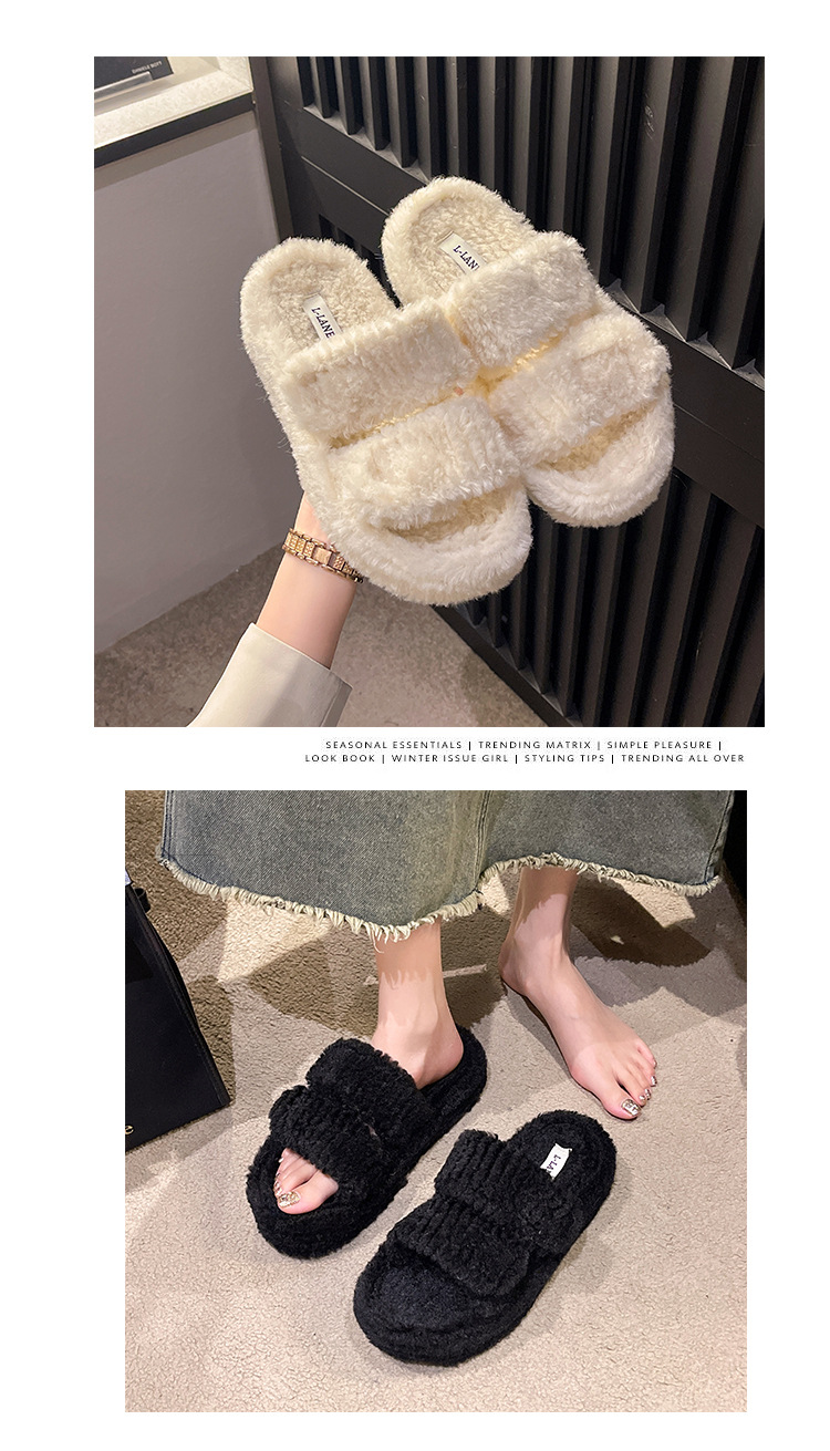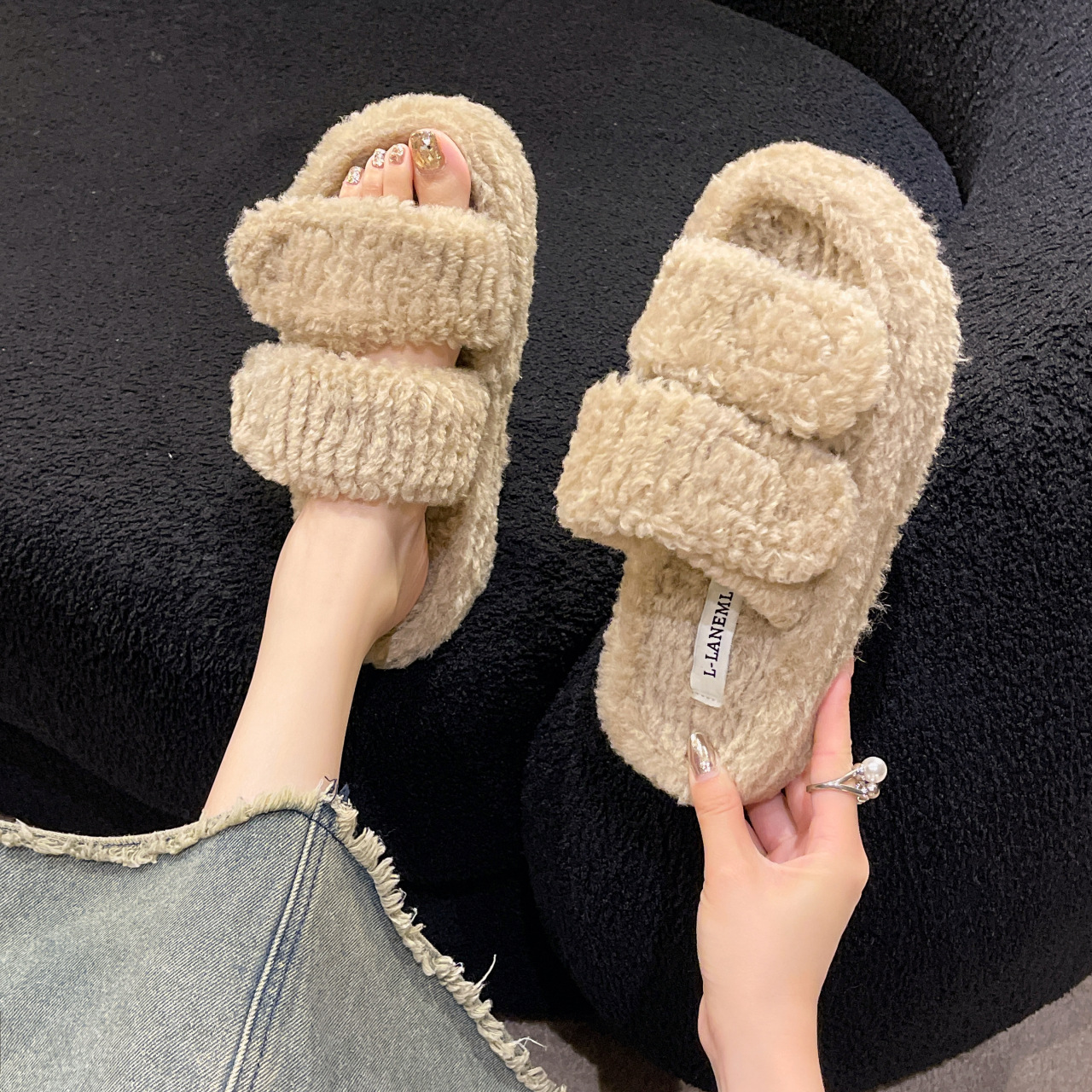 跨境外贸大码双条新款魔术贴舒适软底居家保暖时尚百搭毛毛拖鞋女