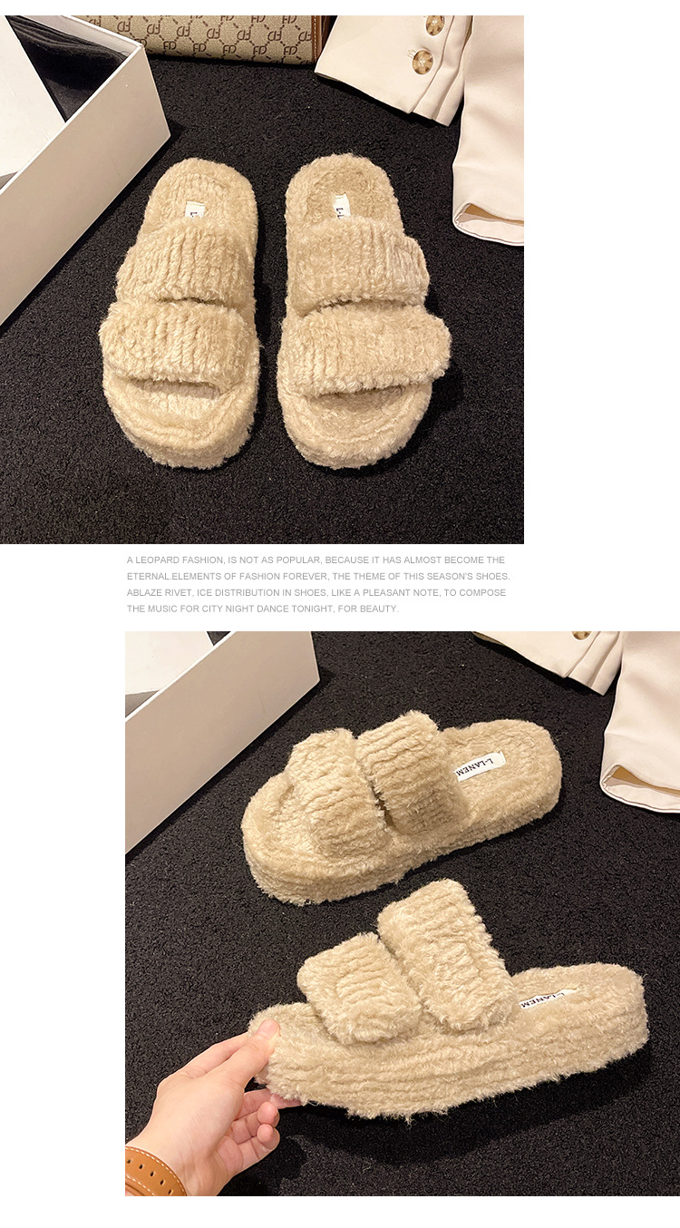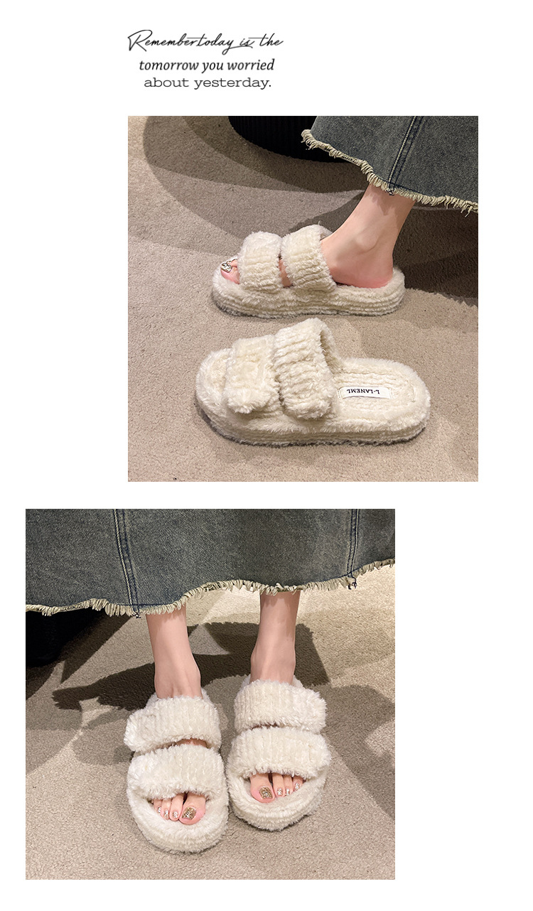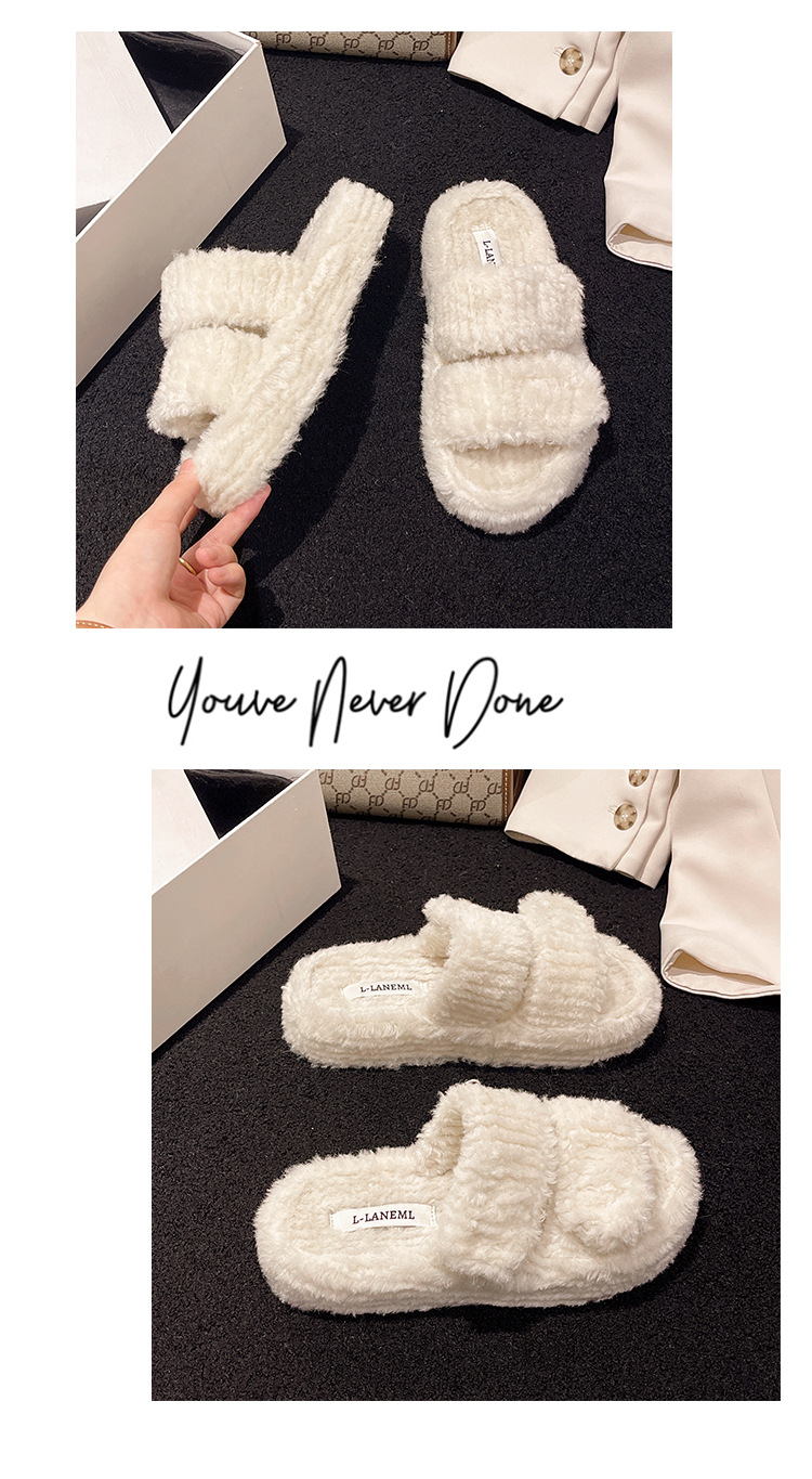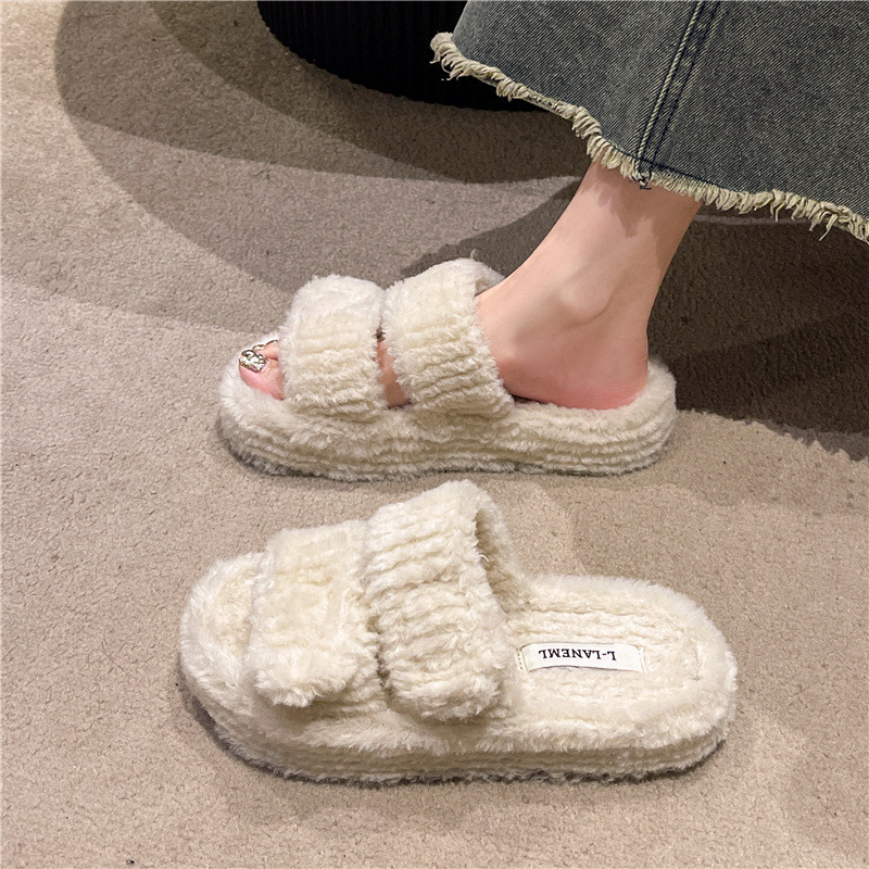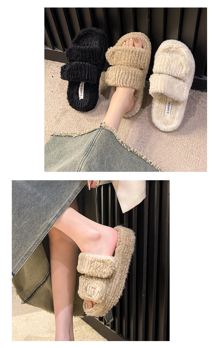 跨境外贸大码双条新款魔术贴舒适软底居家保暖时尚百搭毛毛拖鞋女