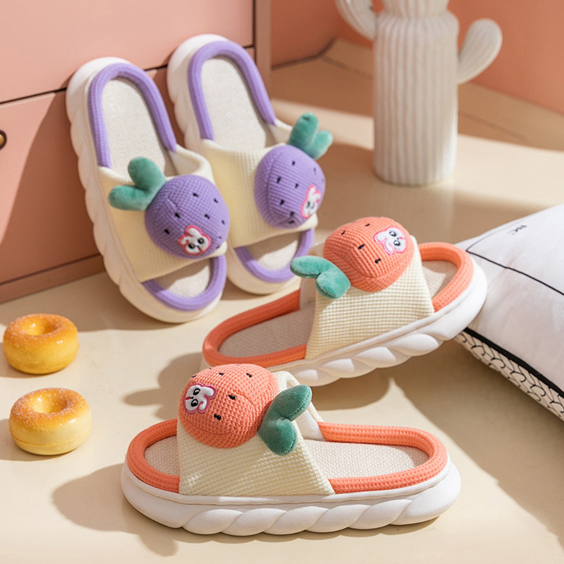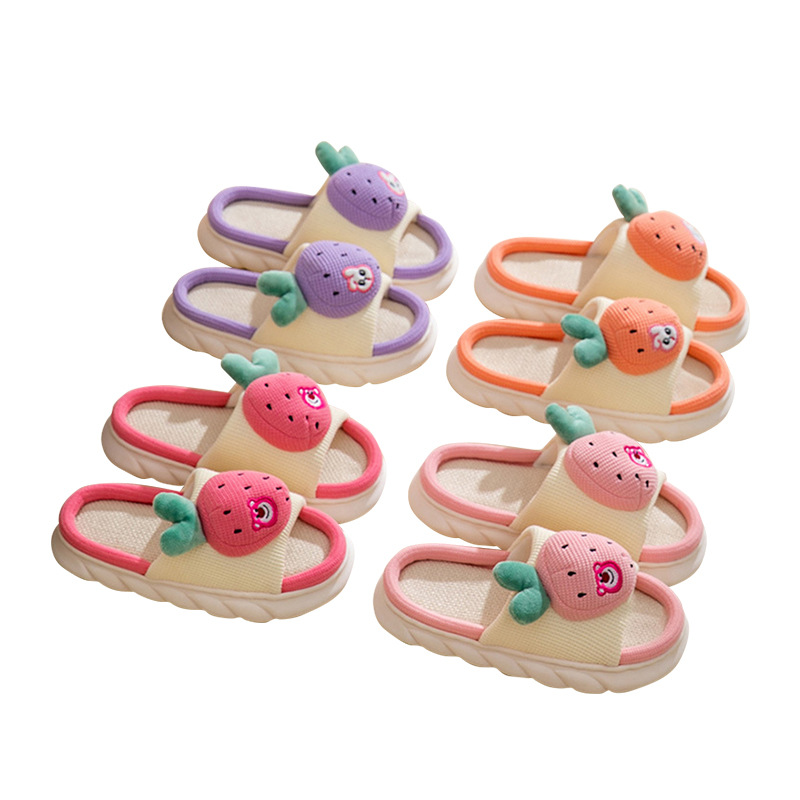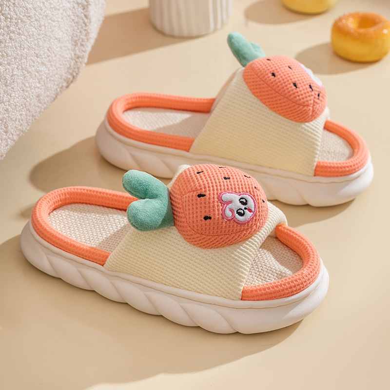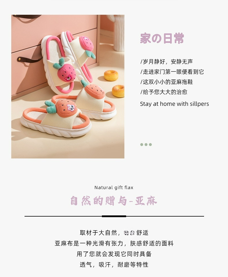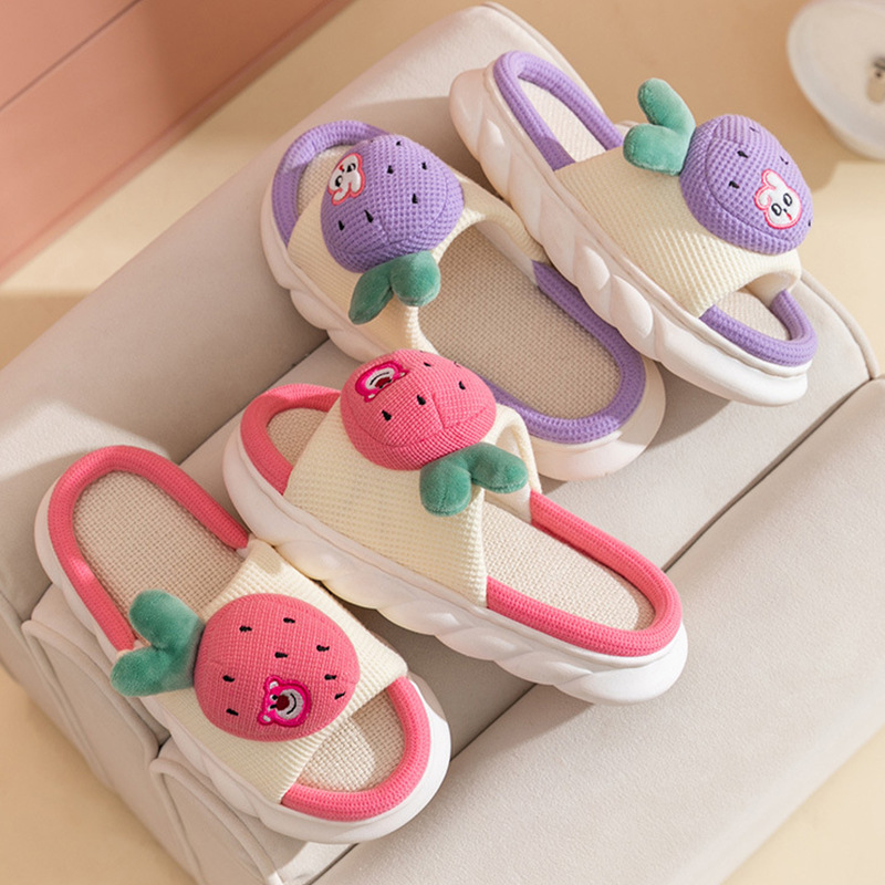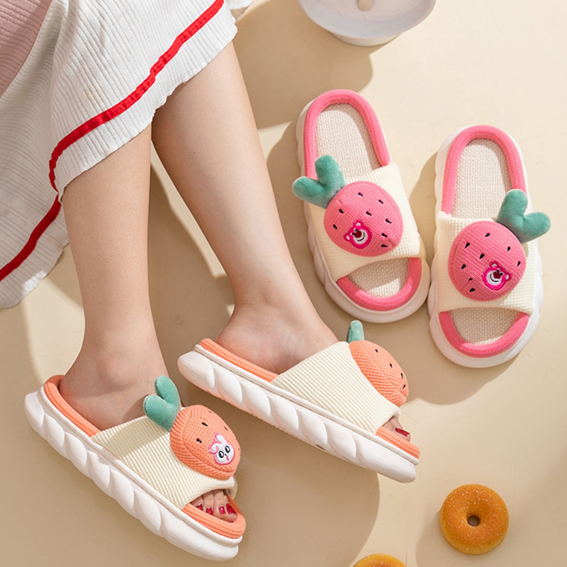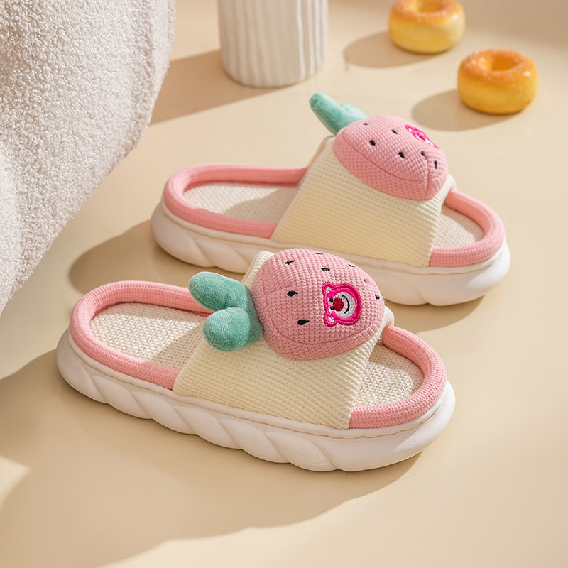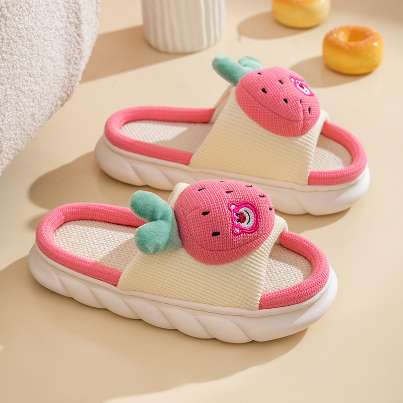 春季新款家居地板拖鞋亚麻拖鞋软底批发卡通草莓办公室静音拖鞋女