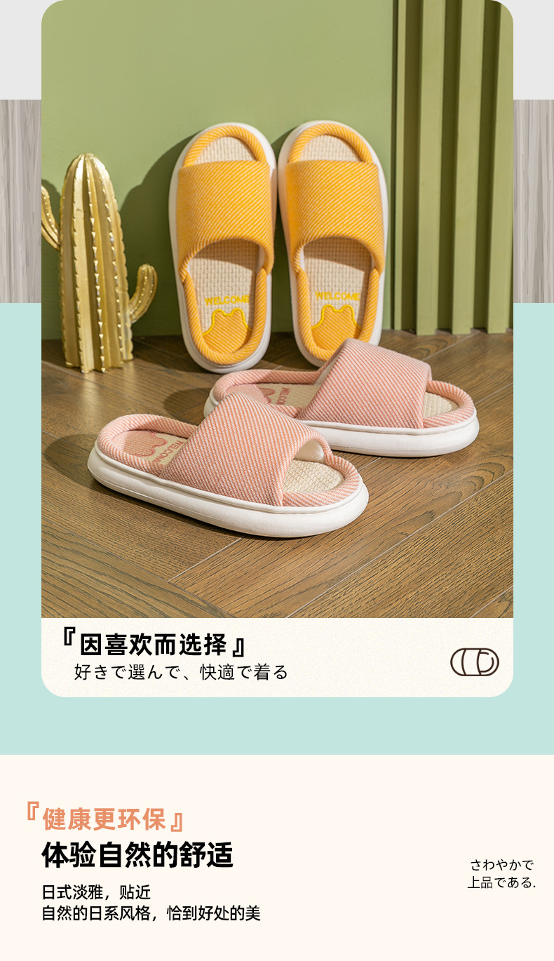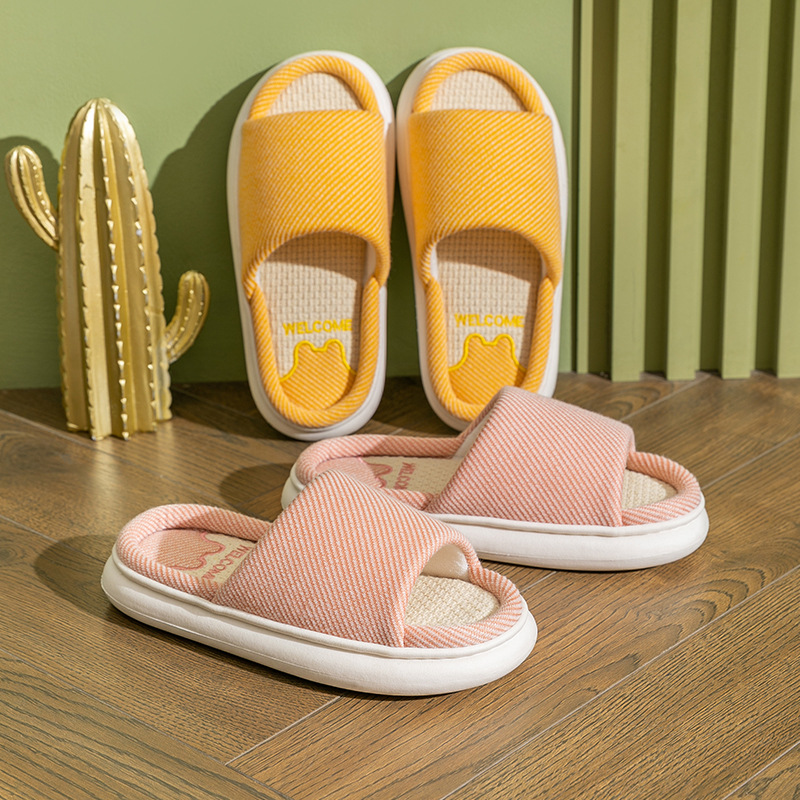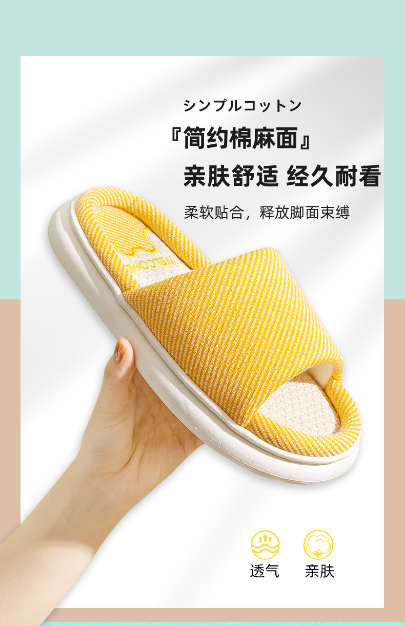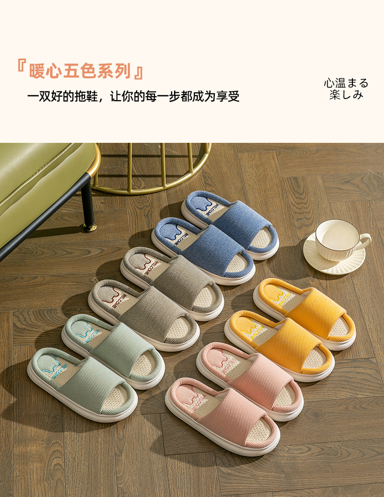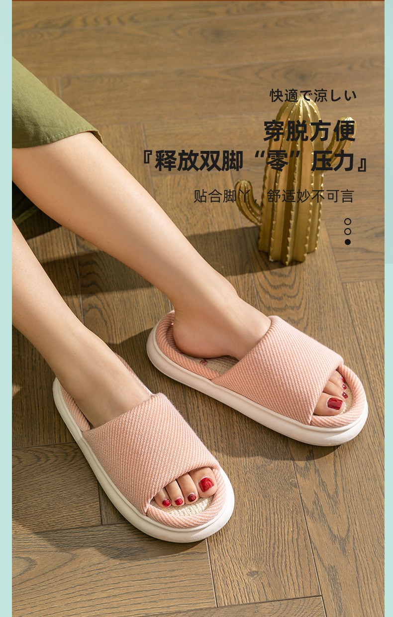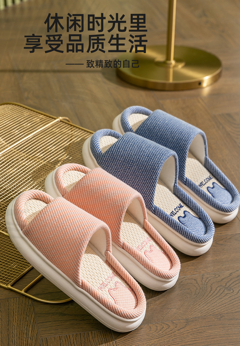 慈溪春秋简约四季亚麻拖鞋女夏情侣厚底家居木地板静音拖鞋男