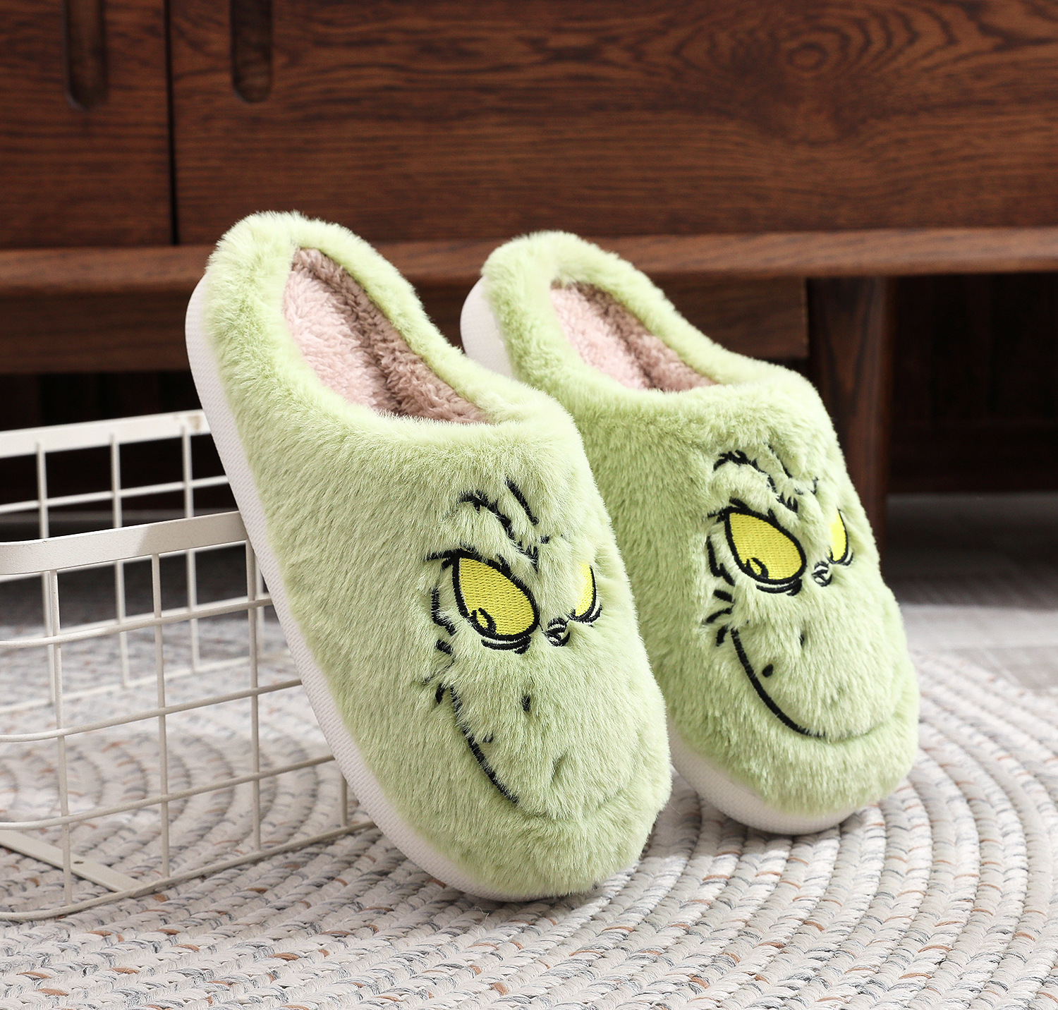 新款跨境圣诞节棉拖鞋男女居家绿毛怪格林奇冬季保暖室内毛拖grin