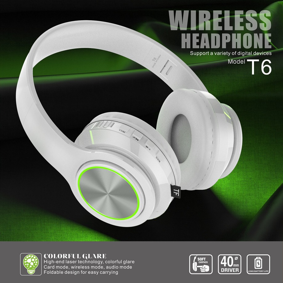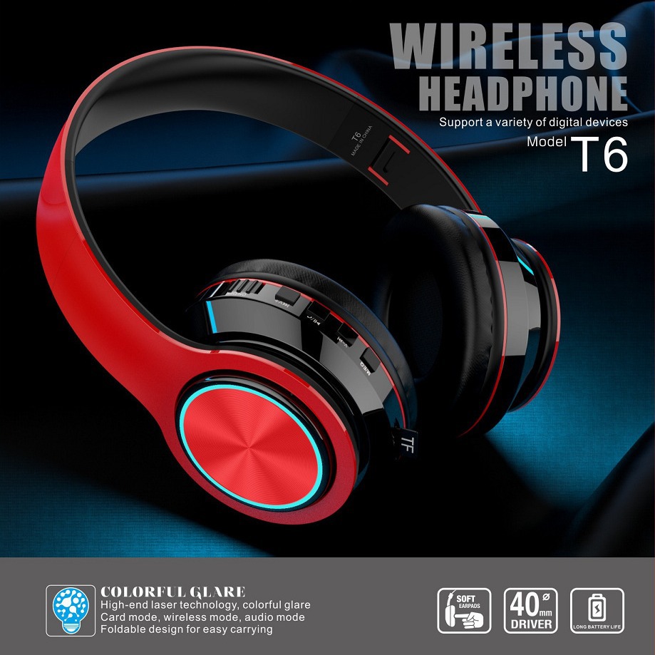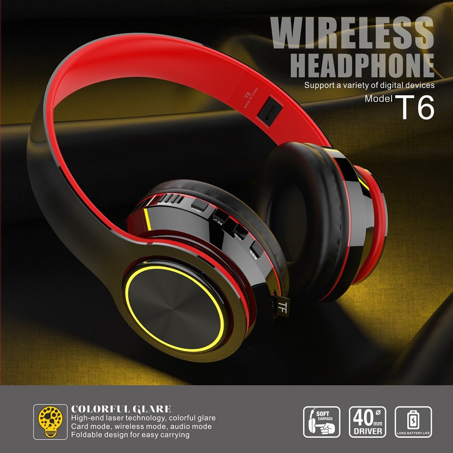 厂家批发T6蓝牙耳机头戴式FM音乐运动插卡跨境亚马逊折叠多色无线