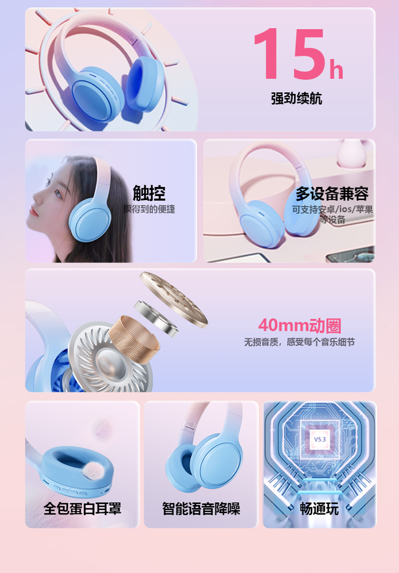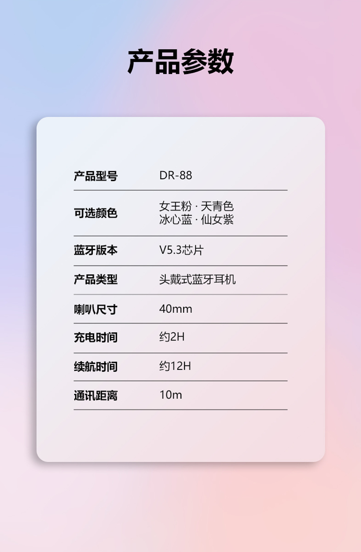 亚马逊新品DR88渐变色无线蓝牙机超长续航通话网课头戴式蓝牙耳机